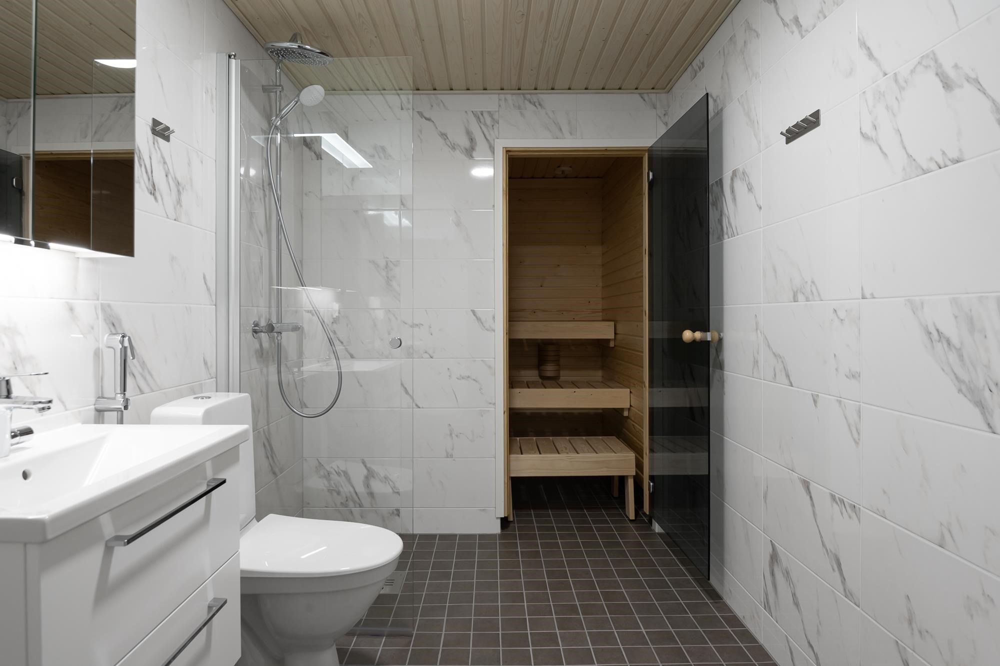 - Kylpyhuoneessa suihku (suihkunurkka tai suihkuseinä), valaisinpeilikaappi, allaslaatikosto. Pesukoneliitäntä, tilavaraus pyykinpesukoneelle ja kuivausrummulle. Mukavuuslattialämmitys (sähkö huoneiston sähköstä). Kiinteät valaisimet. Huoneistoissa missä sauna, sähkökiuas ja kokolasiovi.