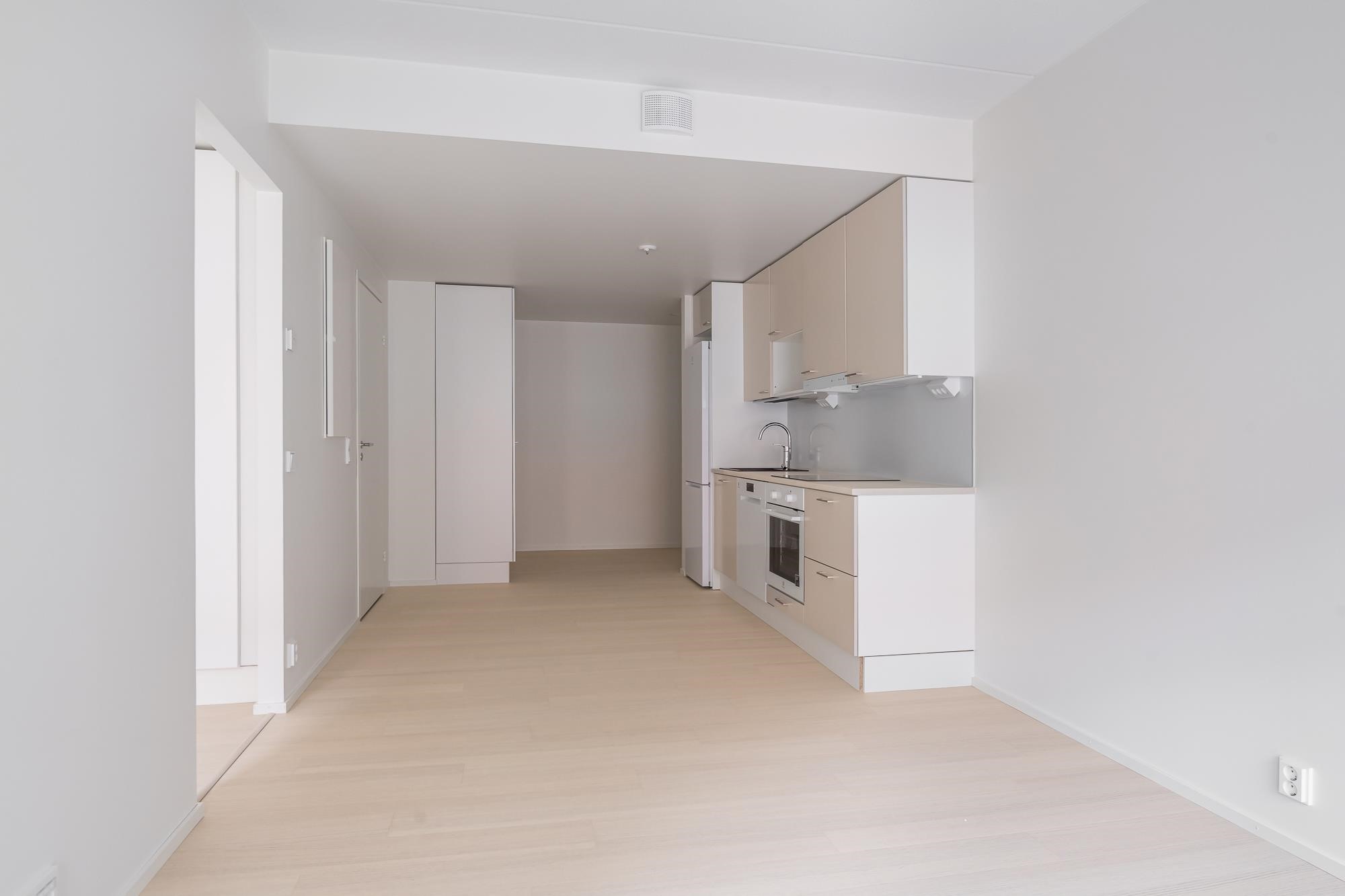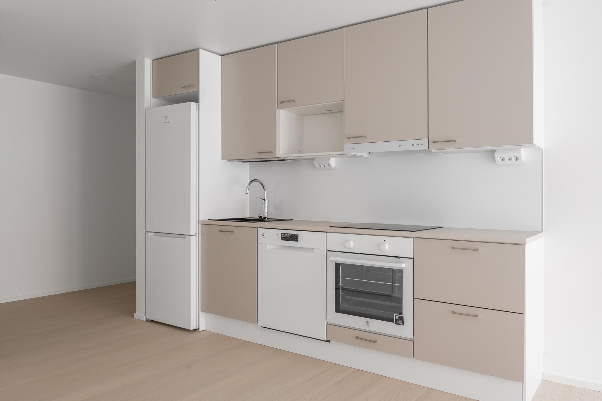 - Jääkaappipakastin, induktioliesitaso, liesikupu, astianpesukone, kaapistot, kiinteät valaisimet. Tilavaraus mikroaaltouunille.Työpöytätasot ovat laminaattipintaisia, välitilassa laminaatti. Keittiön altaat ovat komposiittia ja tasoon upotettuja. Huoneiston koosta riippuen liesitaso Domino tai 60 cm, astianpesukone 45 cm tai 60 cm.