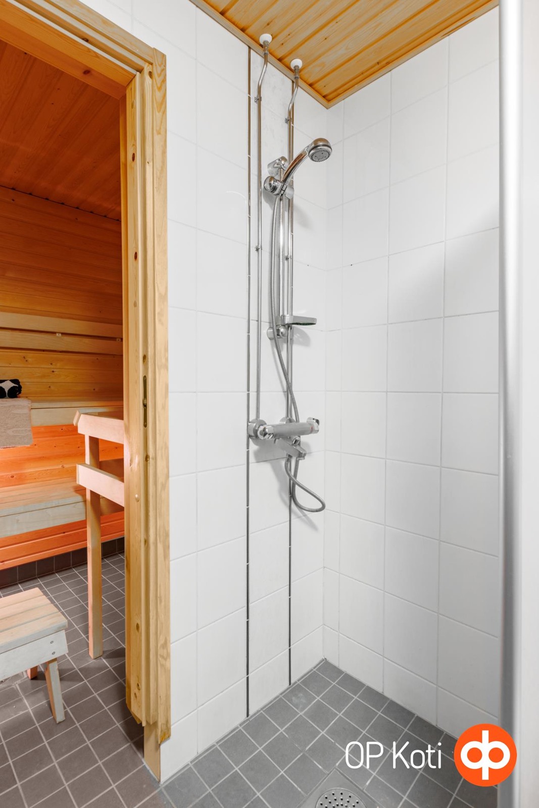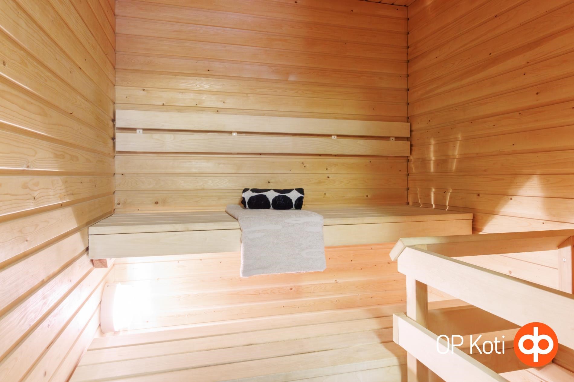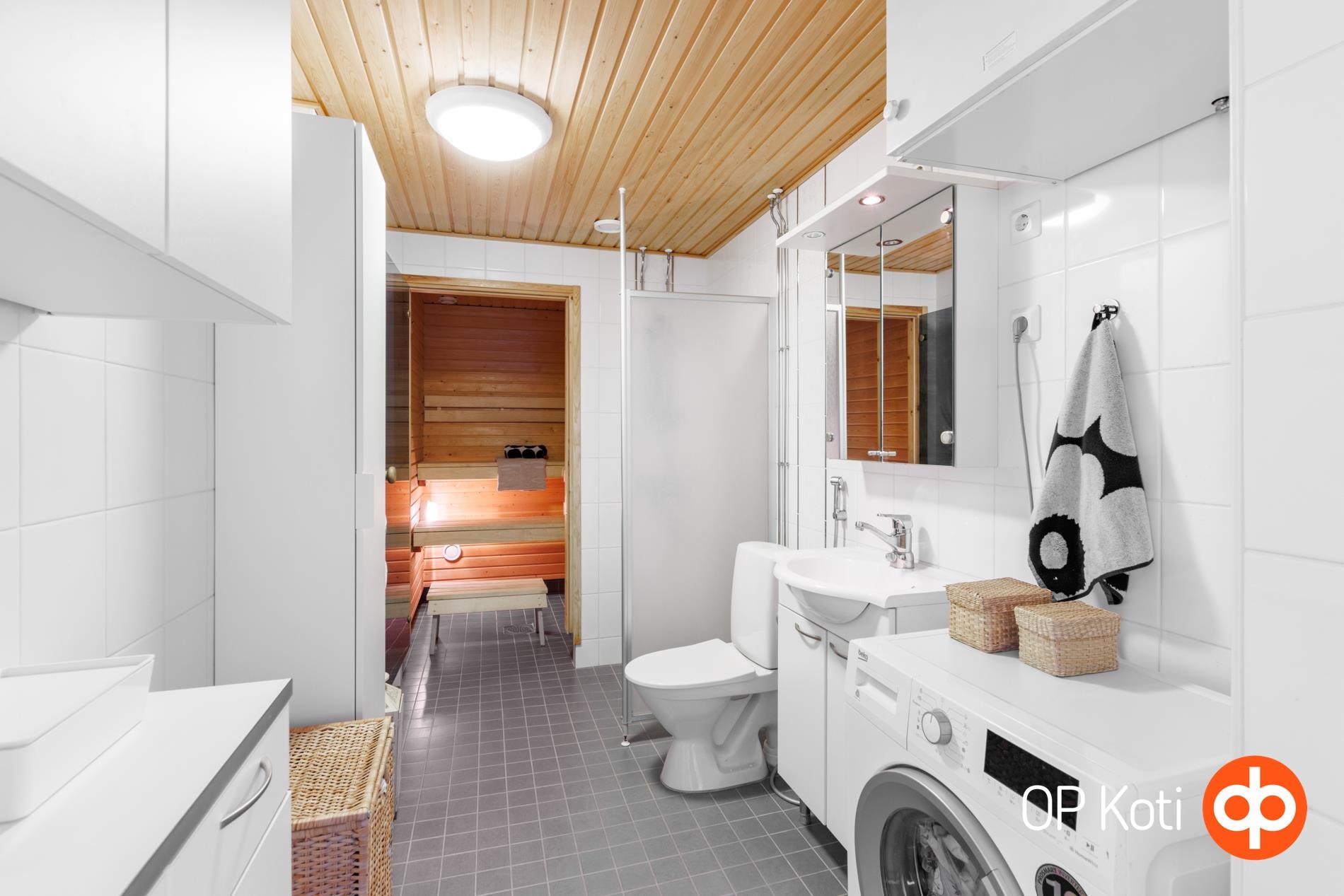 - Sauna, sähkökiuas, kylpyhuone, suihku, suihkuseinä, peilikaappi, kaapit, allaskaappi, pesukoneliitäntä, lattialämmitys, kiinteät valaisimet. Yläkaappi