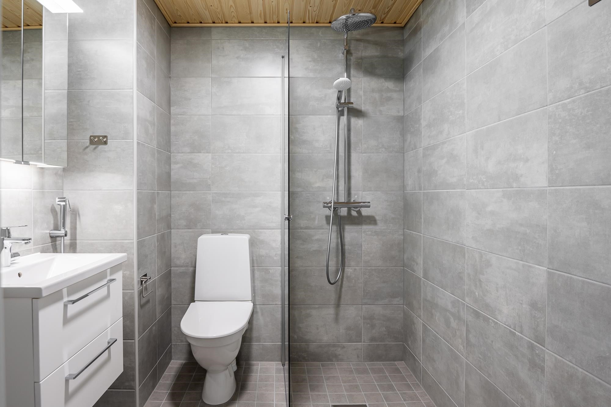 - Kylpyhuoneessa suihku (suihkunurkka tai suihkuseinä), valaisinpeilikaappi, allaslaatikosto. Pesukoneliitäntä, tilavaraus pyykinpesukoneelle ja kuivausrummulle. Mukavuuslattialämmitys (sähkö huoneiston sähköstä). Kiinteät valaisimet. Huoneistoissa missä sauna, sähkökiuas ja kokolasiovi.