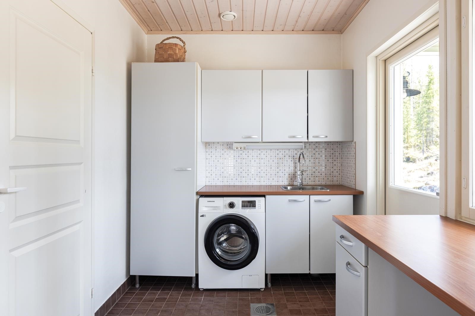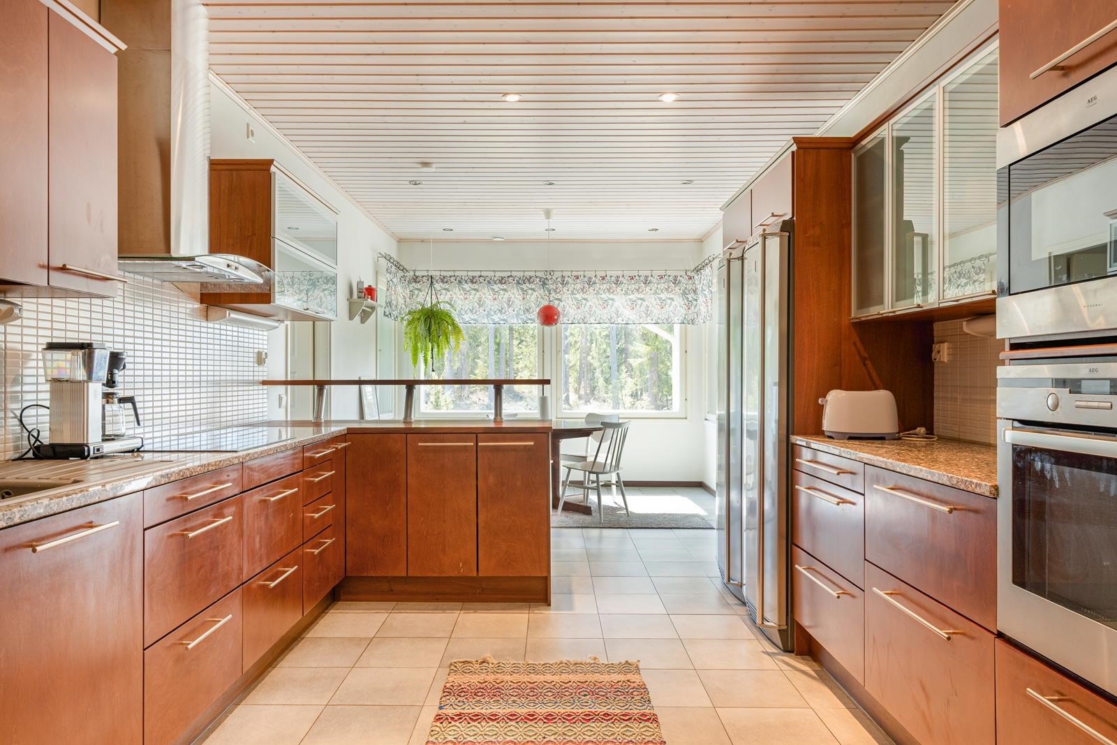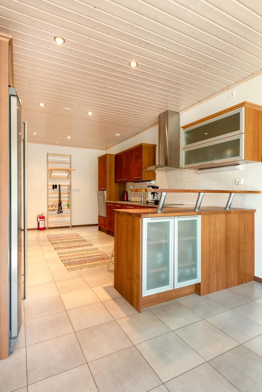 - Jääkaappi, pakastekaappi, erillisuuni, induktioliesi, liesituuletin, mikroaaltouuni, astianpesukone, kaapistot, pöytätasojen materiaali osittain kivitasot, osittain puutasot.