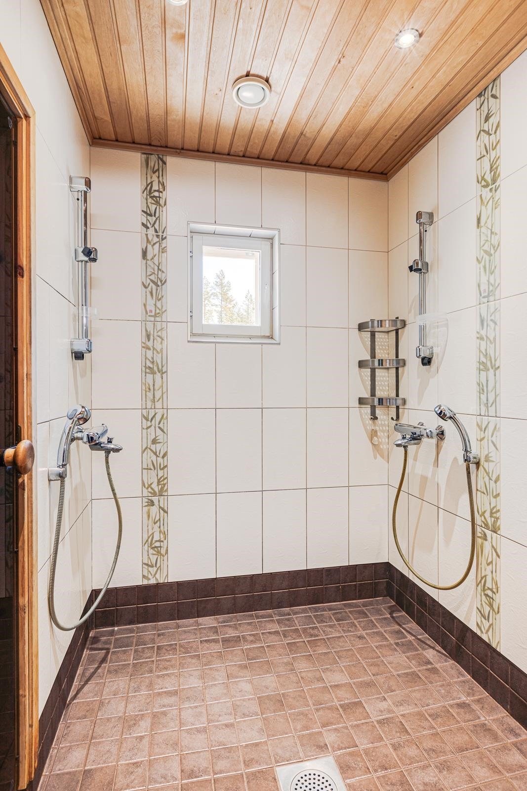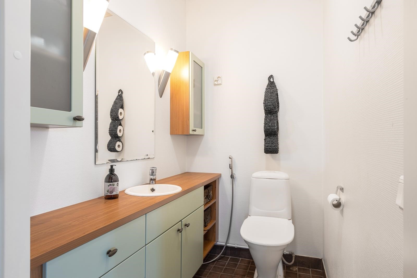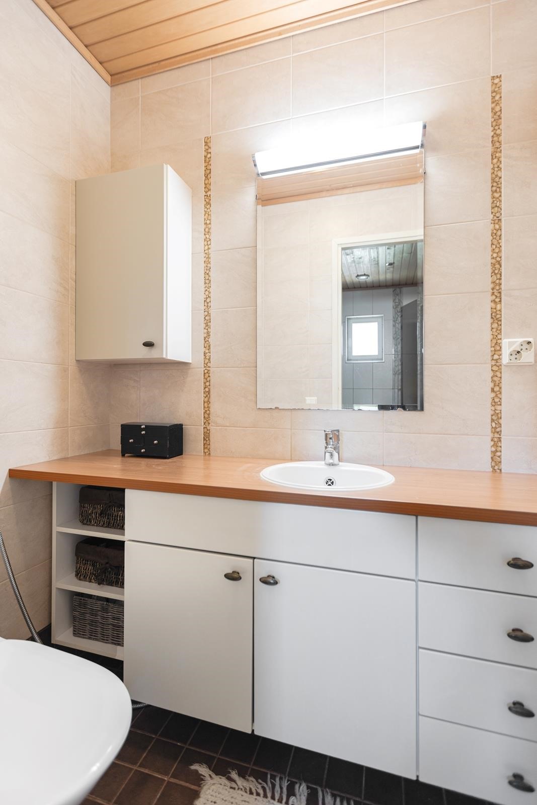 - Sauna, sähkökiuas, kylpyhuone, erillinen wc 2 kpl, suihku, peilit, kaapit, pesukoneliitäntä, lattialämmitys koko talossa, kiinteät valaisimet.