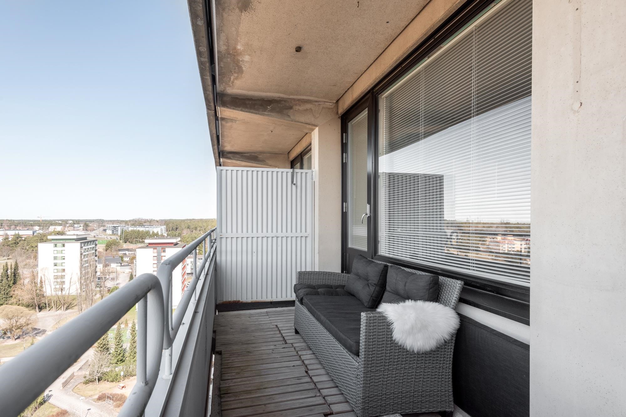 Asunnon sydän on tilava olohuone, joka jatkuu saumattomasti harvinaisen leveälle, avoimelle parvekkeelle. Parveke ulottuu sekä olohuoneen että makuuhuoneen mittaiseksi ja toimii kesäisin täydellisenä paikkana aamukahville, ilta-auringolle tai rauhoittaville tuokioille vihreiden puistojen ylle avautuvassa horisontissa.