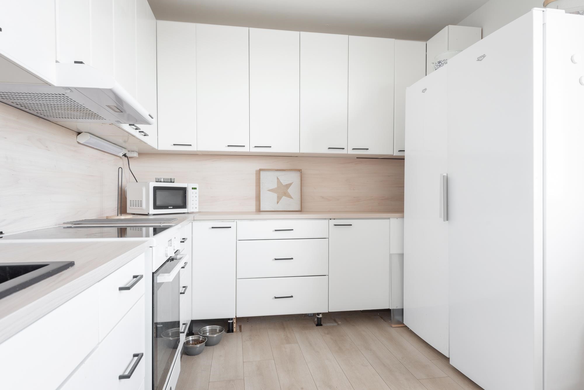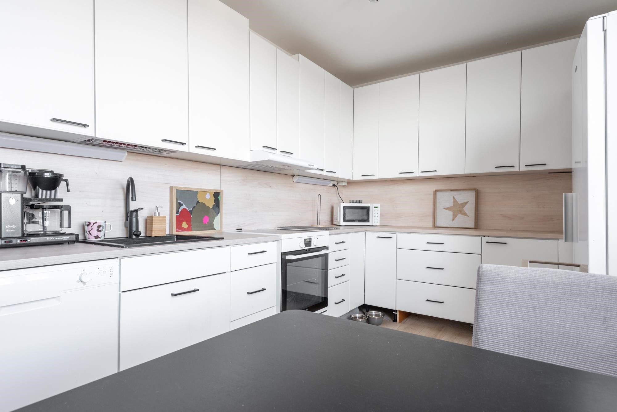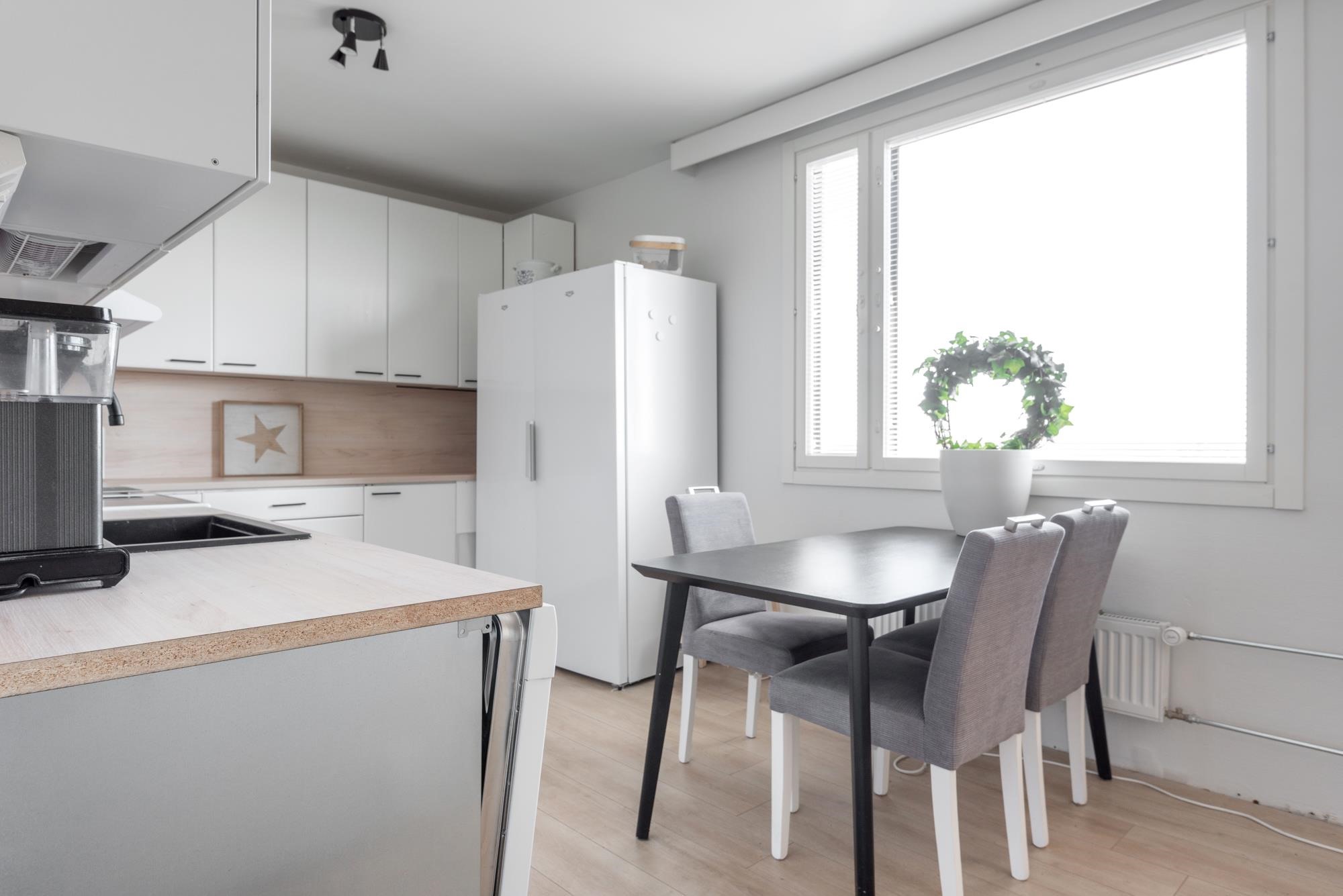 Keittiössä kokin unelmat käyvät toteen: käytössäsi on ammattilaistasoinen liesi sekä erilliset, tilavat jää- ja pakastinkaappi sitä arjen toiminnallisuutta unohtamatta.