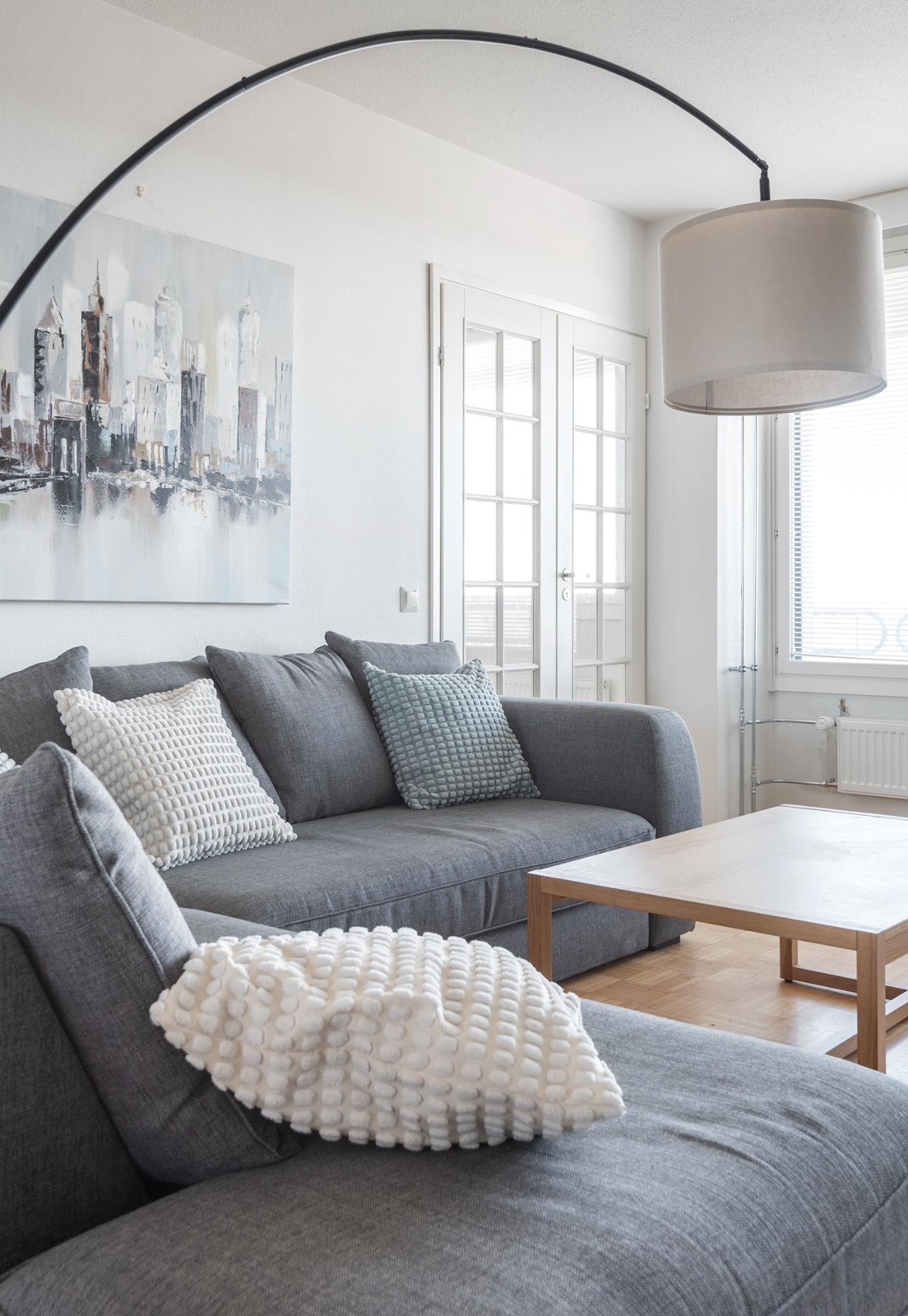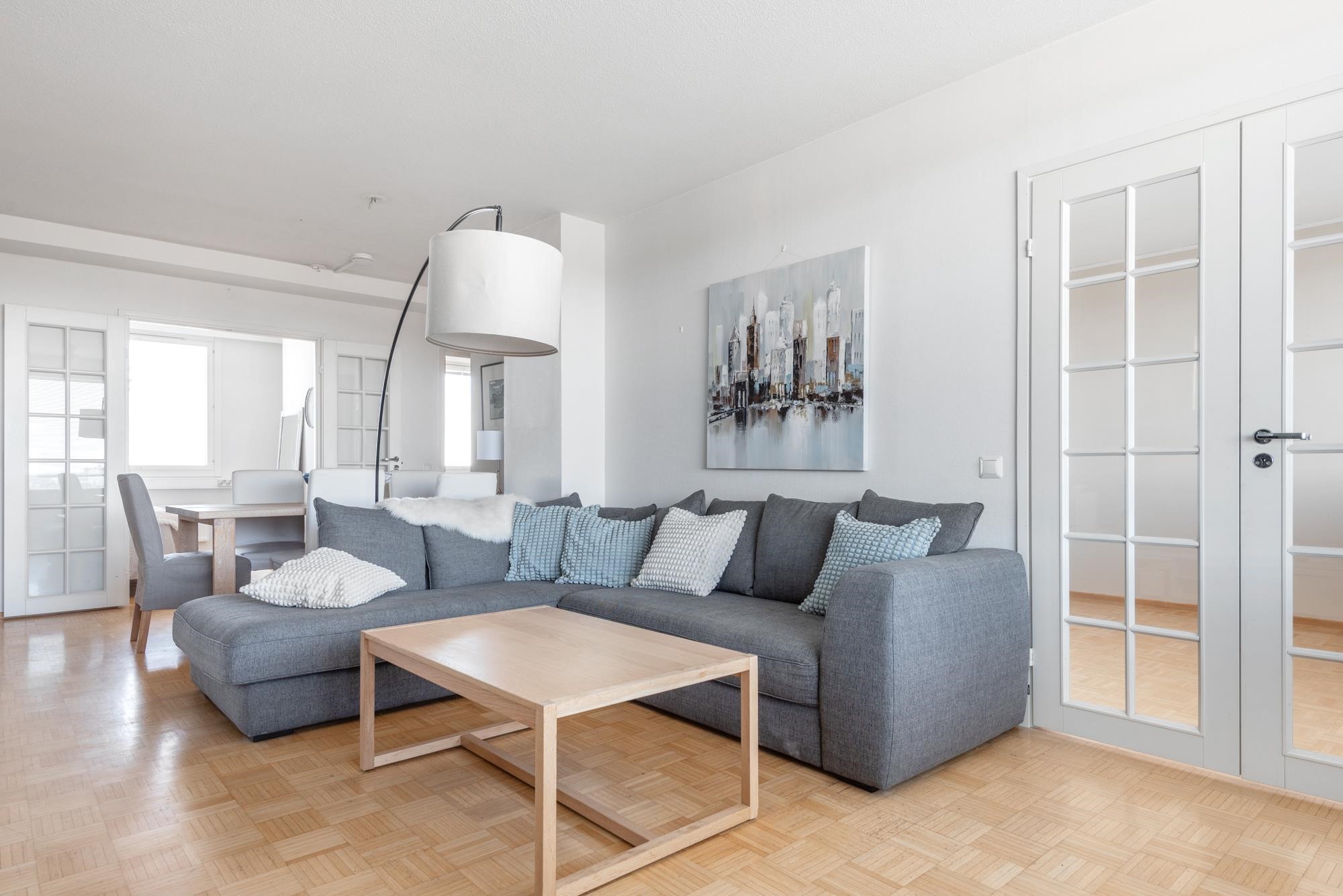 Huoneiston neljä huonetta, erillinen keittiö, kylpyhuone ja oma sauna muodostavat kokonaisuuden, jossa on helppo viihtyä. Selkeä pohjaratkaisu, harmoniset vaalean ja harmaan sävyt tekevät tiloista ajattoman kauniit ja helposti muunneltavat.
