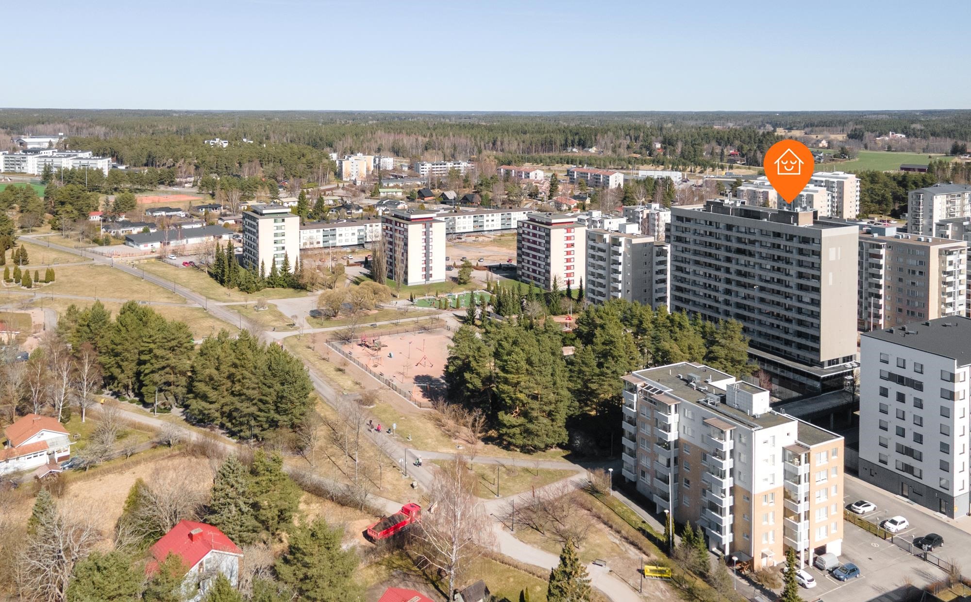 Sijainti ei juuri paremmaksi voisi muuttua. Tämä koti sijaitsee aivan Raision keskustassa, palvelujen keskipisteessä mutta silti rauhassa. Neuvola löytyy samasta rakennuksesta, ruokakaupat, apteekki, pankit ja terveyspalvelut ovat kaikki vain muutaman sadan metrin säteellä. Julkinen liikenne kulkee läheltä vain noin 200 metrin päästä pääset sujuvasti mm. Turkuun ja Naantaliin tai vaikka Myllyn kauppakeskukseen.