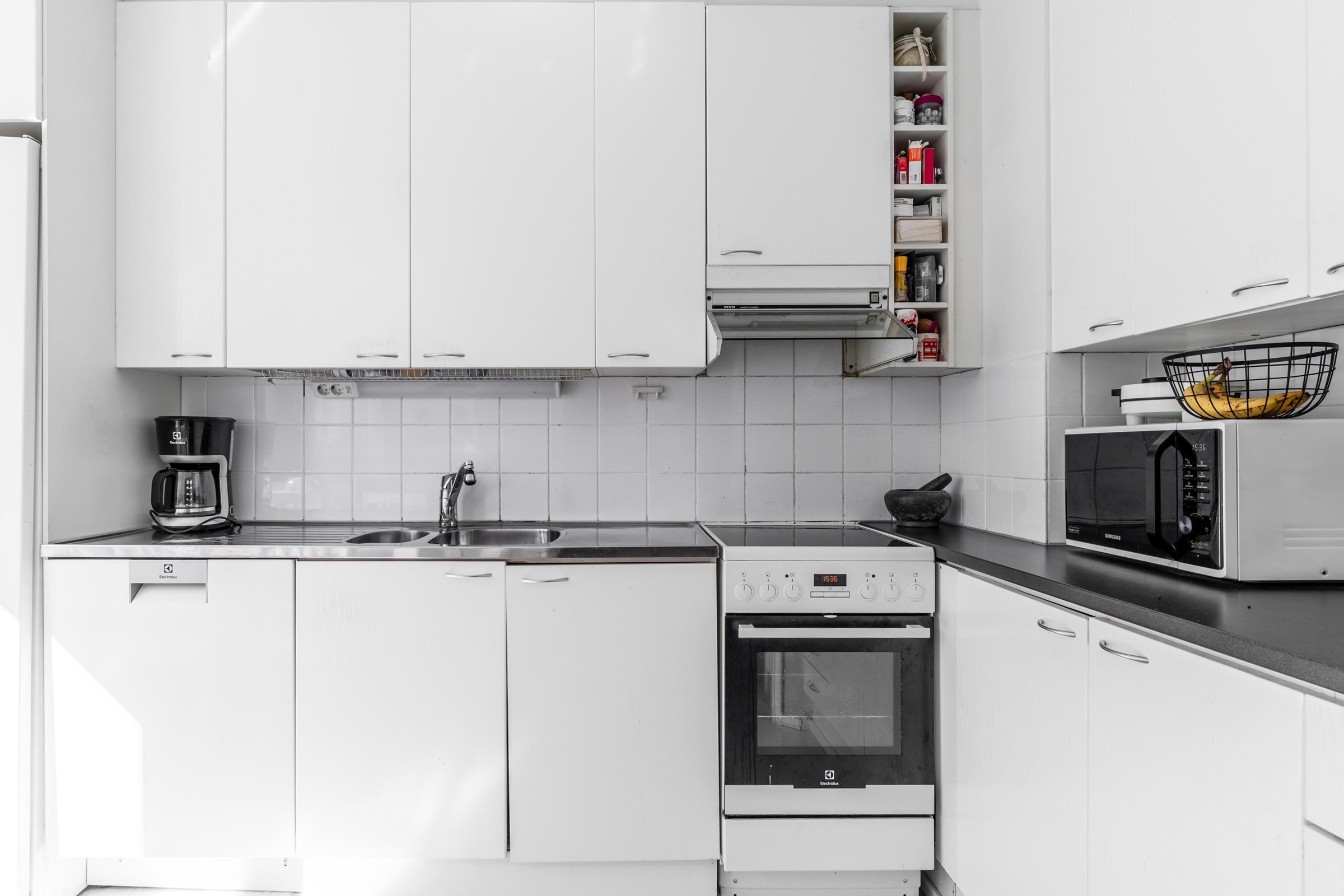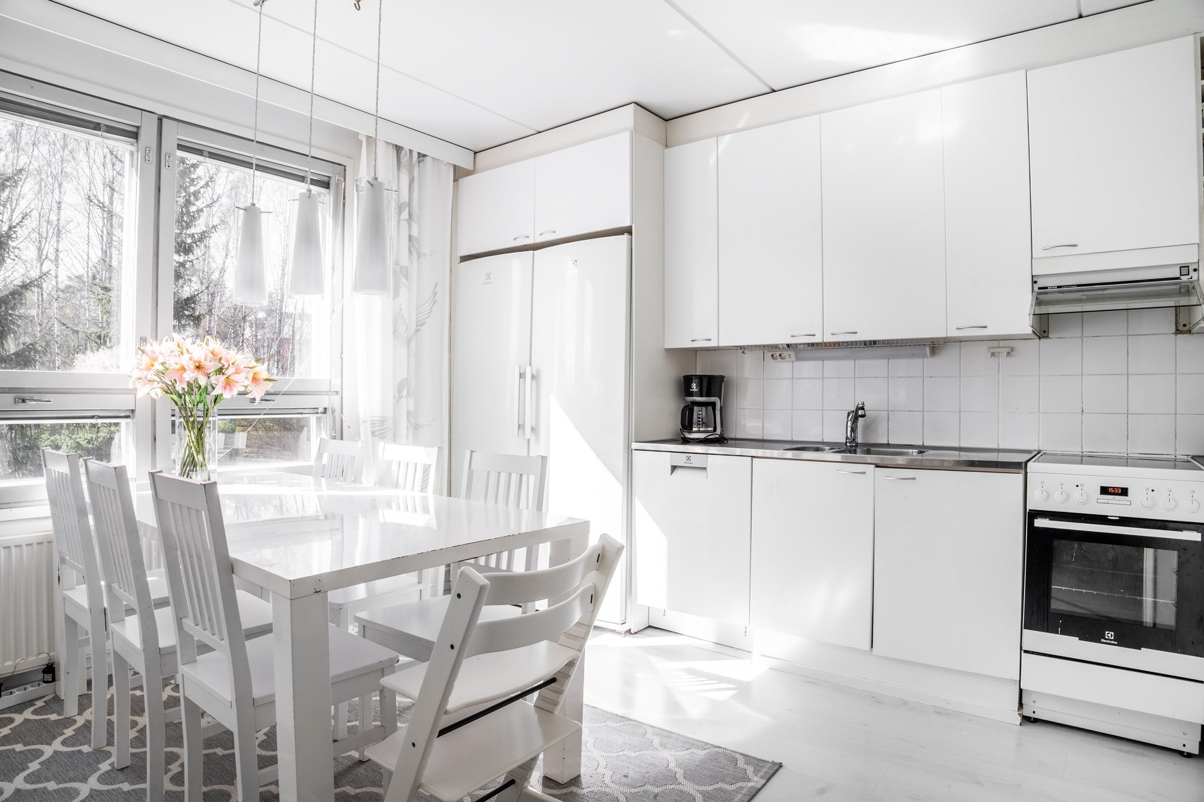 - Jääkaappi, pakastekaappi, keraaminen liesi, liesituuletin, astianpesukone, kaapistot. Keittiön ovet dc-fix kalvot laitettu 2018 Sivutaso vaihdettu laminaatti tasoon