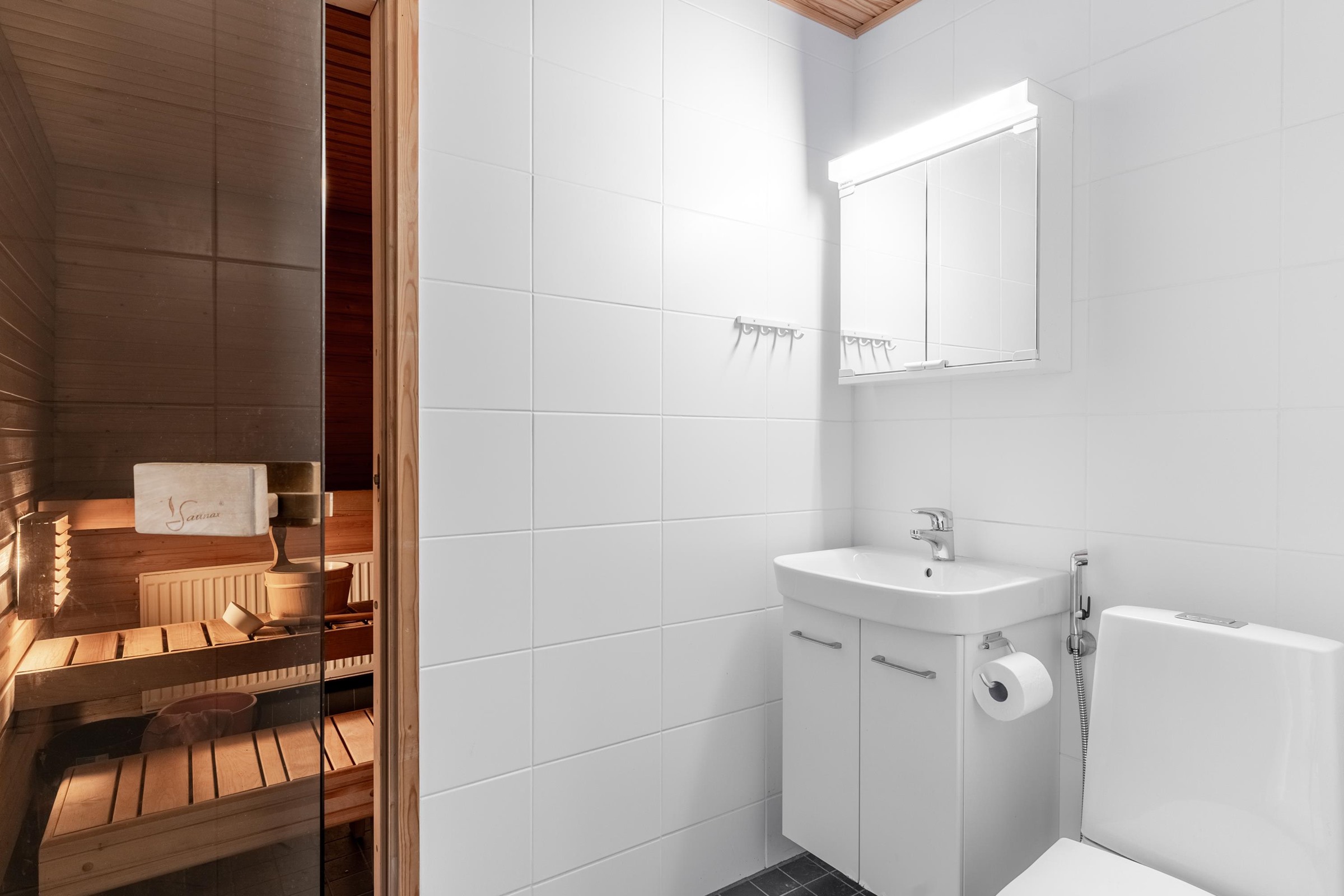- Sauna, sähkökiuas, kylpyhuone, erillinen wc, suihku, peilikaappi, allaskaappi, pesukoneliitäntä wc:ssä, lattialämmitys, kiinteät valaisimet. Remontoitu 2018 wc ja kylpyhuone