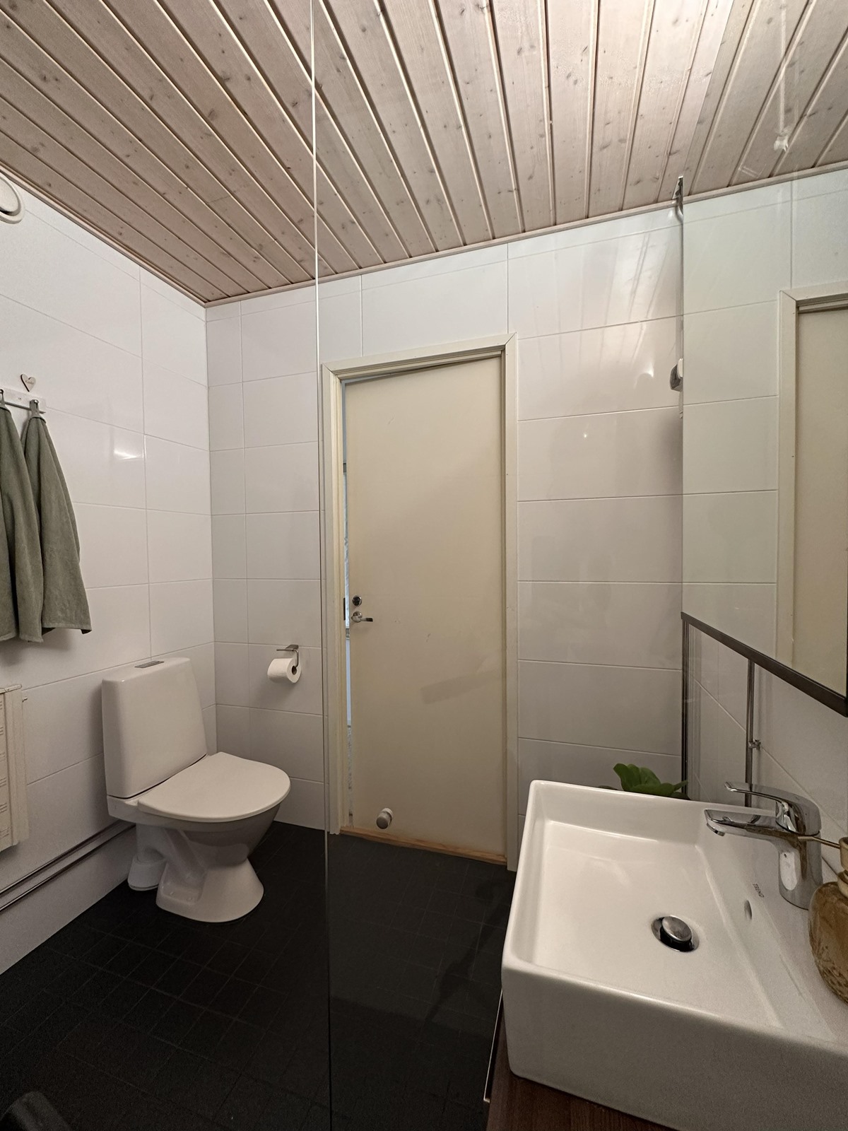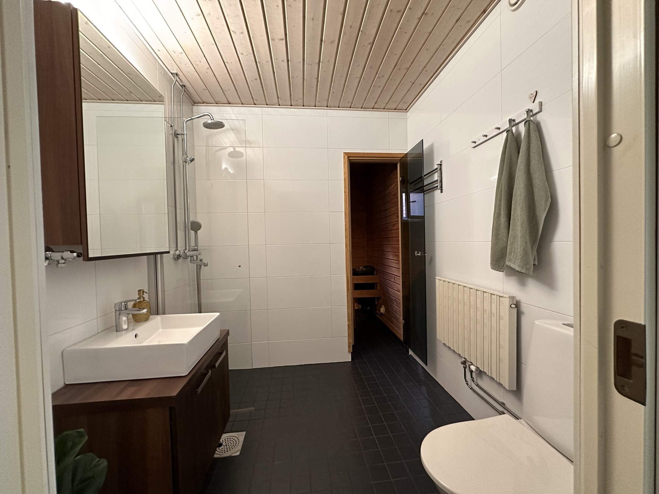 - Sauna, sähkökiuas, kylpyhuone, suihku, suihkuseinä, peilikaappi, allaskaappi, pesukoneliitäntä, kiinteät valaisimet.