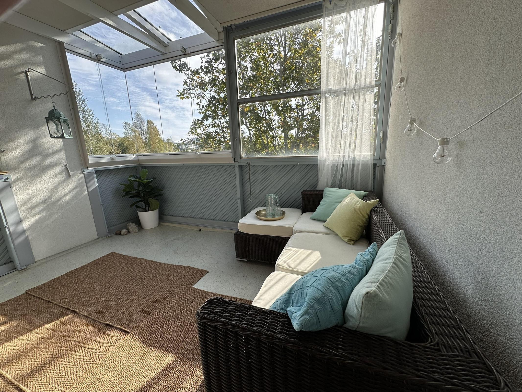 Avara kolmio omalla saunalla ja tilavalla lasitetulla parvekkeella