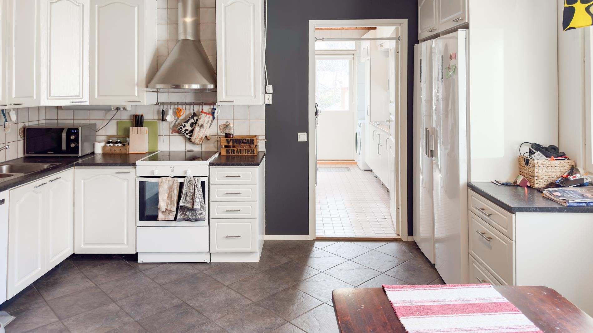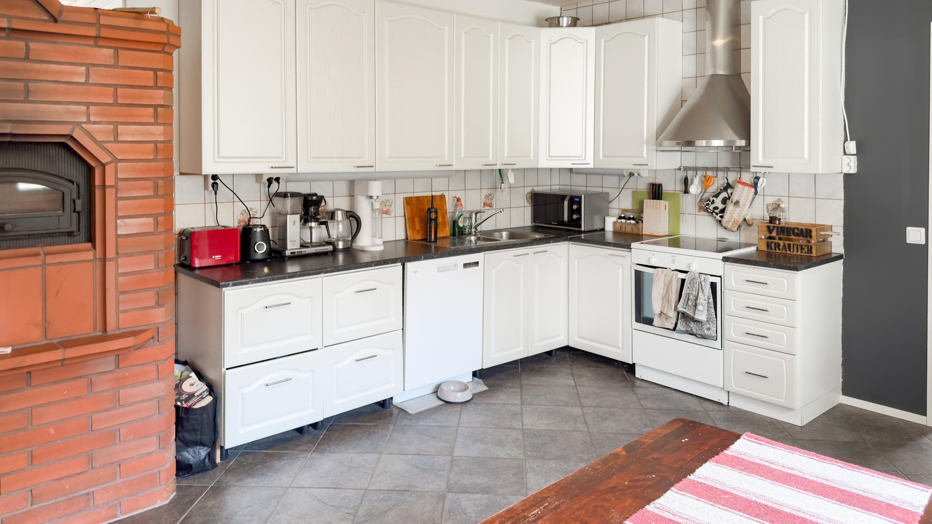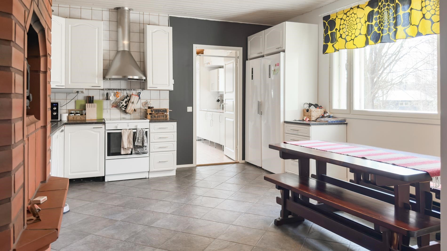 - Jääkaappi, pakastekaappi, lattialiesi, liesituuletin, leivinuuni, astianpesukone, kaapistot, kiinteät valaisimet.