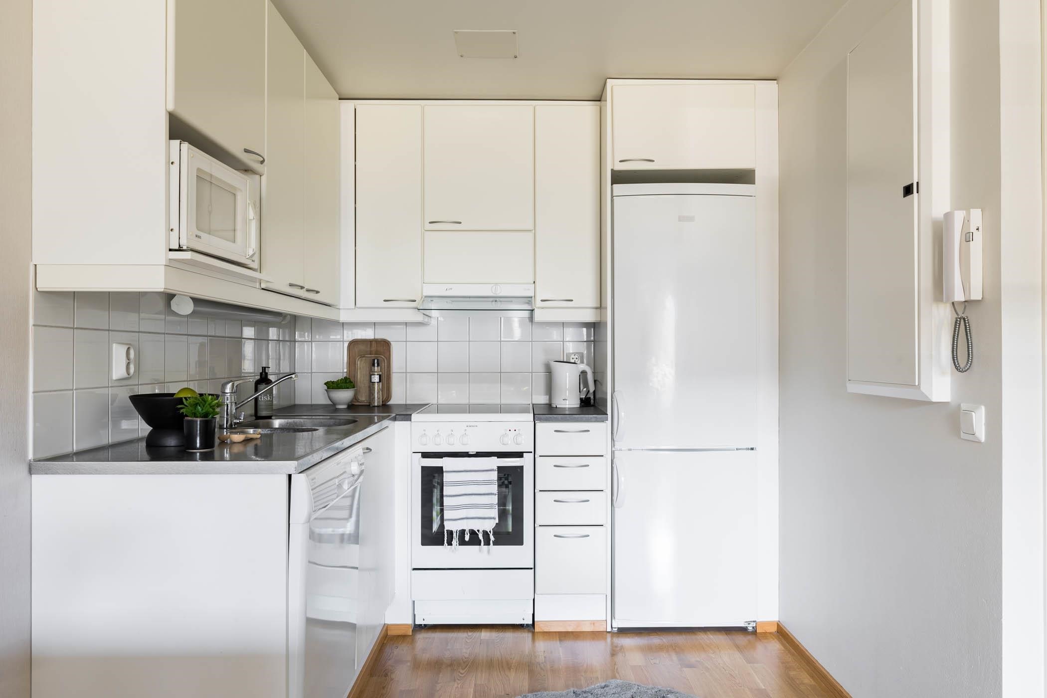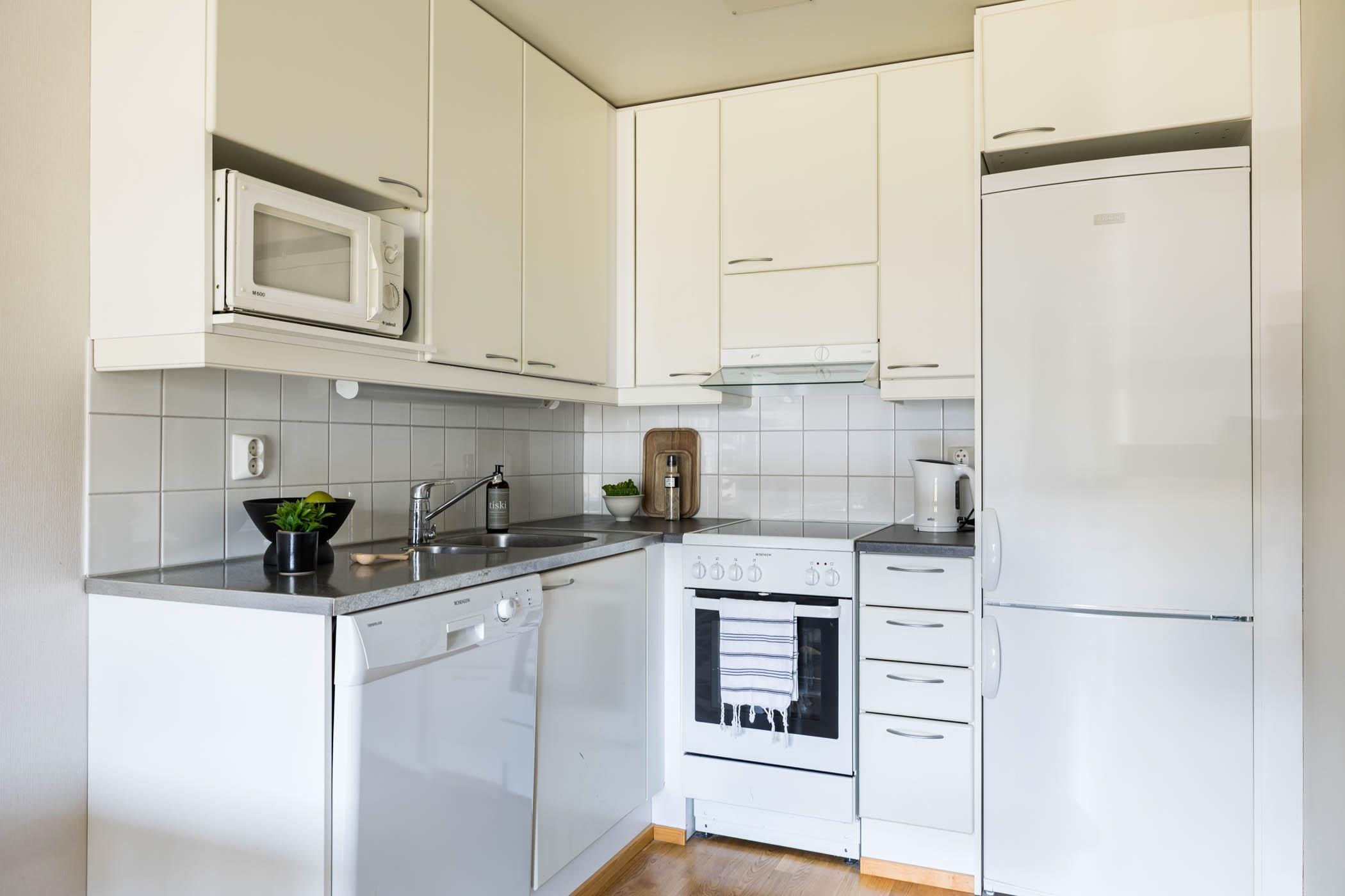- Jääkaappipakastin, keraaminen liesi, liesituuletin, astianpesukone, kaapistot, kiinteät valaisimet.