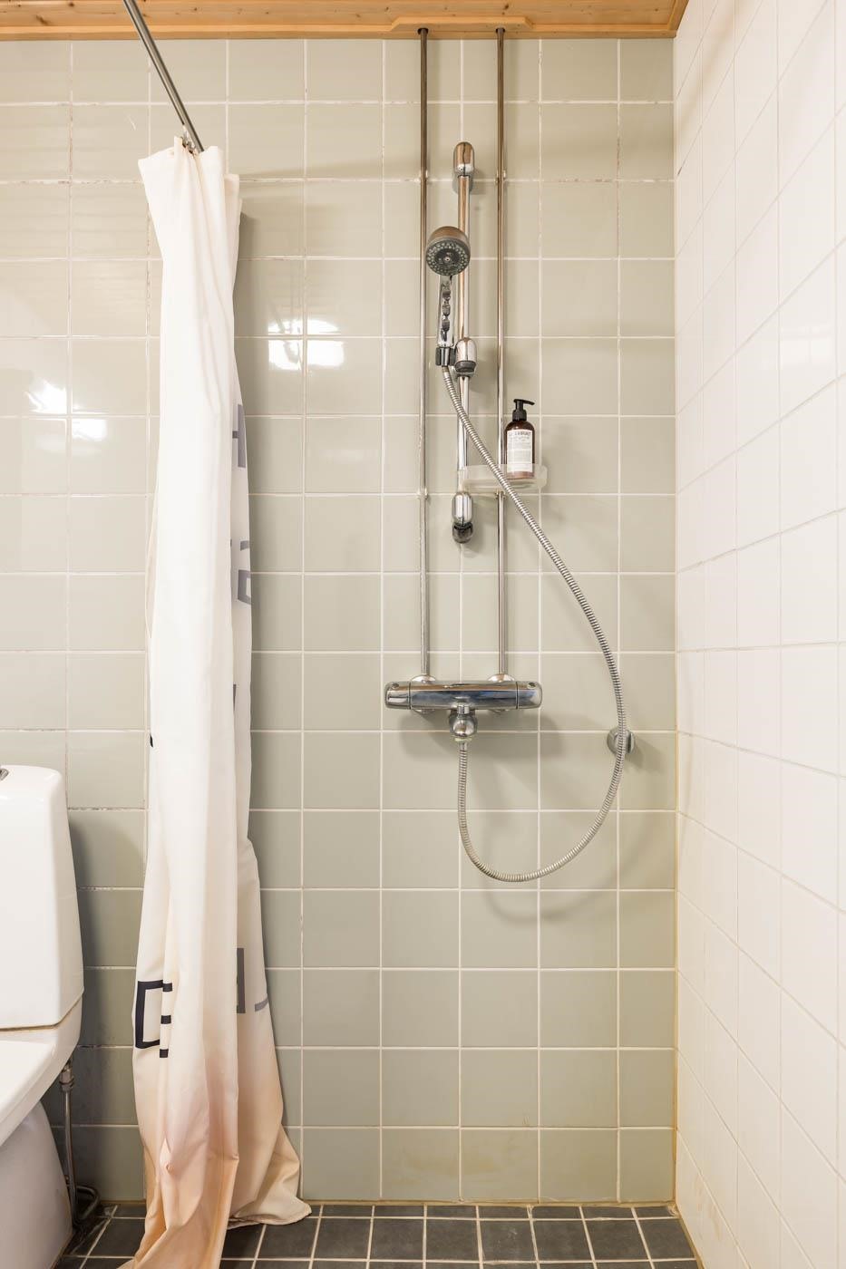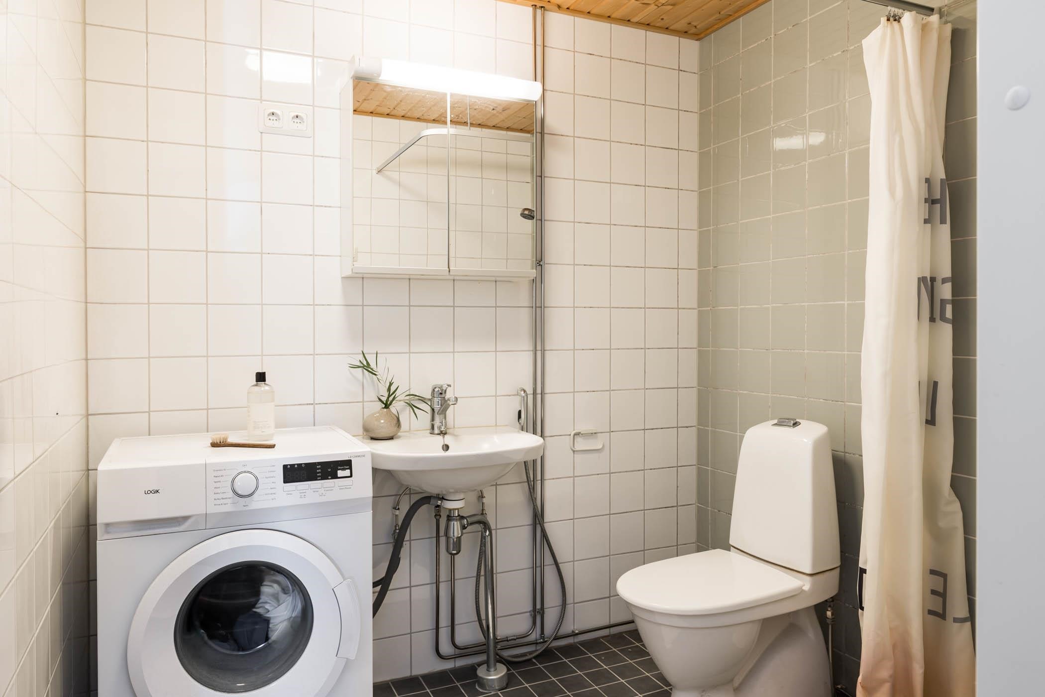 - Kylpyhuone, suihku, peilikaappi, pesukoneliitäntä, lattialämmitys, kiinteät valaisimet.
