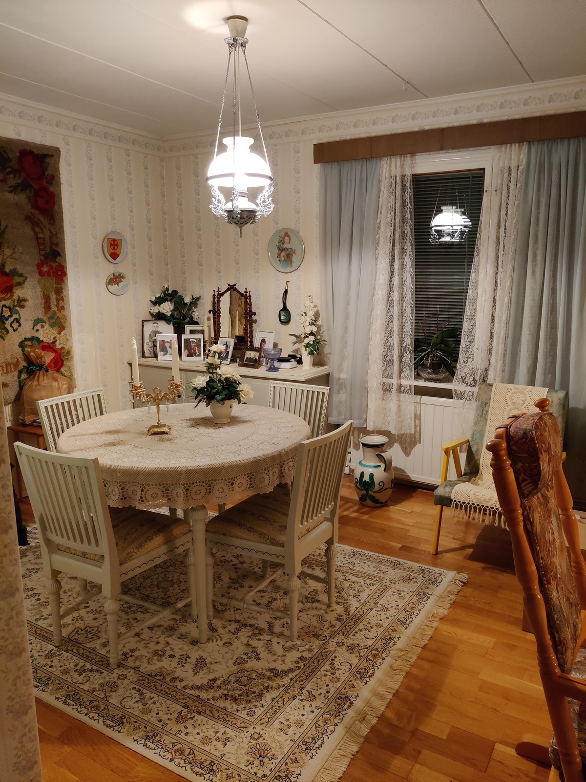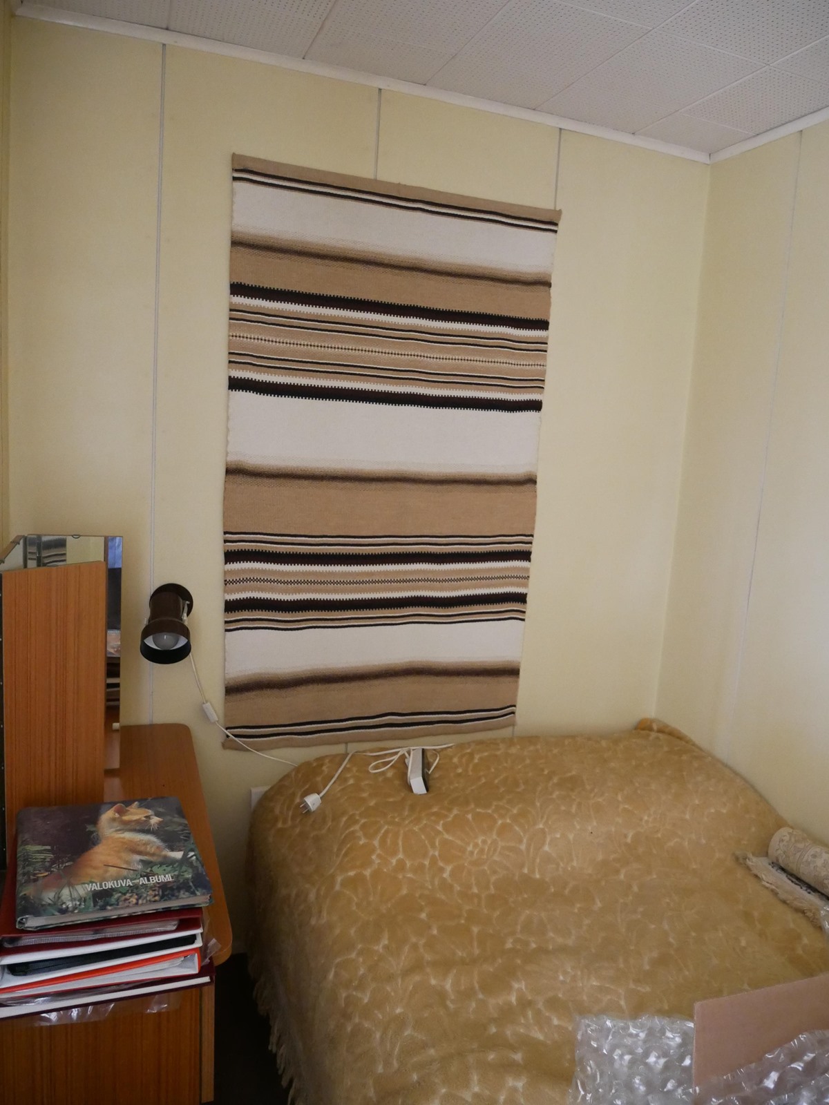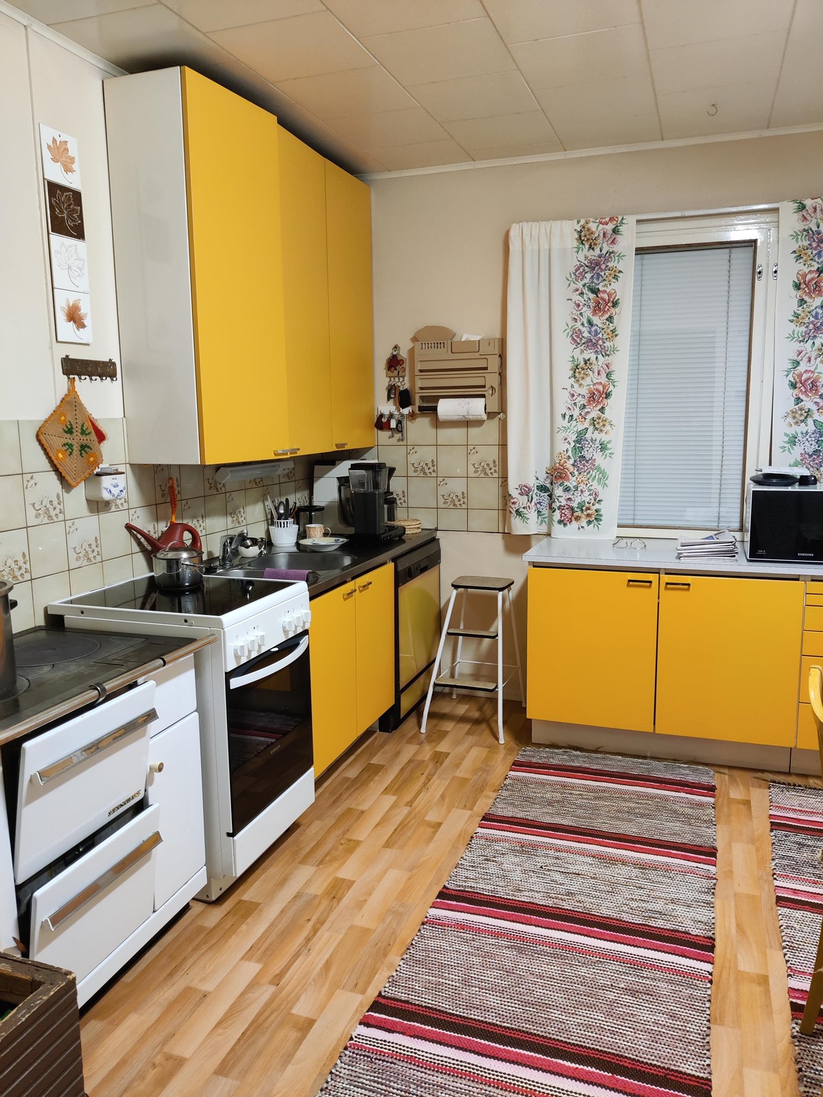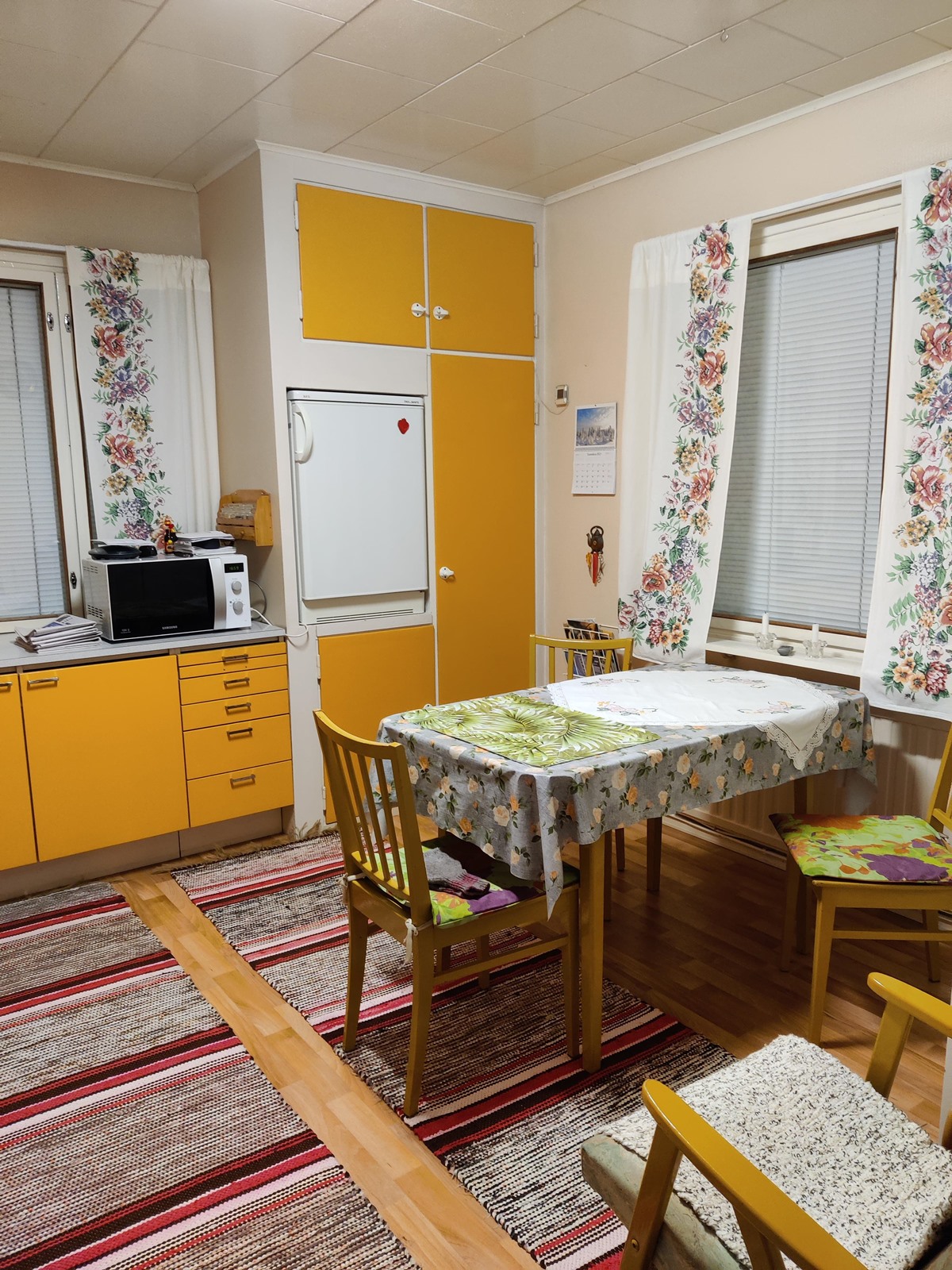 - Jääkaappi, lattialiesi, sähköliesi, kaapistot, kiinteät valaisimet, pöytätasojen materiaali Levy, Puuhella.