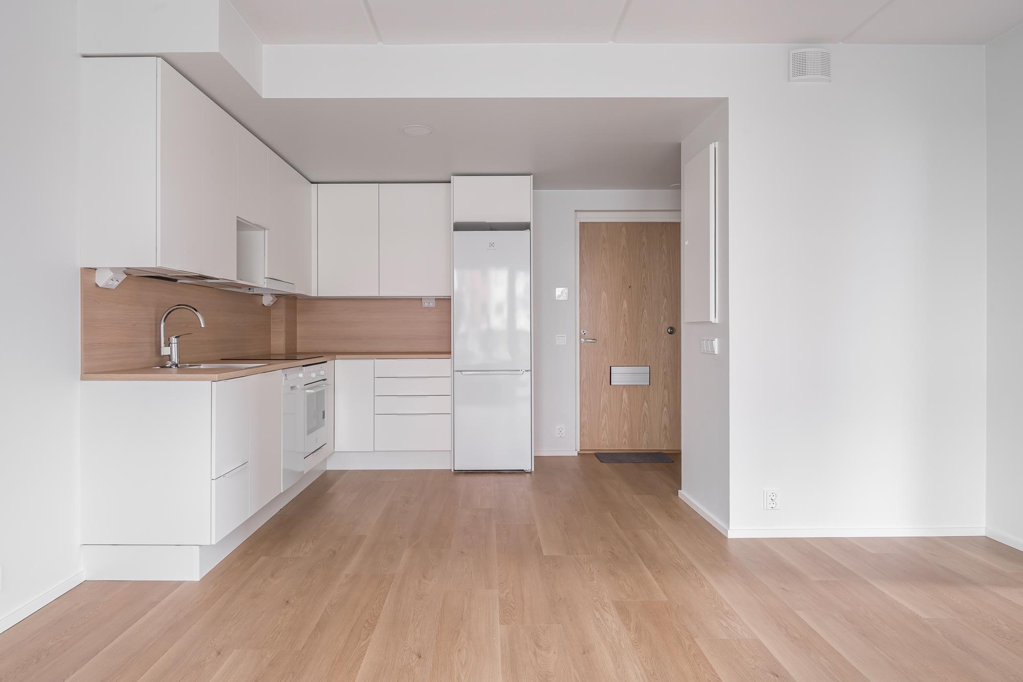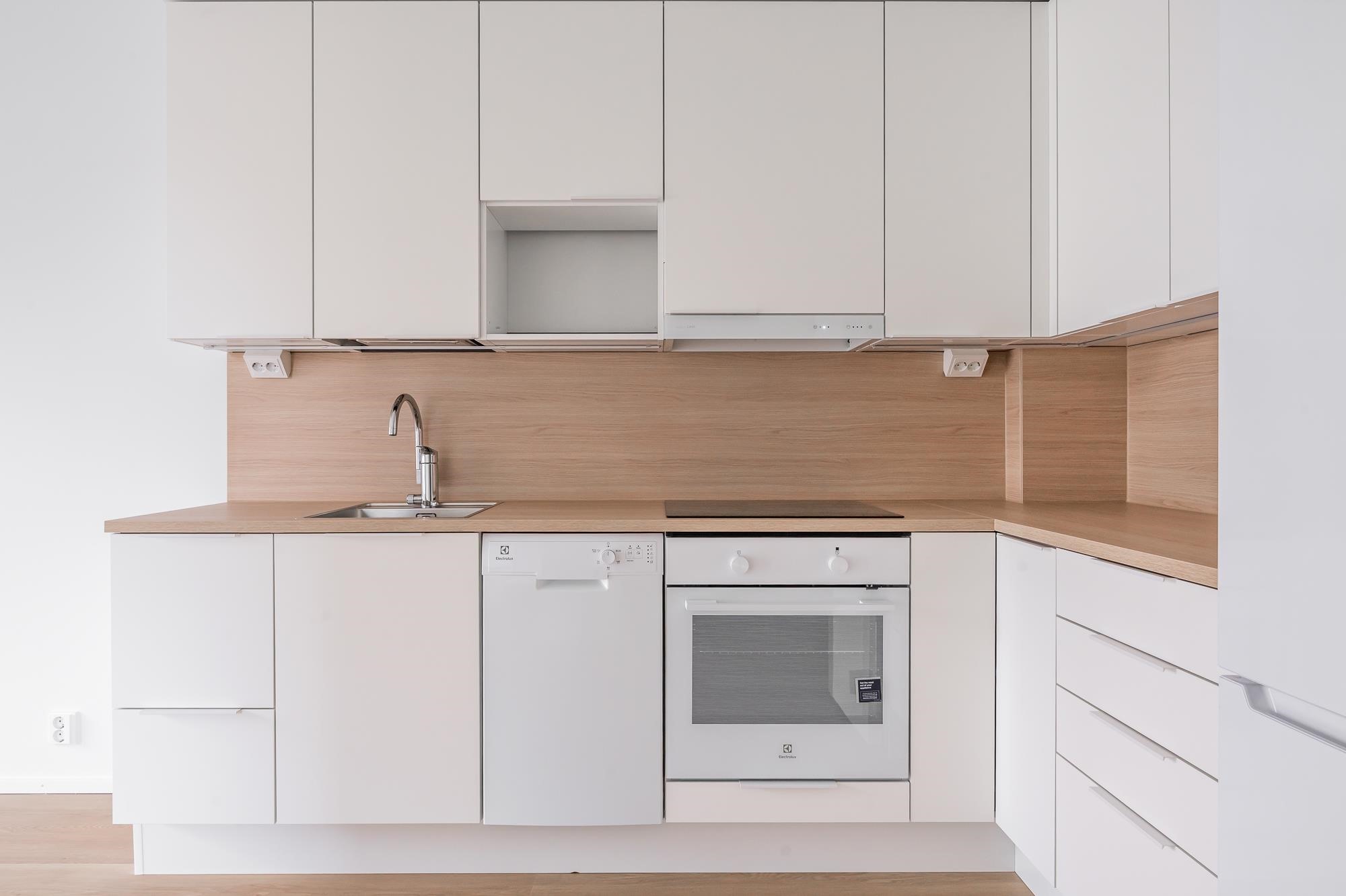 - Jääkaappipakastin, erillisuuni, induktioliesitaso, ulosvedettävä liesikupu, astianpesukone, kaapistoissa varaus mikroaaltouunille. Kiinteät valaisimet. Puustellin keittiönkaapistot, työtasot laminaattia, välitilassa välitilalevy. 83 m2 huoneistoissa erillinen jääkaappi ja pakastin.