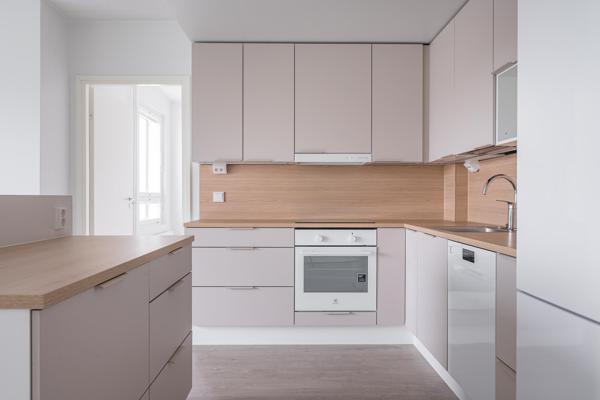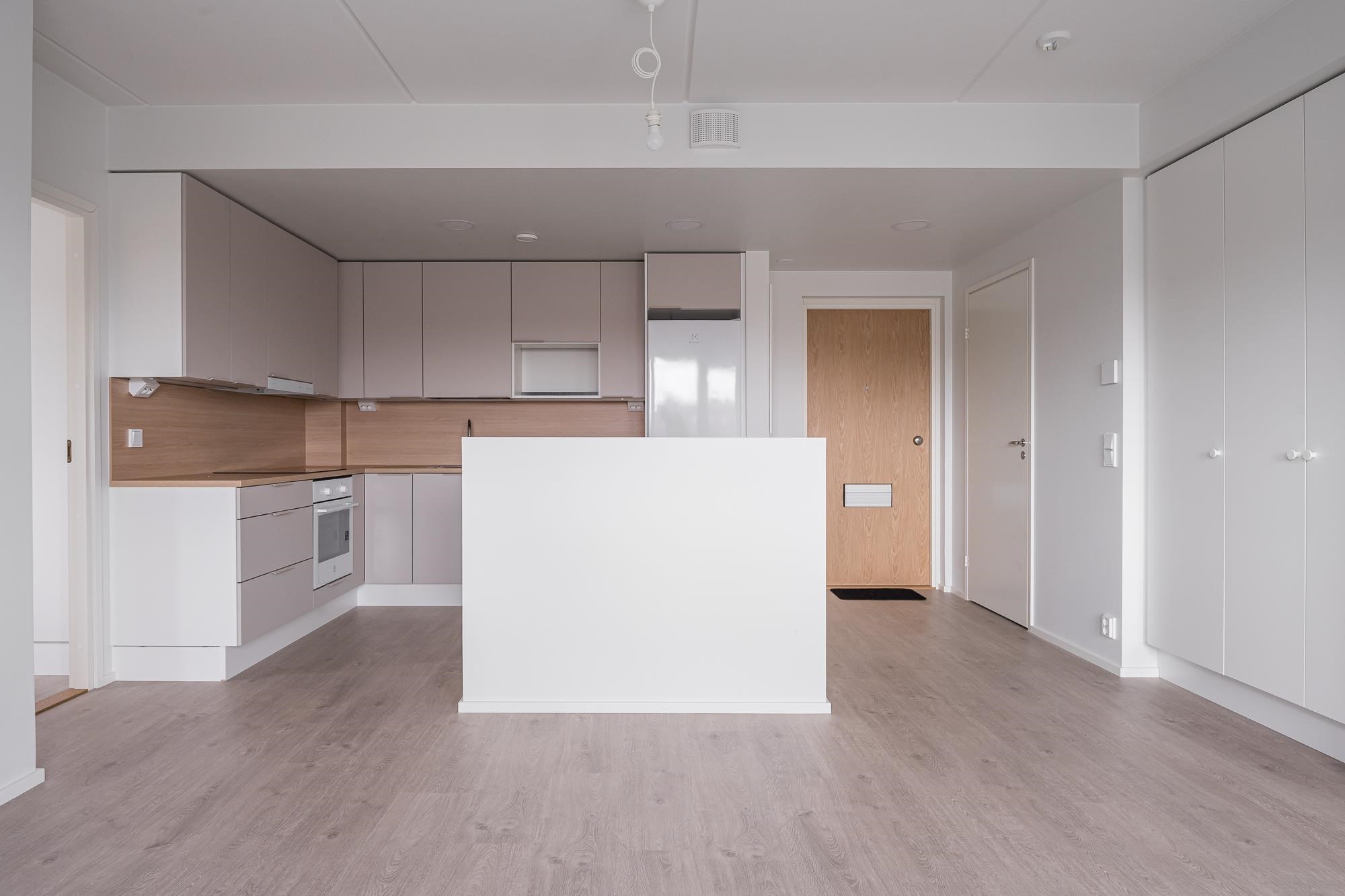 - Jääkaappipakastin, erillisuuni, induktioliesitaso, ulosvedettävä liesikupu, astianpesukone, kaapistoissa varaus mikroaaltouunille. Kiinteät valaisimet. Puustellin keittiönkaapistot, työtasot laminaattia, välitilassa välitilalevy. 83 m2 huoneistoissa erillinen jääkaappi ja pakastin.