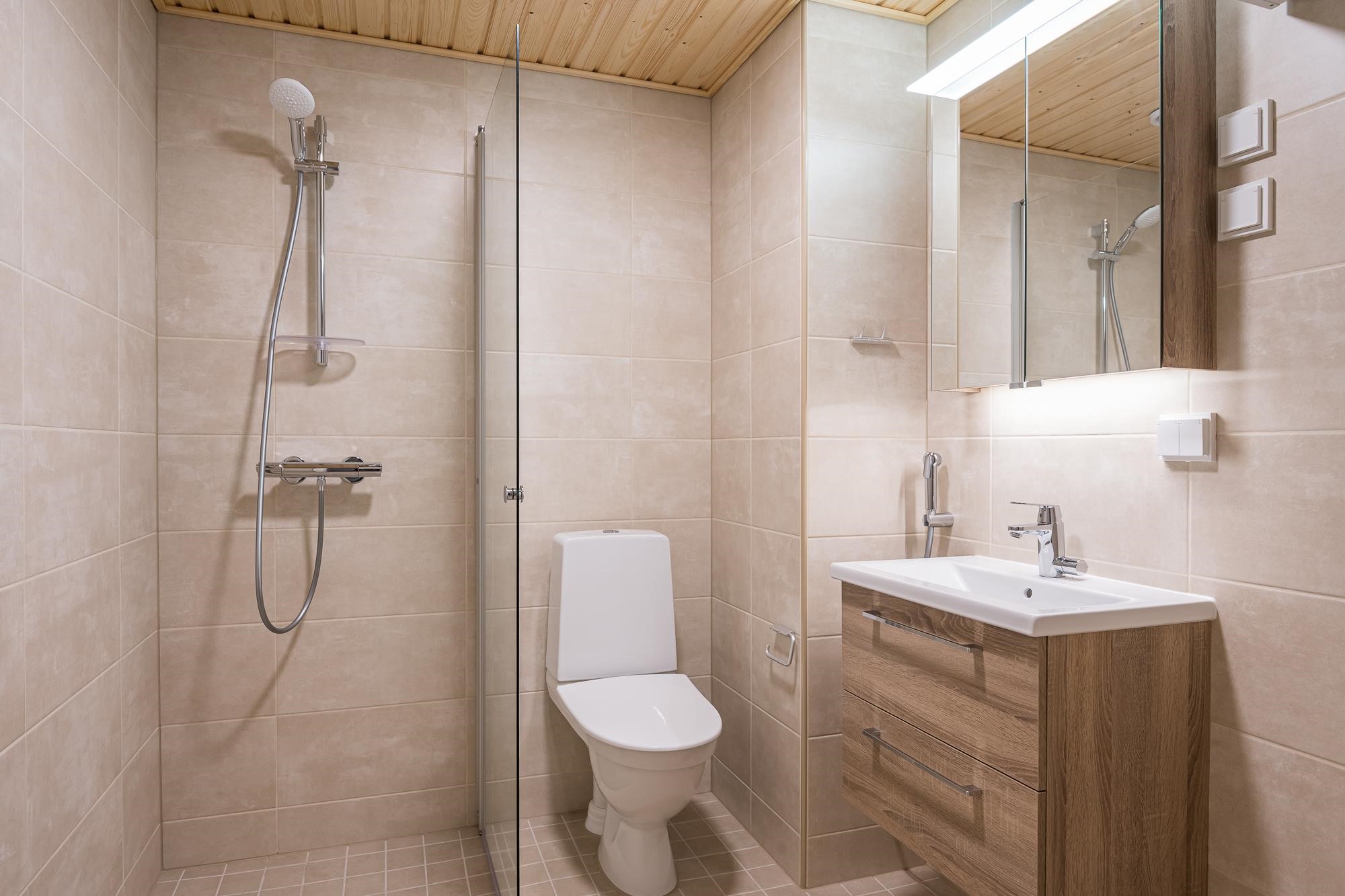 - Kylpyhuoneessa suihku, suihkuseinä tai suihkunurkka, valaisimella varustettu peilikaappi, allaskaappi vetolaatikoilla. Tilavaraus pyykinpesukoneelle ja kuivausrummulle. Mukavuuslattialämmitys sähköllä (kylpyhuone ja sauna). Huoneistoissa missä sauna, saunassa sähkökiuas ja lasiovi. Huoneistoissa missä erillis-wc pm valaisinpeili ja allaskaappi vetolaatikoilla.