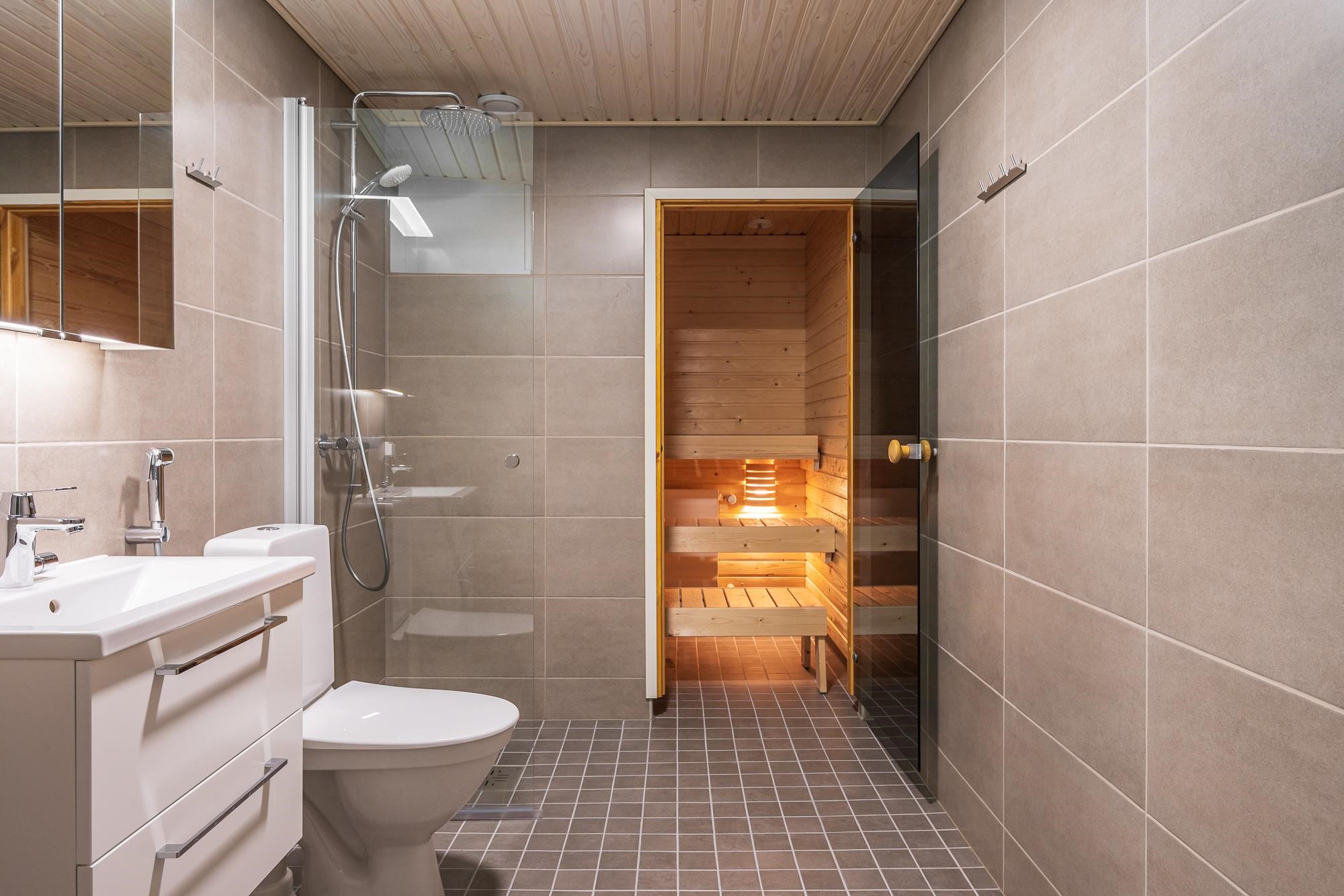 - Kylpyhuoneessa suihku, suihkuseinä tai suihkunurkka, valaisimella varustettu peilikaappi, allaskaappi vetolaatikoilla. Tilavaraus pyykinpesukoneelle ja kuivausrummulle. Mukavuuslattialämmitys sähköllä (kylpyhuone ja sauna). Huoneistoissa missä sauna, saunassa sähkökiuas ja lasiovi. Huoneistoissa missä erillis-wc pm valaisinpeili ja allaskaappi vetolaatikoilla.
