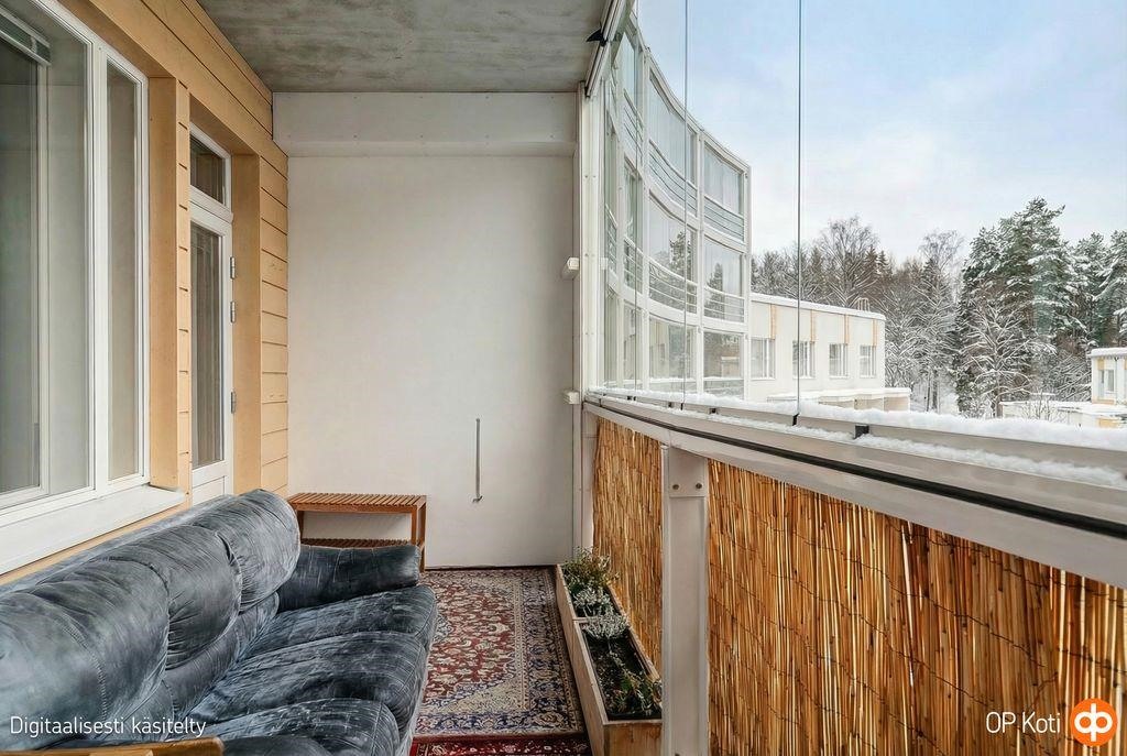 Avara olohuone ja keittiö muodostavat yhtenäisen sydämen tälle kodille. Niiden kautta avautuu tilava lasitettu parveke, jossa voit nauttia aamukahvin rauhassa, seurata vuodenaikojen vaihtumista tai viettää iltaa ystävien kanssa. Tavallista korkeampi huonekorkeus luo koko huoneistoon ilmavan, levollisen tunnelman.