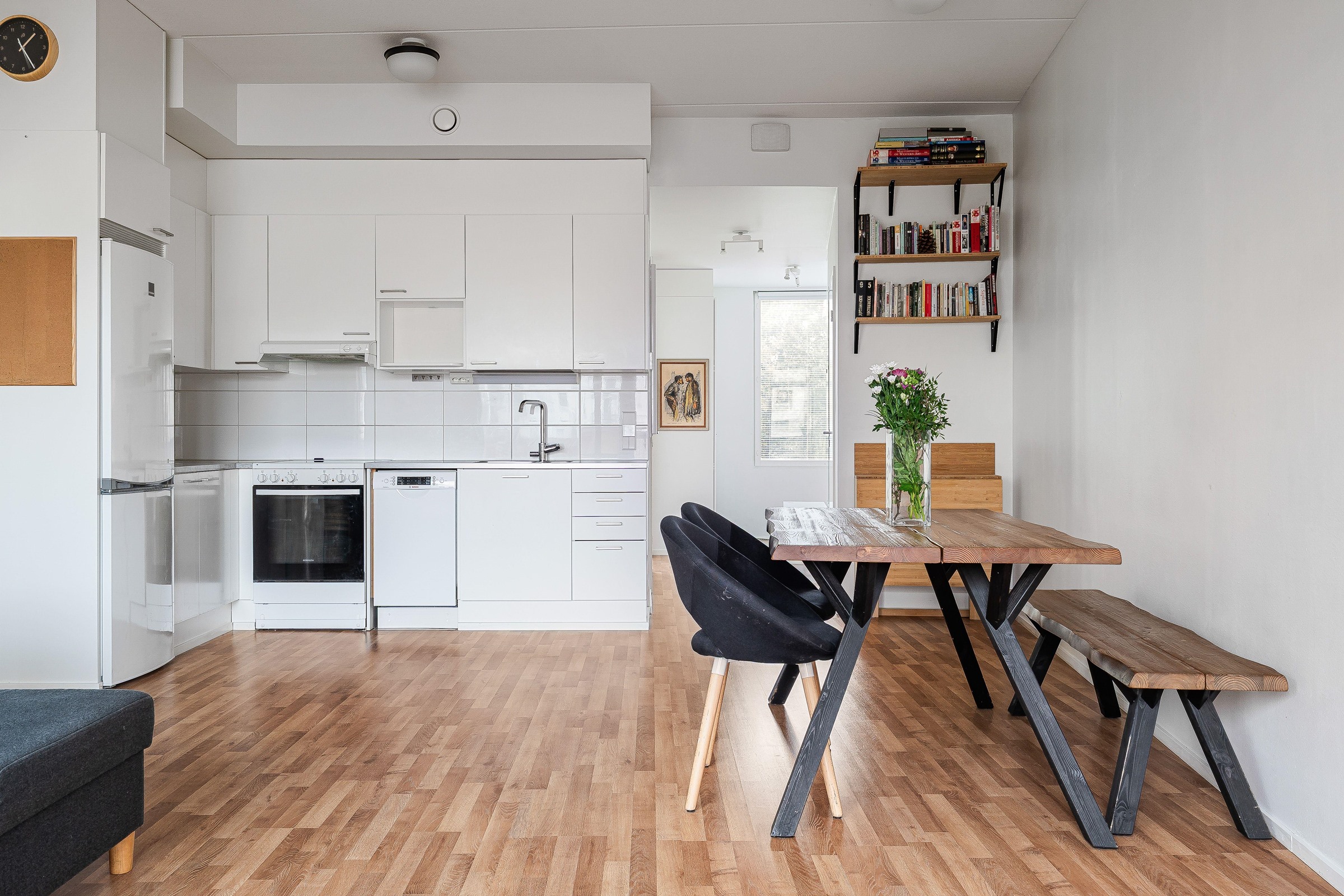 - Jääkaappipakastin, induktioliesi, liesituuletin, astianpesukone, kaapistot, kiinteät valaisimet.