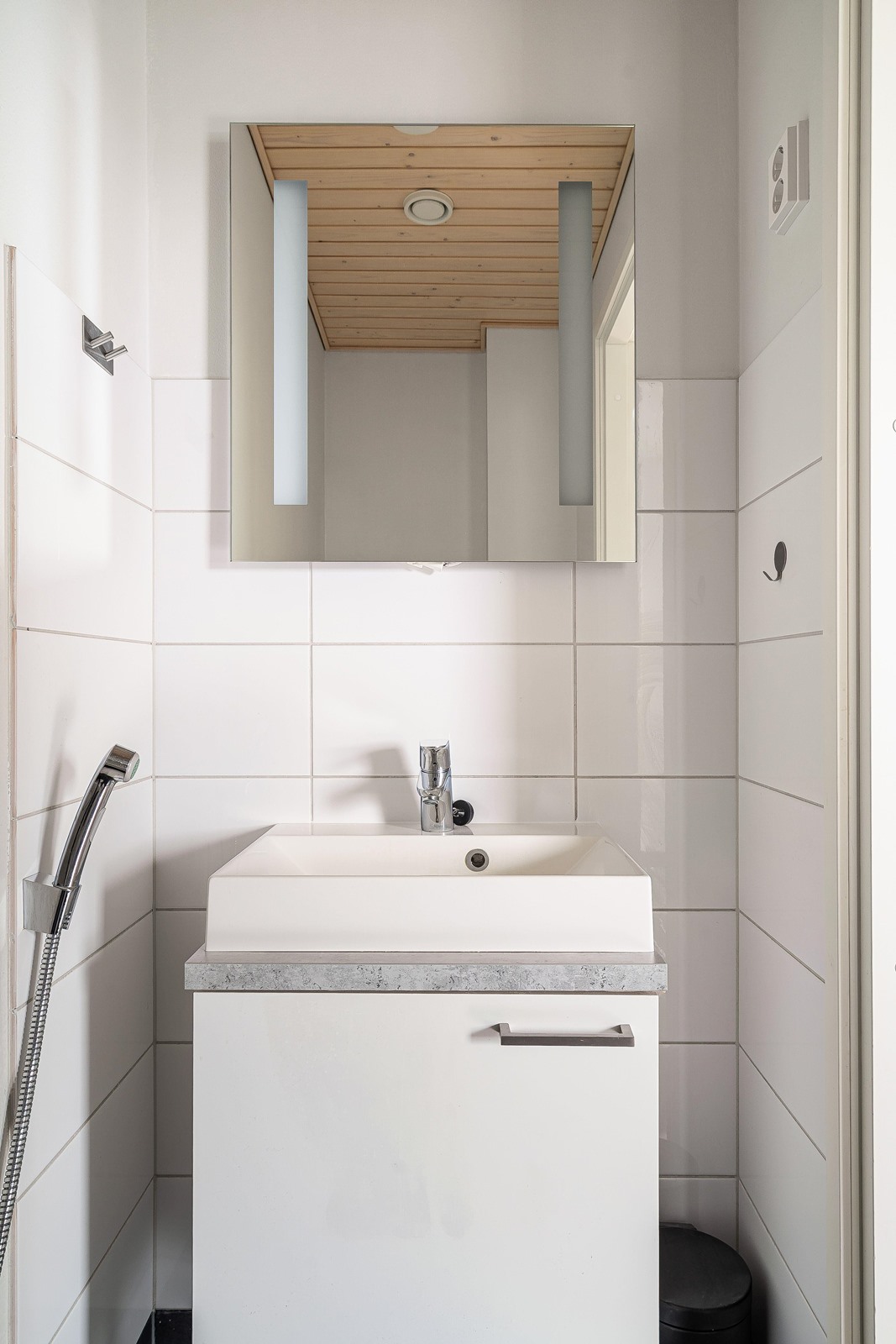 - suihku, peilikaappi, allaskaappi, pesukoneliitäntä, vesikiertoinen lattialämmitys, kiinteät valaisimet. Erillinen wc.