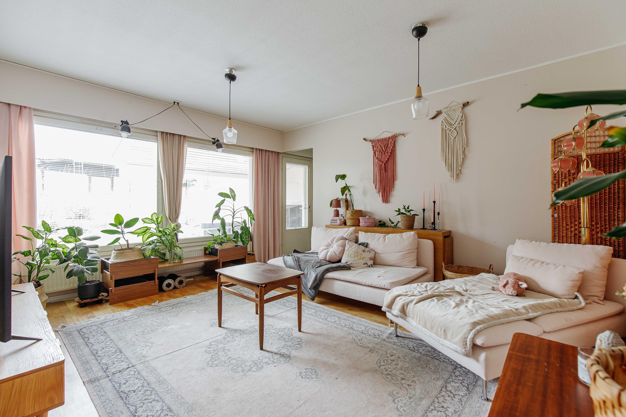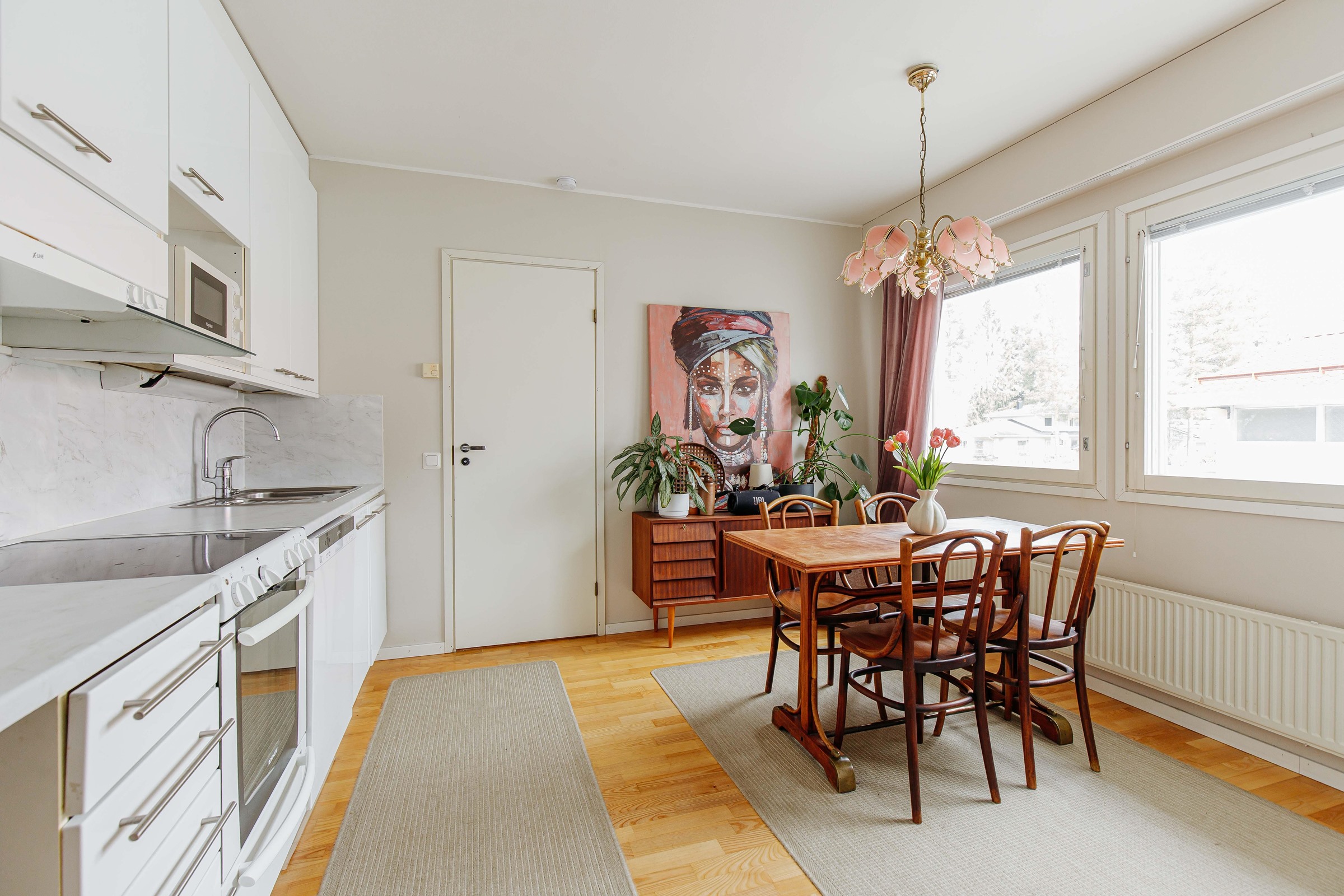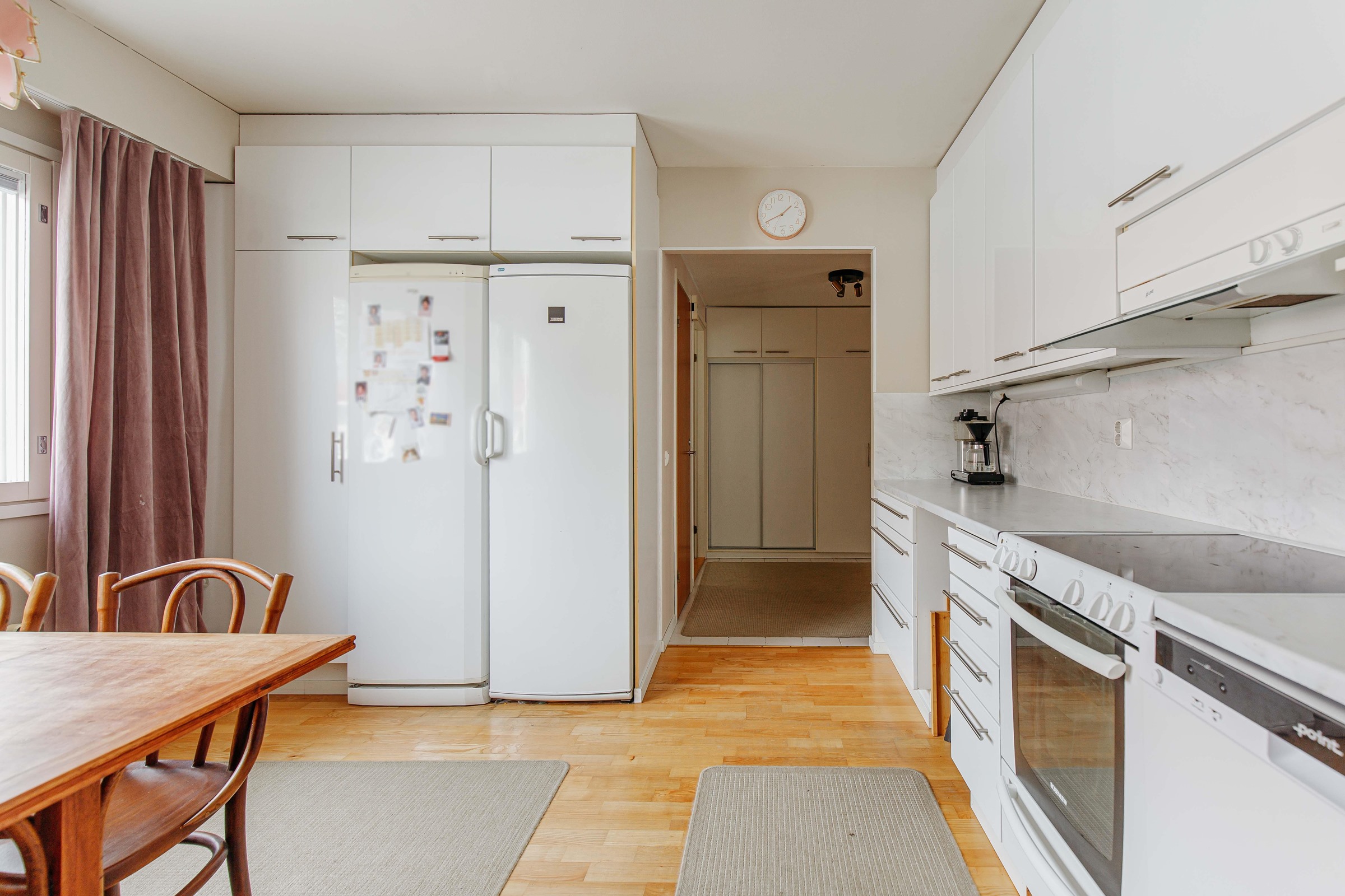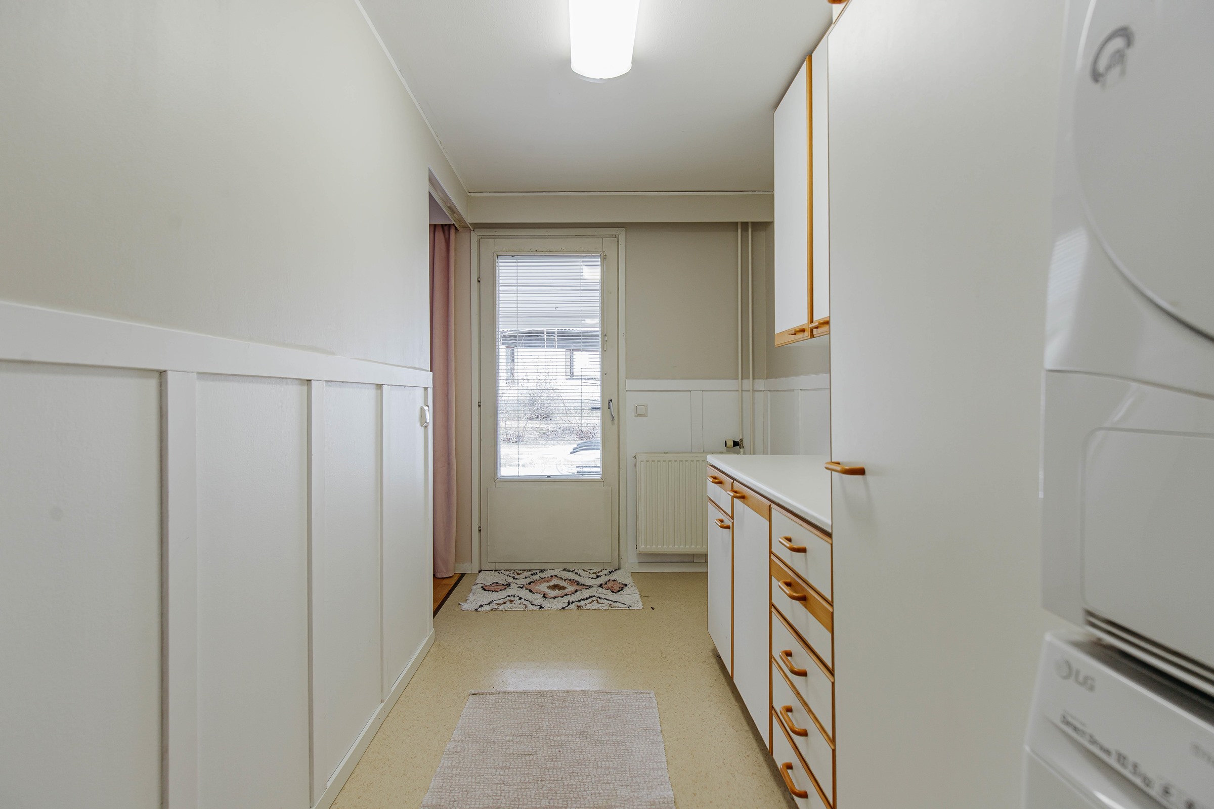 Neliöidensä ansiosta asunto sopii erinomaisesti myös perheelle. Koti on siistissä kunnossa, ja sen pintoja on jonkin verran päivitetty vuosien varrella. Keittiö on valoisa ja sisustettu nykyaikaisin sävyin. Asunnossa on erillinen kodinhoitohuone, jota tuo käytännöllisyyttä ja helpotusta arkeen. Takapihalla on suojainen katettu terassi, joka tarjoaa mukavasti oleskelutilaa kesäiltoihin.