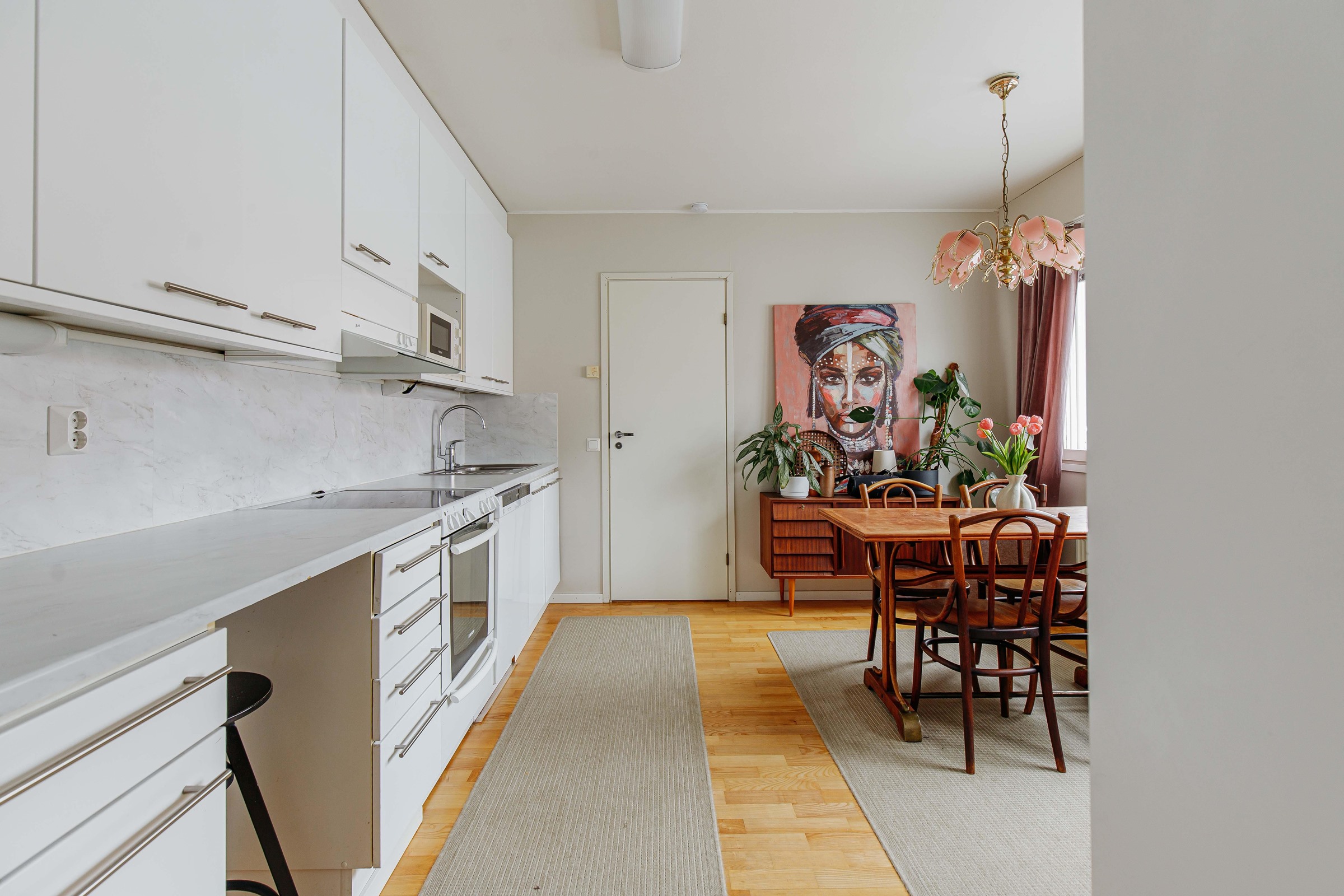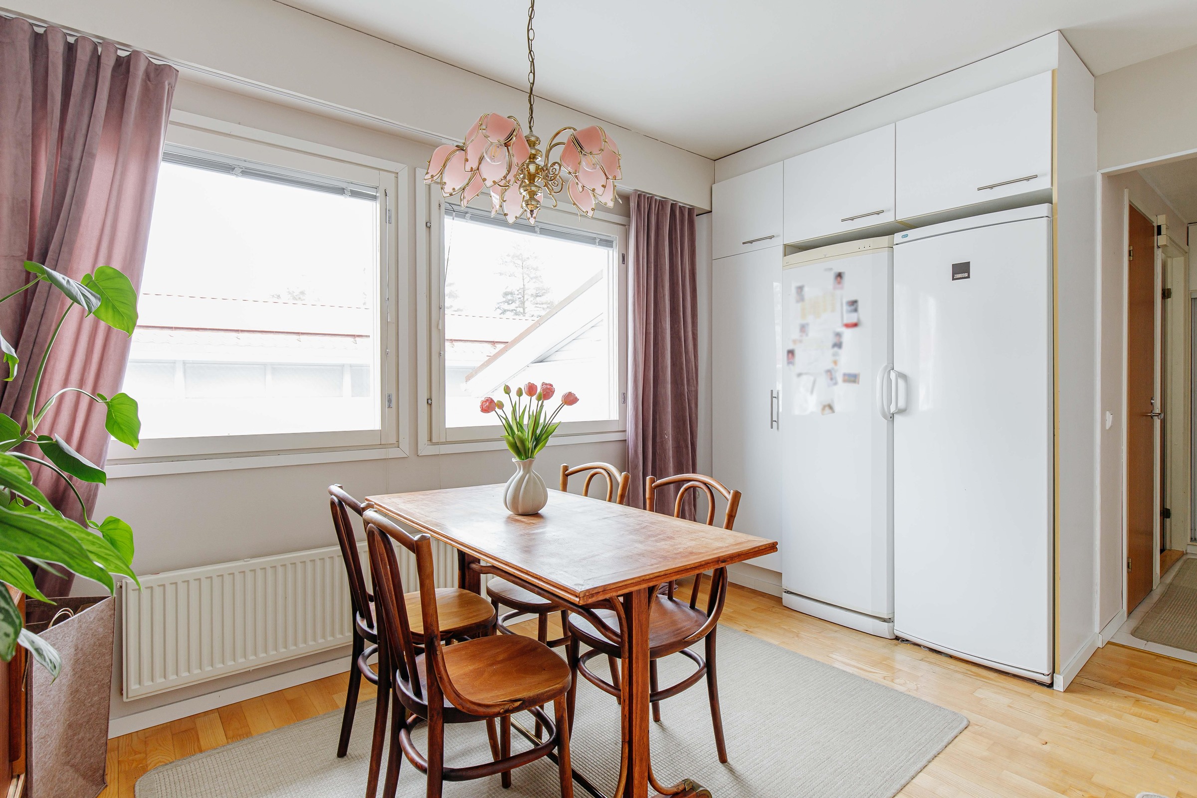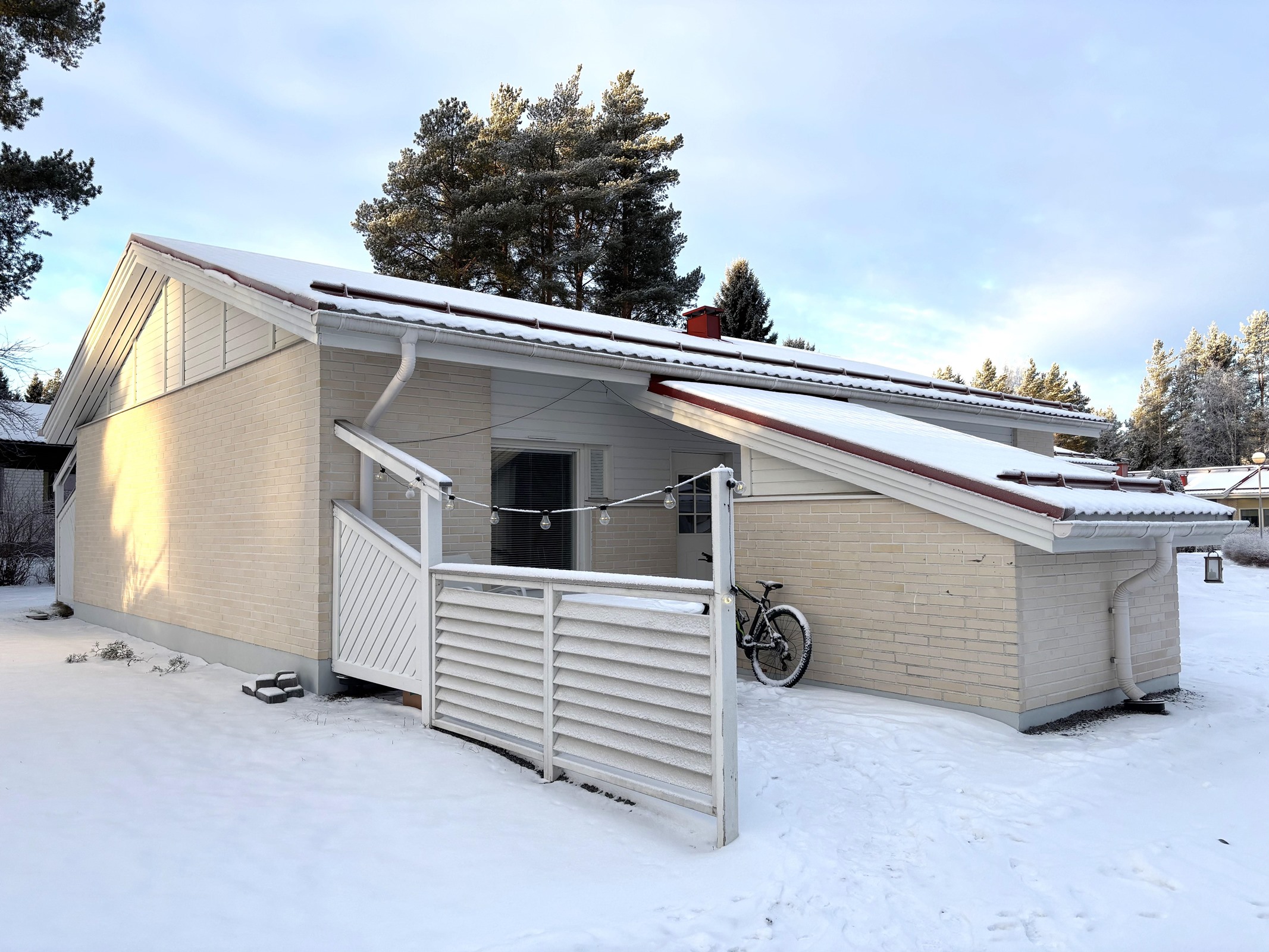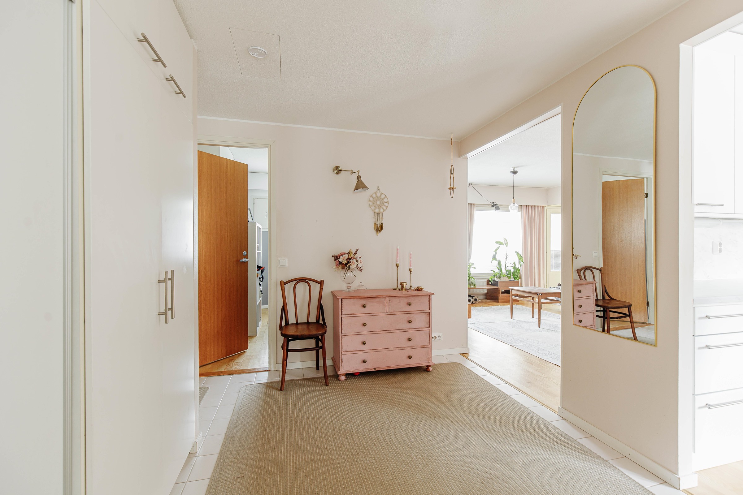 Neliöidensä ansiosta asunto sopii erinomaisesti myös perheelle. Koti on siistissä kunnossa, ja sen pintoja on jonkin verran päivitetty vuosien varrella. Keittiö on valoisa ja sisustettu nykyaikaisin sävyin. Asunnossa on erillinen kodinhoitohuone, jota tuo käytännöllisyyttä ja helpotusta arkeen. Takapihalla on suojainen katettu terassi, joka tarjoaa mukavasti oleskelutilaa kesäiltoihin.