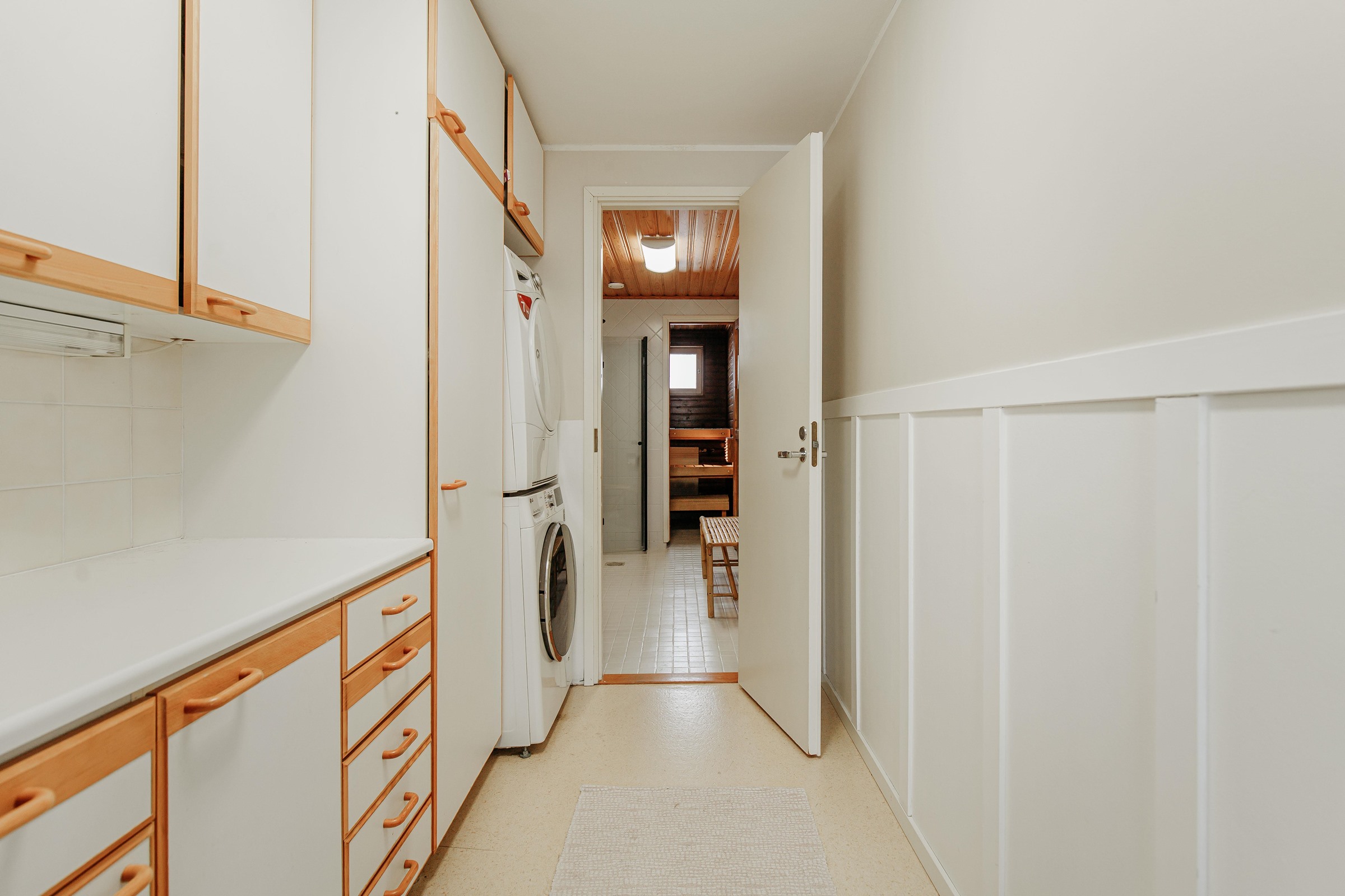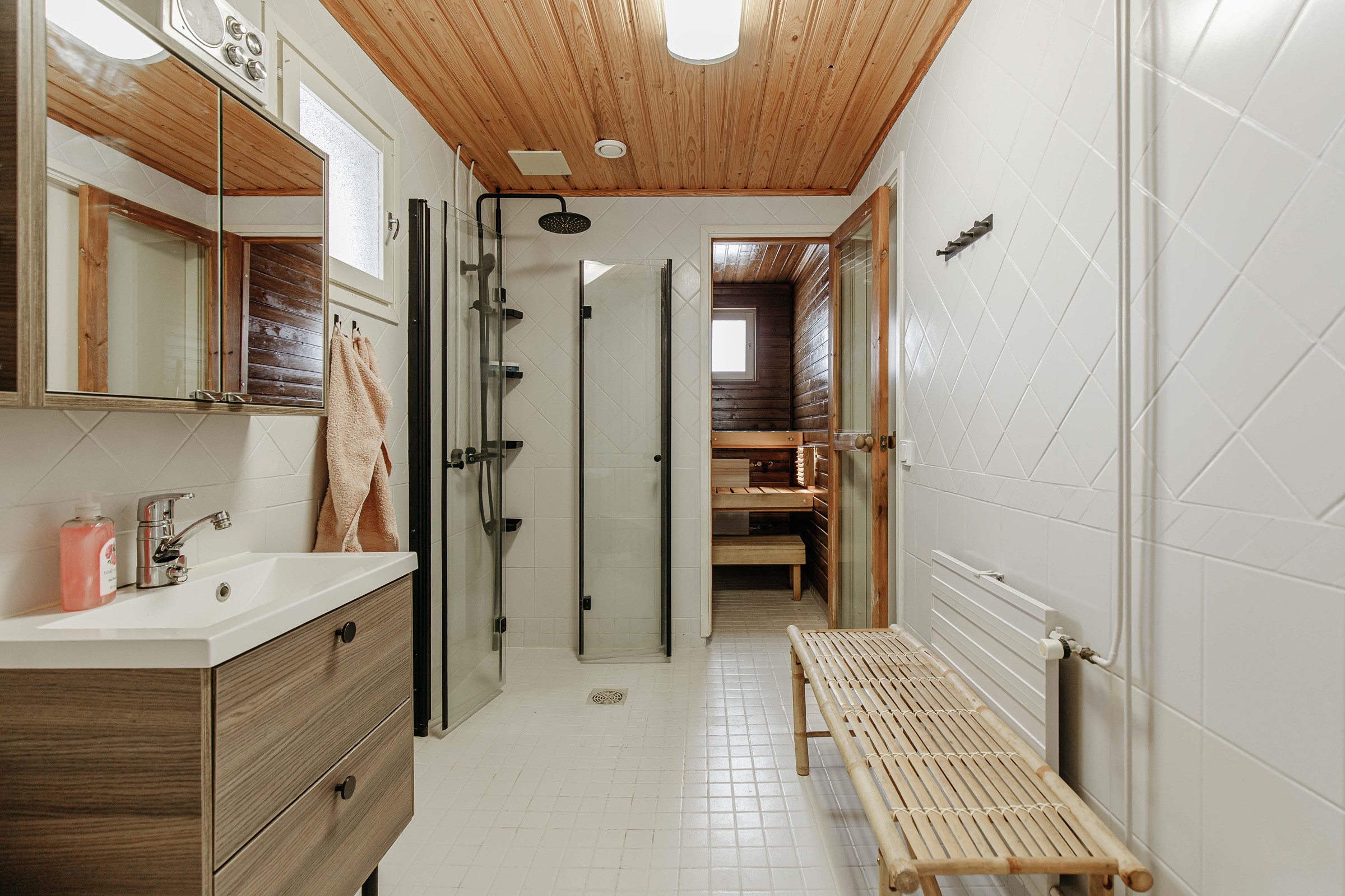 - Sauna, sähkökiuas, kylpyhuone, erillinen wc, suihku, suihkuseinä, peilit, peilikaappi, allaskaappi, pesukoneliitäntä, lattialämmitys, kiinteät valaisimet.