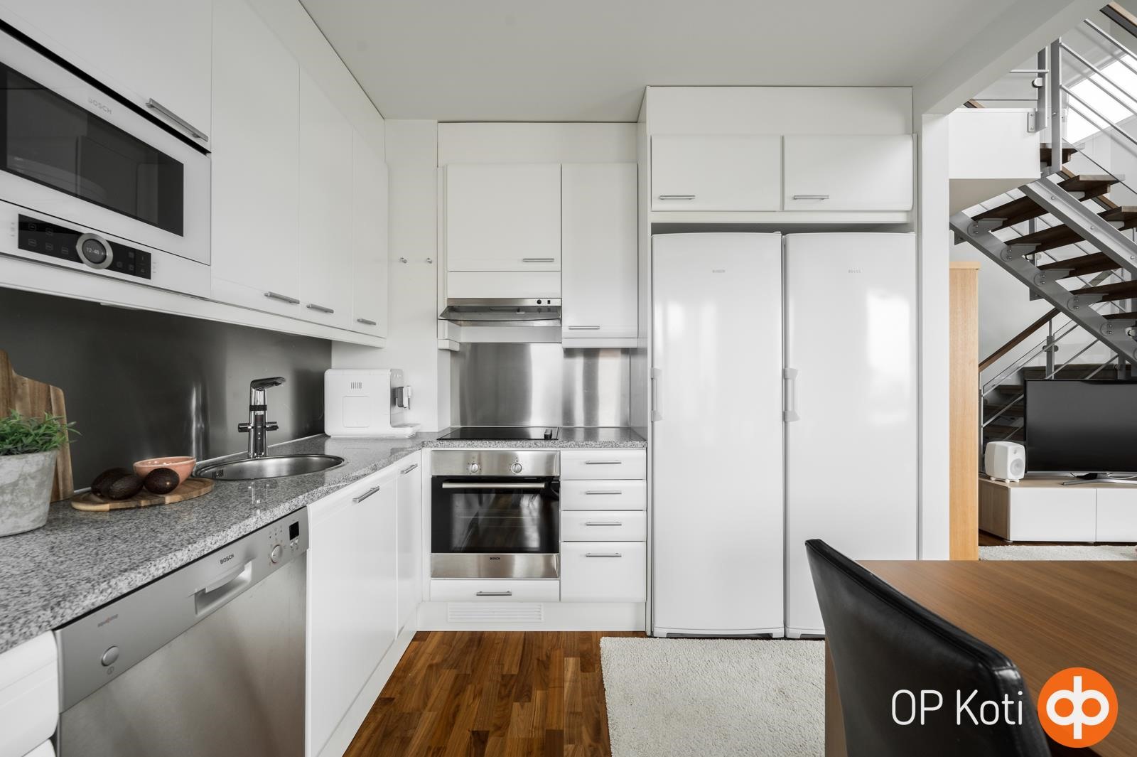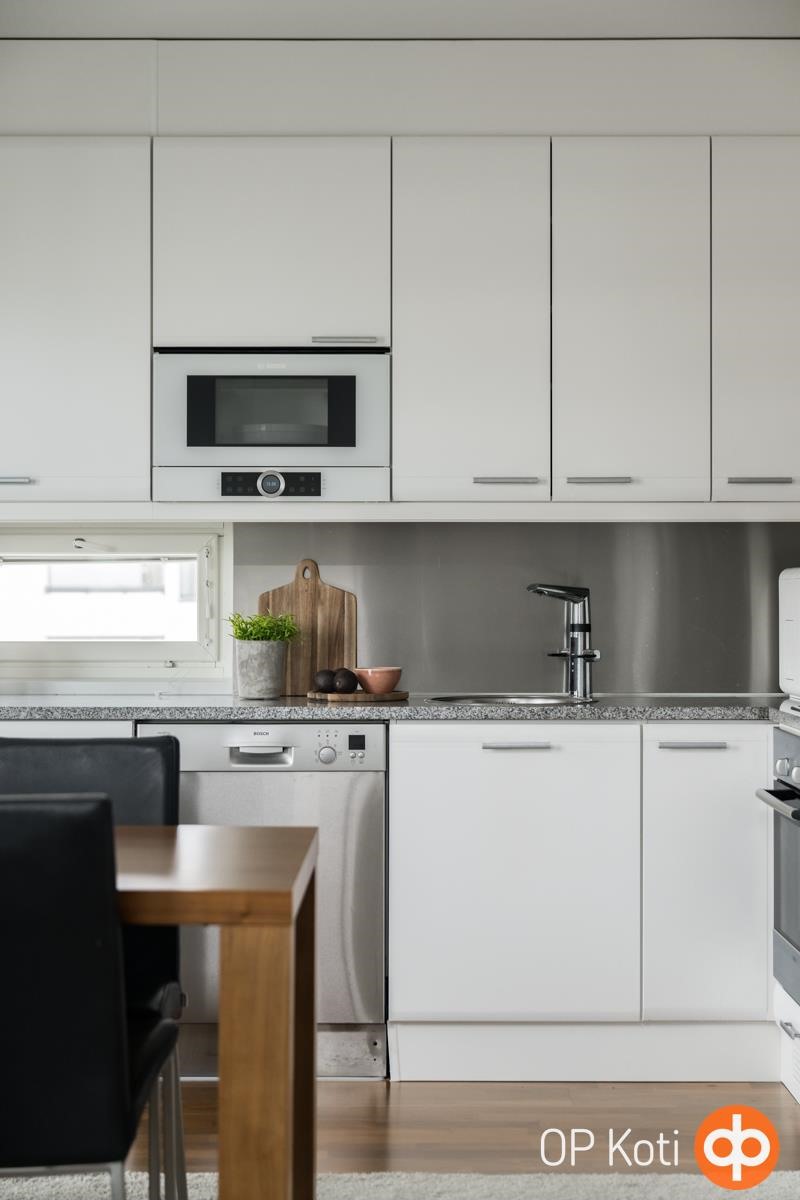 - Jääkaappi, pakastekaappi, erillisuuni, liesitaso keraaminen, mikroaaltouuni integroitu, 2023, astianpesukone, kaapistot, kiinteät valaisimet.
