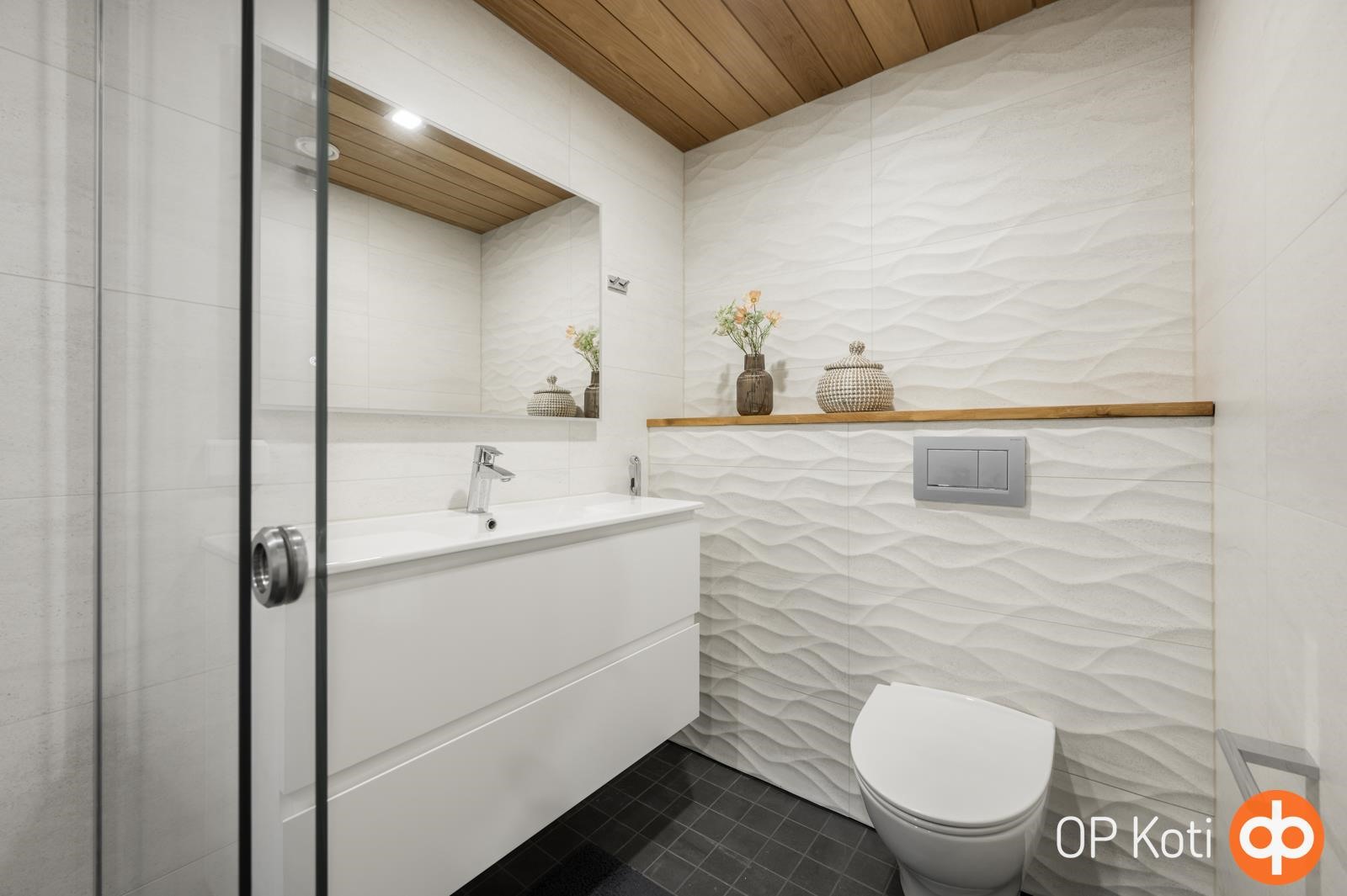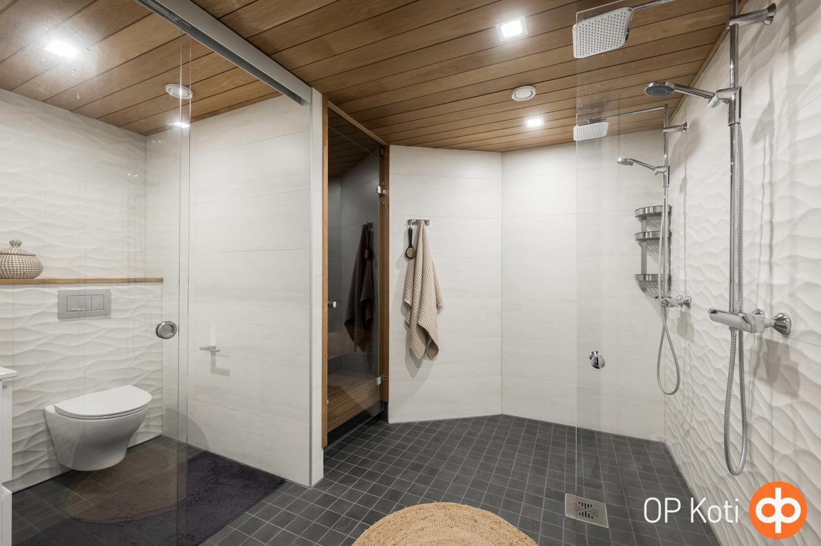 - Sauna, sähkökiuas valmius nettikäyttöön, saa päälle etänä, kylpyhuone, erillinen wc, suihku, suihkukaappi, peilit, peilikaappi, allaskaappi, pesukoneliitäntä alakerran kylpyhuoneessa, lattialämmitys, kiinteät valaisimet. Saunatilat rakennettu parvelle 2021