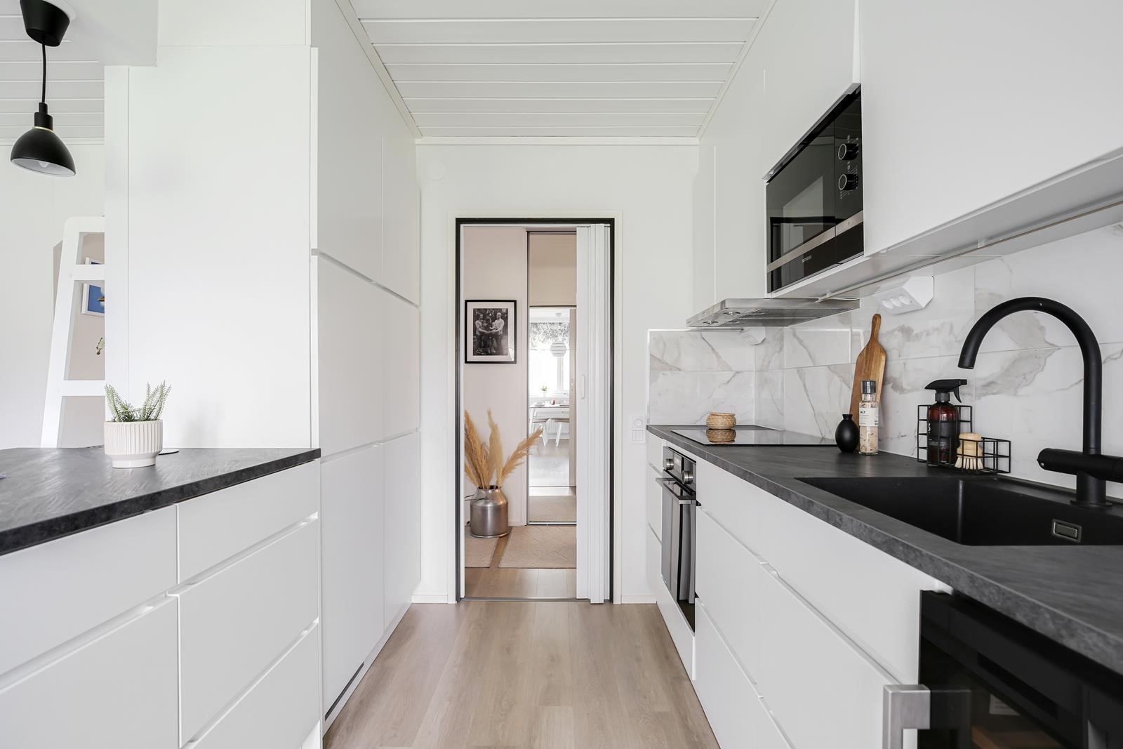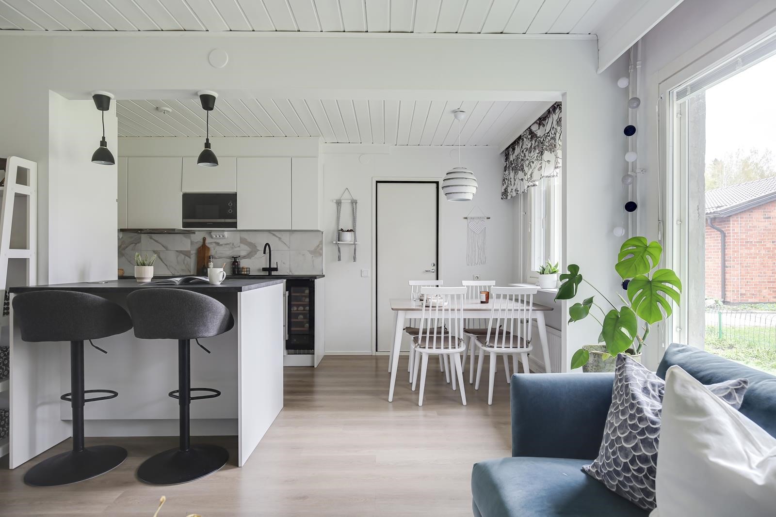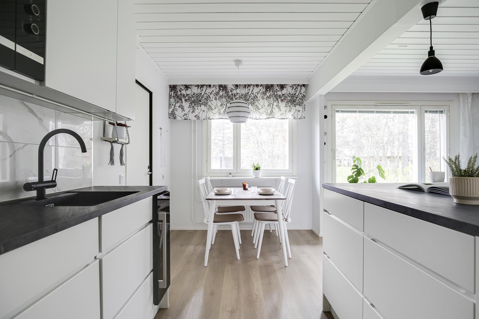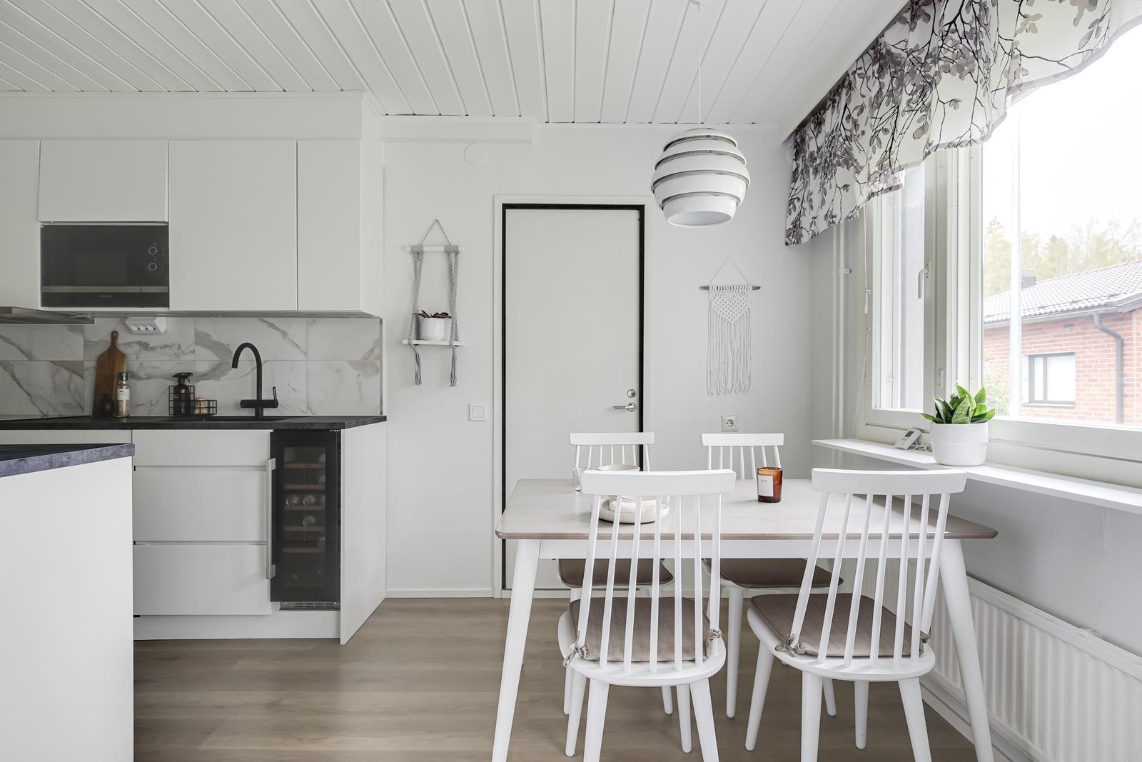 - Tyylikäs ja toimiva keittiö laadukkailla varusteilla Tässä modernissa keittiössä yhdistyvät käytännöllisyys ja skandinaavinen design. Keittiökalusteet ovat laadukkaasta Kvik-keittiö-mallistosta, ja kokonaisuutta täydentävät laminaattitasot sekä tyylikkäät integroidut kodinkoneet. Varusteluun kuuluu: Integroitu töyskorkea jääkaappi, (jääkaappipakastin on kodinhoitohuoneessa), erillisuuni pyrolyysitoiminnolla - helppo puhdistaa, induktiotaso ja liesituuletin hormiin, integroitu mikroaaltouuni, integroitu astianpesukone, saareke, jotka tuovat joustavuutta tilan käyttöön. Kiinteät LED-valaisimet tarjoavat tehokkaan ja miellyttävän työskentelyvalon. Tämä keittiö on suunniteltu arjen sujuvuutta ja viihtyisyyttä silmällä pitäen - täydellinen niin ruoanlaittoon kuin yhdessäoloon.