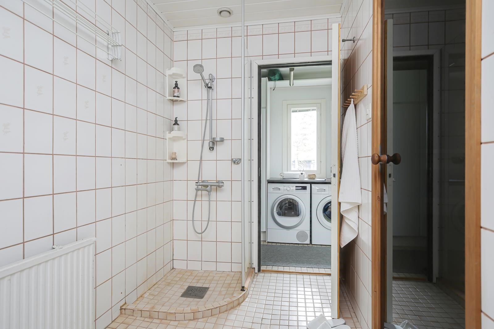 - Tyylikkäät ja toimivat kylpytilat arjen mukavuuteen Asunnon kylpytilat on suunniteltu tarjoamaan sekä käytännöllisyyttä että rentoutumista. Saunassa on sähkökius ja kylpyhuoneessa on suihku sekä lasinen suihkuseinä, peilikaappi ja lisämukavuutta tuomassa sähköinen lattialämmitys. Kodinhoitohuoneessa Puustellin kaapisto säilytykseen sekä pesukoneliitäntä. Kodinhoitohuoneesta on myös käytännöllinen kulku piha-alueelle. Tilat ovat siistit, ajattomat ja hyvin varustellut- valmiina palvelemaan niin arjen askareissa kuin rentoutumishetkissä. Tiloissa on kiinteä valaistus. Kylpyhuoneeseen on mahdollisesti tulossa saneeraus.