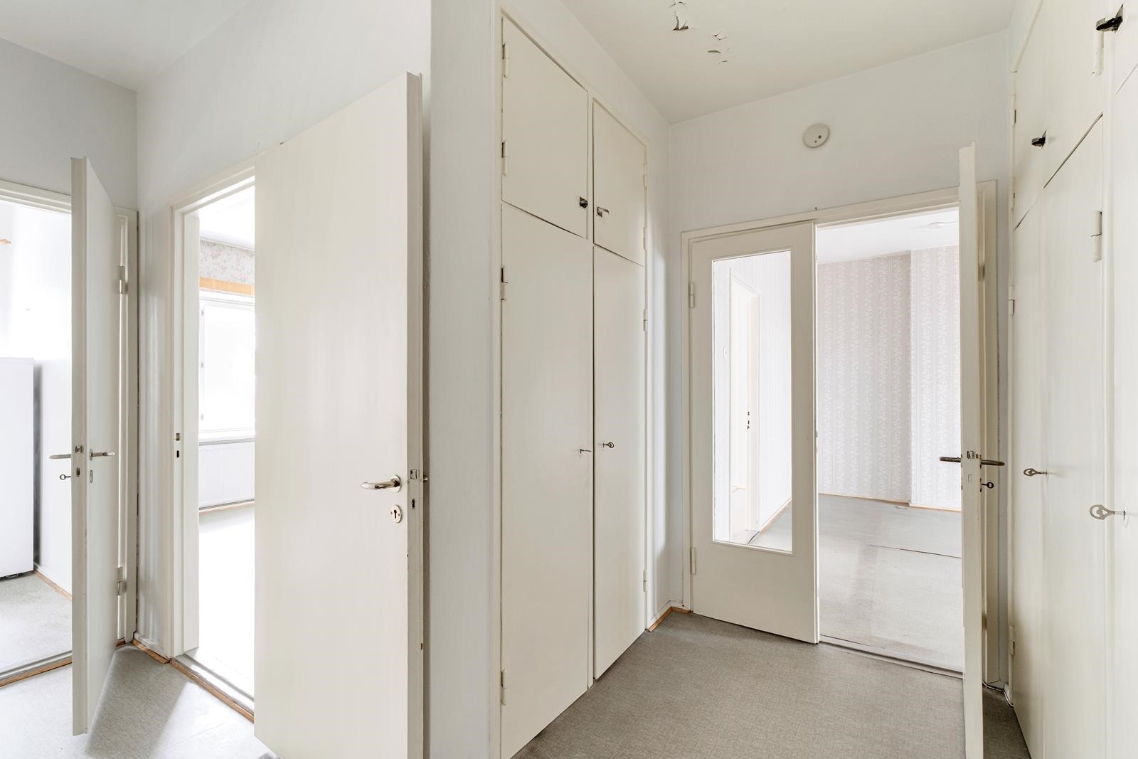 - Keittiö: Alkuperäisessä kunnossa. Muovimattolattia, seinät maali. Olohuone: Muovimattolattia, seinät tapetti. Makuuhuone 1: Muovimattolattia, seinät tapetti. Makuuhuone 2: Muovimattolattia, seinät tapetti. Kylpyhuone: Laattalattia, seinät laatta/maali. Eteinen: Muovimattolattia, seinät maali.