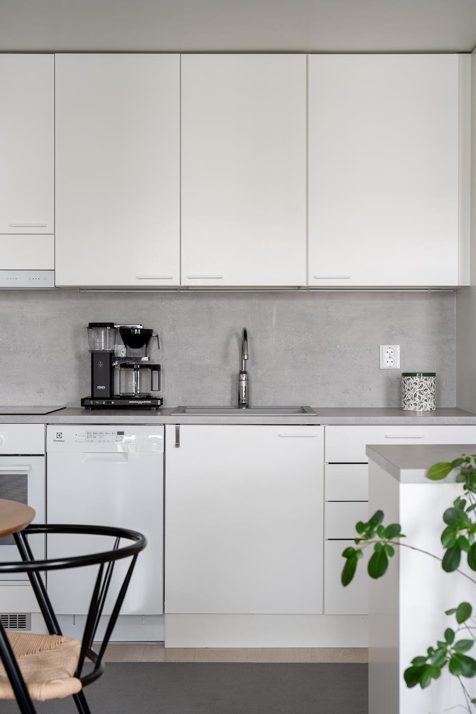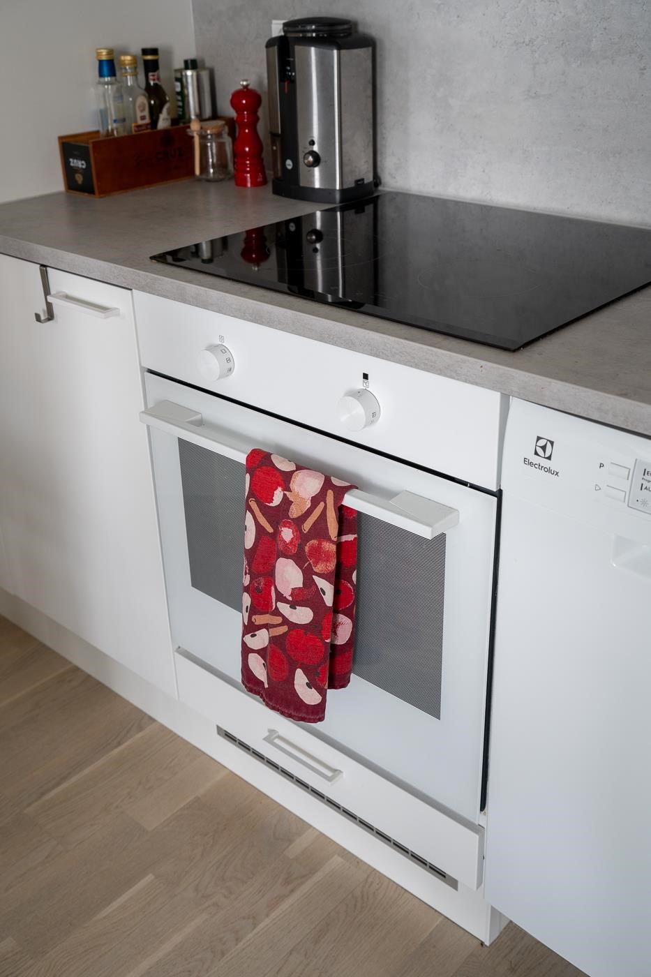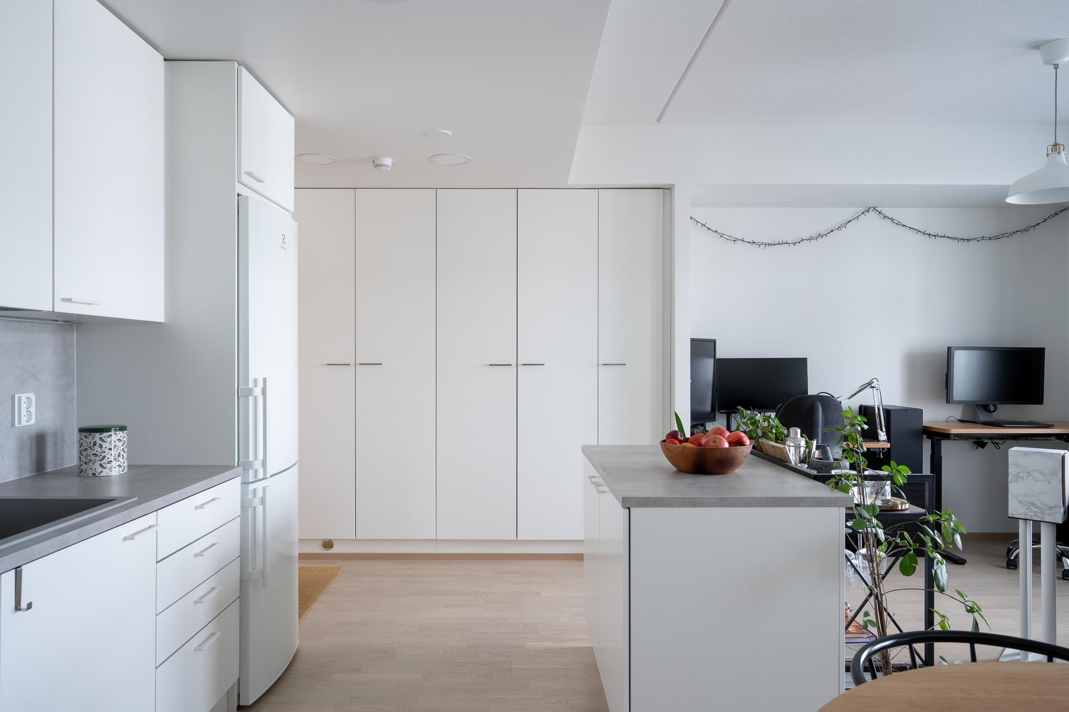- Valkoinen jääkaappipakastin. Valkoinen erillisuuni. Keraaminen liesitaso. Valkoinen liesituuletin. Astianpesukone on 45 cm leveä, valkoinen. Valkoiset tasapintaiset kaapistot. Saareke.