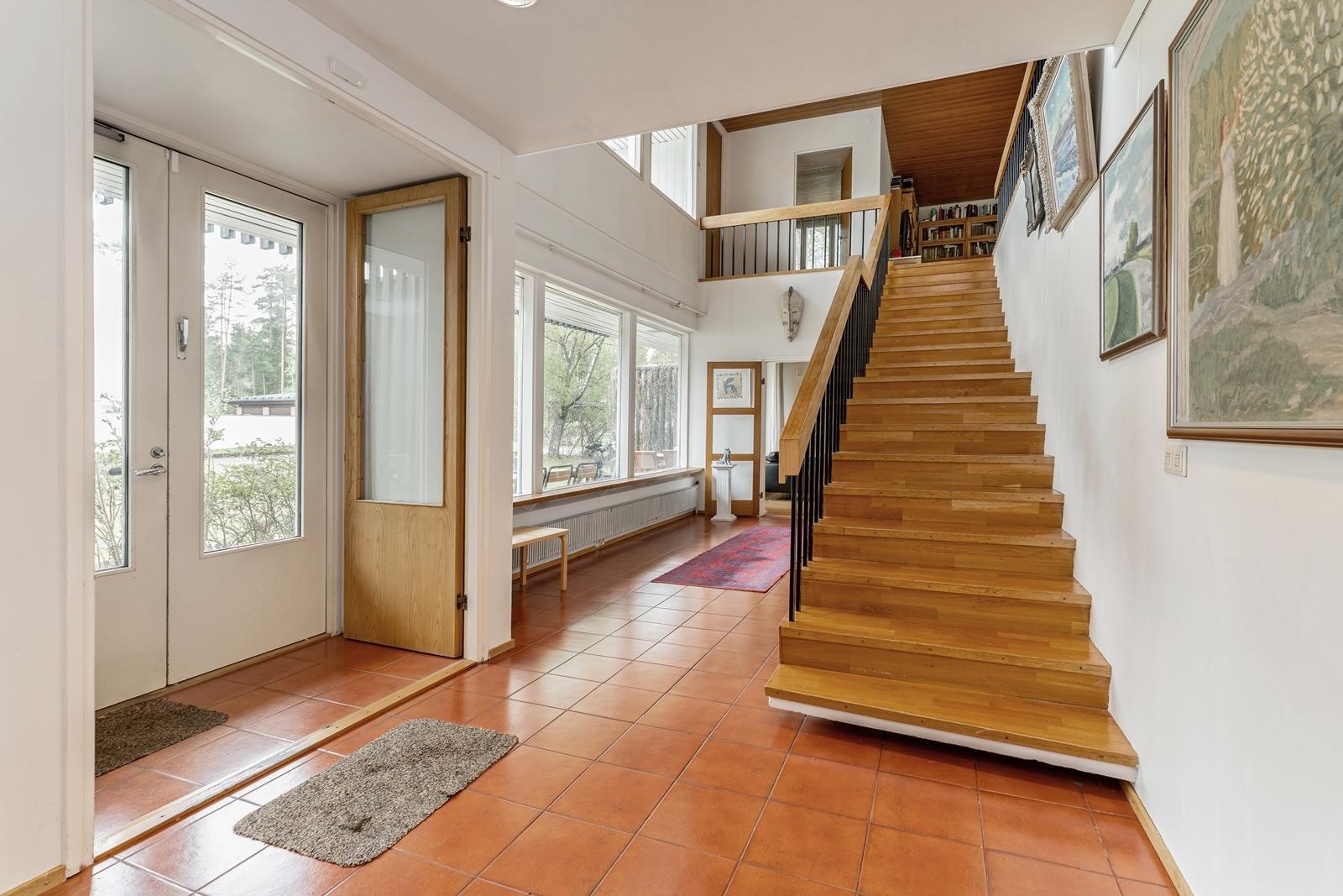 Rakennukseen on sisäänkäynti sekä pääovesta että joen puolelta ja edustoilla on molemmin puolin katettu terassi. Suuret ikkunat valaisevat tiloja molemmissa kerroksissa. Alakerran avara olohuone ja ruokasali luovat tilan, jossa perhe ja ystävät voivat kokoontua viettämään yhteistä aikaa. Alakerran toisen osan muodostavassa keittiössä on tammiviiluoviset kaapistot. Saunaosasto takkahuoneineen tarjoaa tilavat ja rentouttavat puitteet arjen kiireiden keskellä. Yläkerrassa sijaitsevat kirjasto-takkahuone, kolme makuuhuonetta ja kaksi toimistohuonetta, jotka tarjoavat monipuoliset mahdollisuudet asumiseen ja työntekoon.