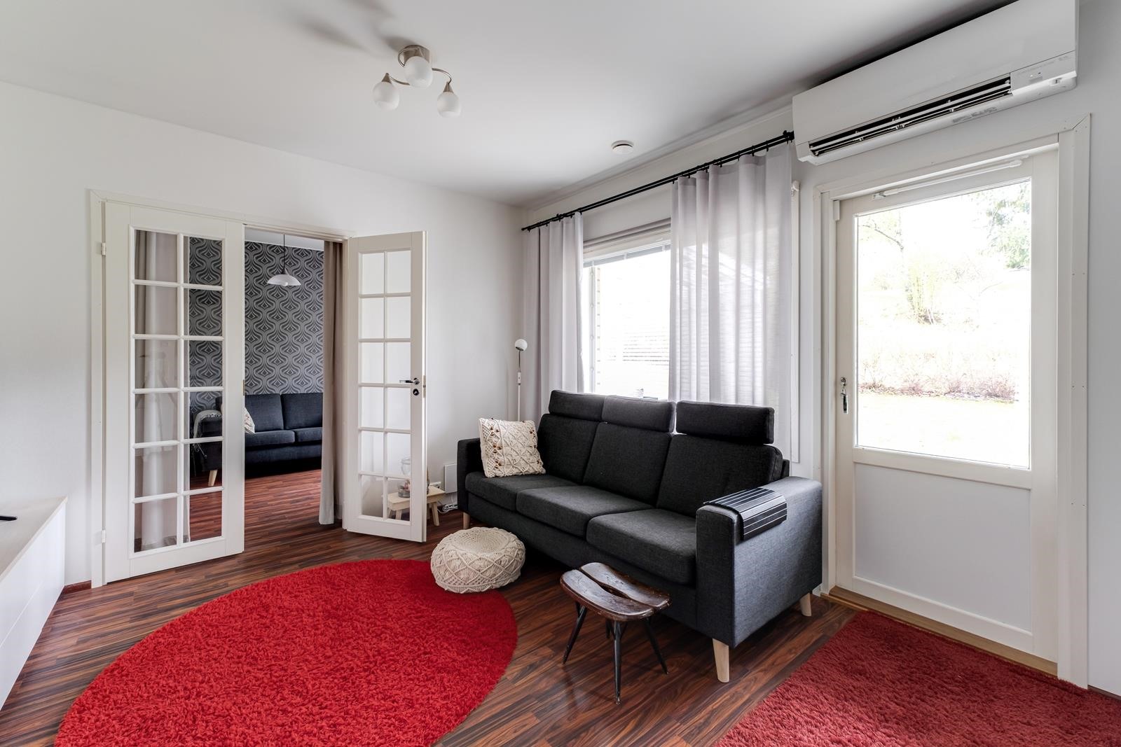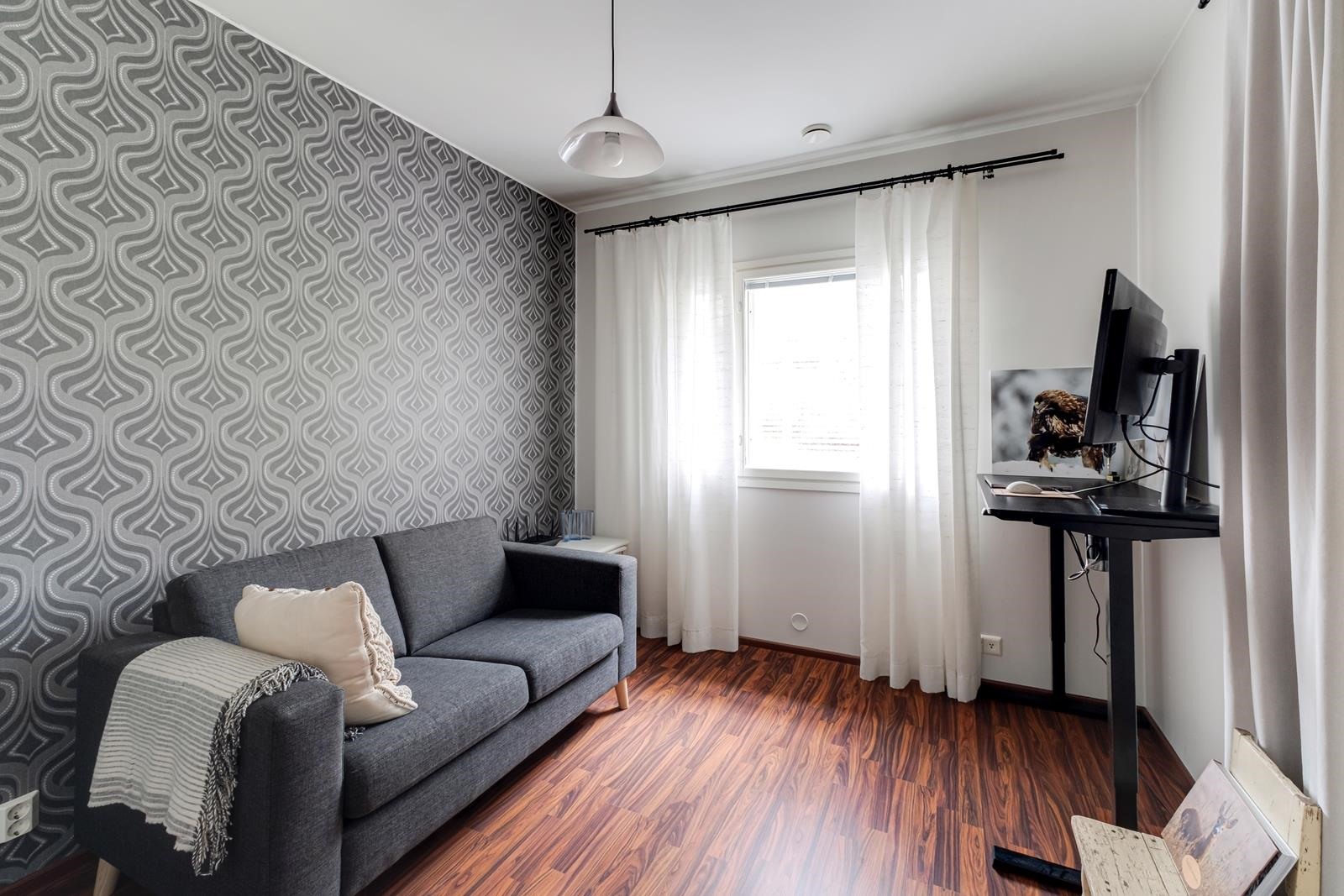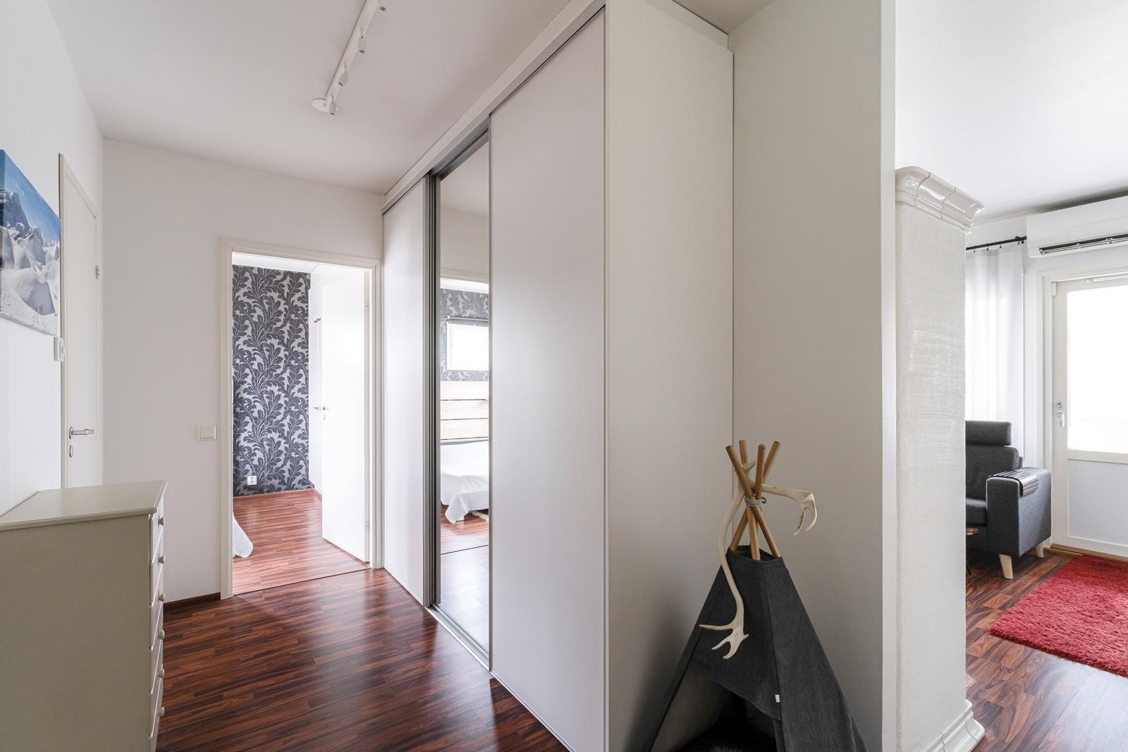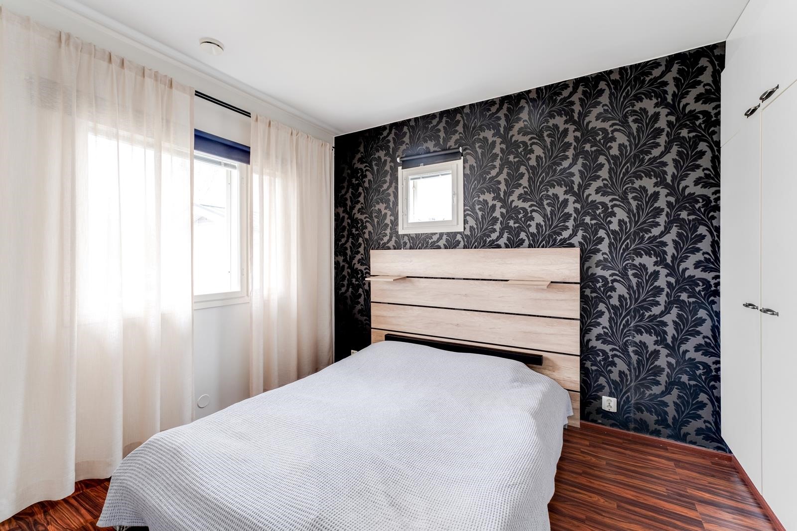 Keittiö: maalia, laminaattia. Olohuone: maalia/tapettia, laminaattia. Makuuhuone 1: maalia/tapettia, laminaattia. Makuuhuone 2: maalia/tapettia, laminaattia. Sauna: paneelia, laattaa. Kylpyhuone: kaakelia, laattaa. Eteinen: maalia, laminaattia. Wc: kaakelia, laattaa.