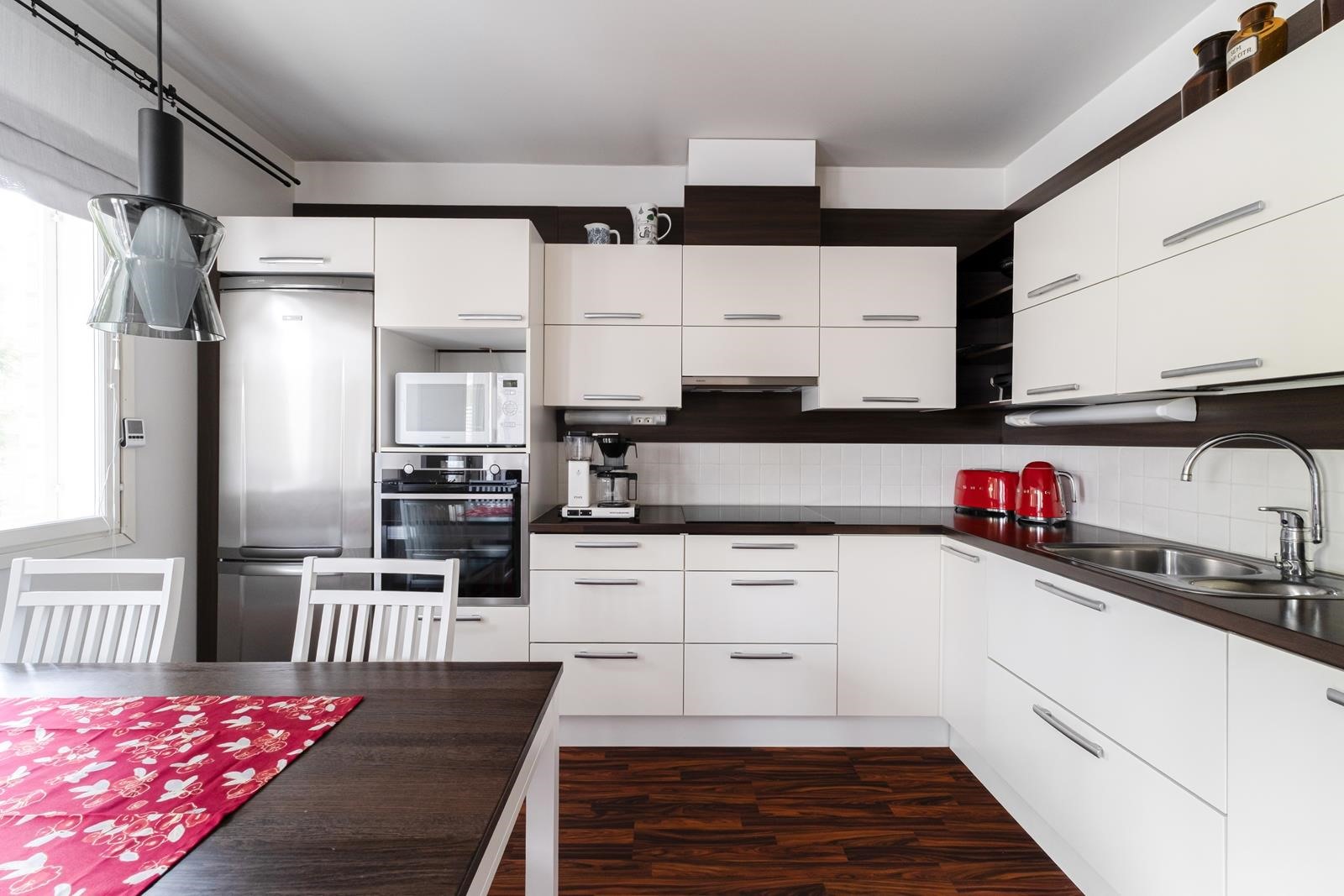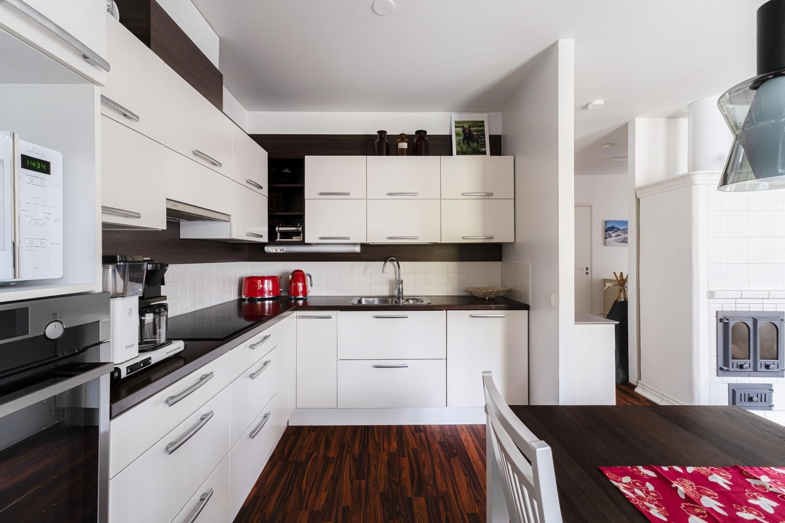 - Jääkaappipakastin, erillisuuni, induktioliesi, liesituuletin, astianpesukone, kaapistot, kiinteät valaisimet.