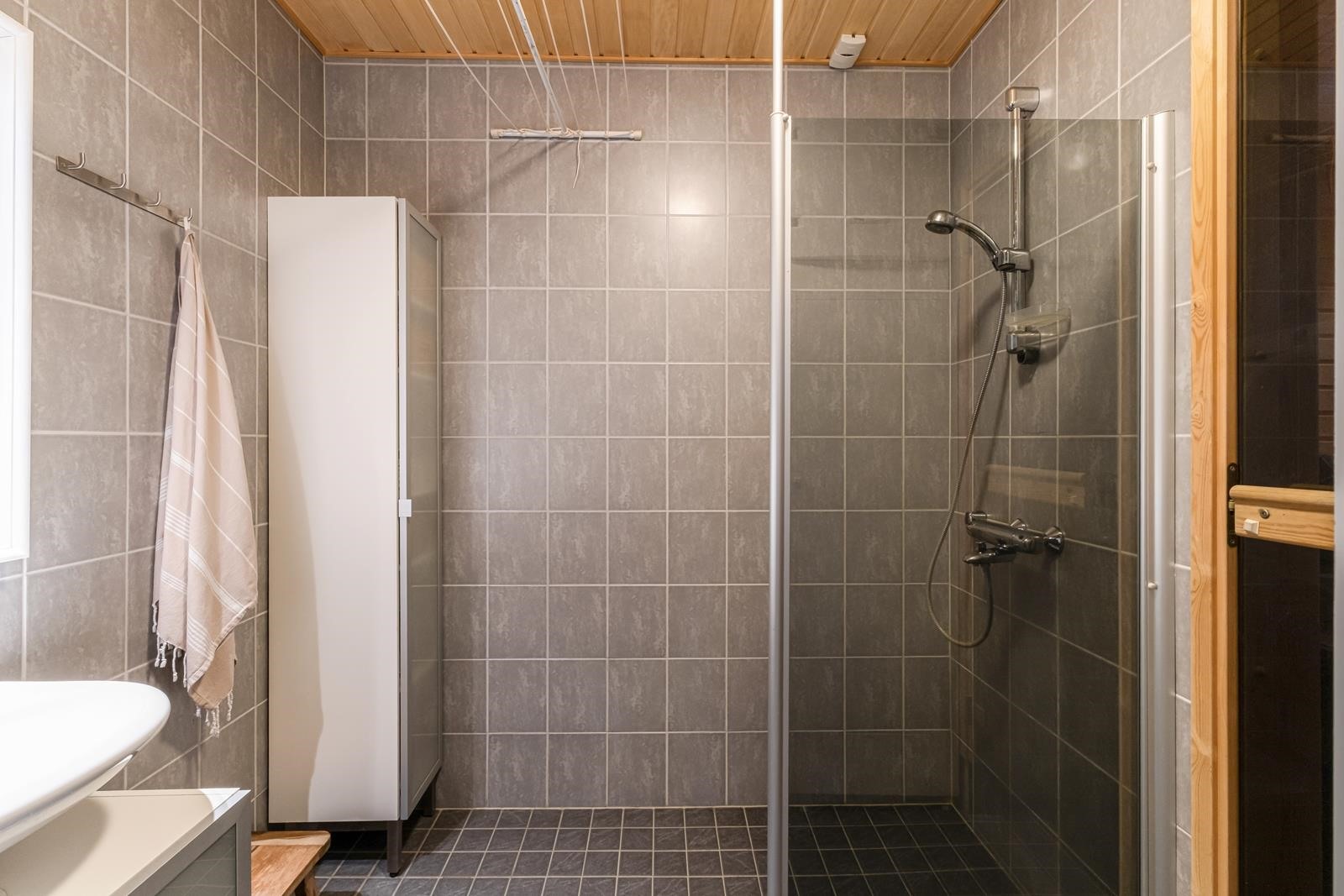 - Sauna, sähkökiuas, kylpyhuone, erillinen wc, suihku, peilit, pesukoneliitäntä, lattialämmitys, kiinteät valaisimet.