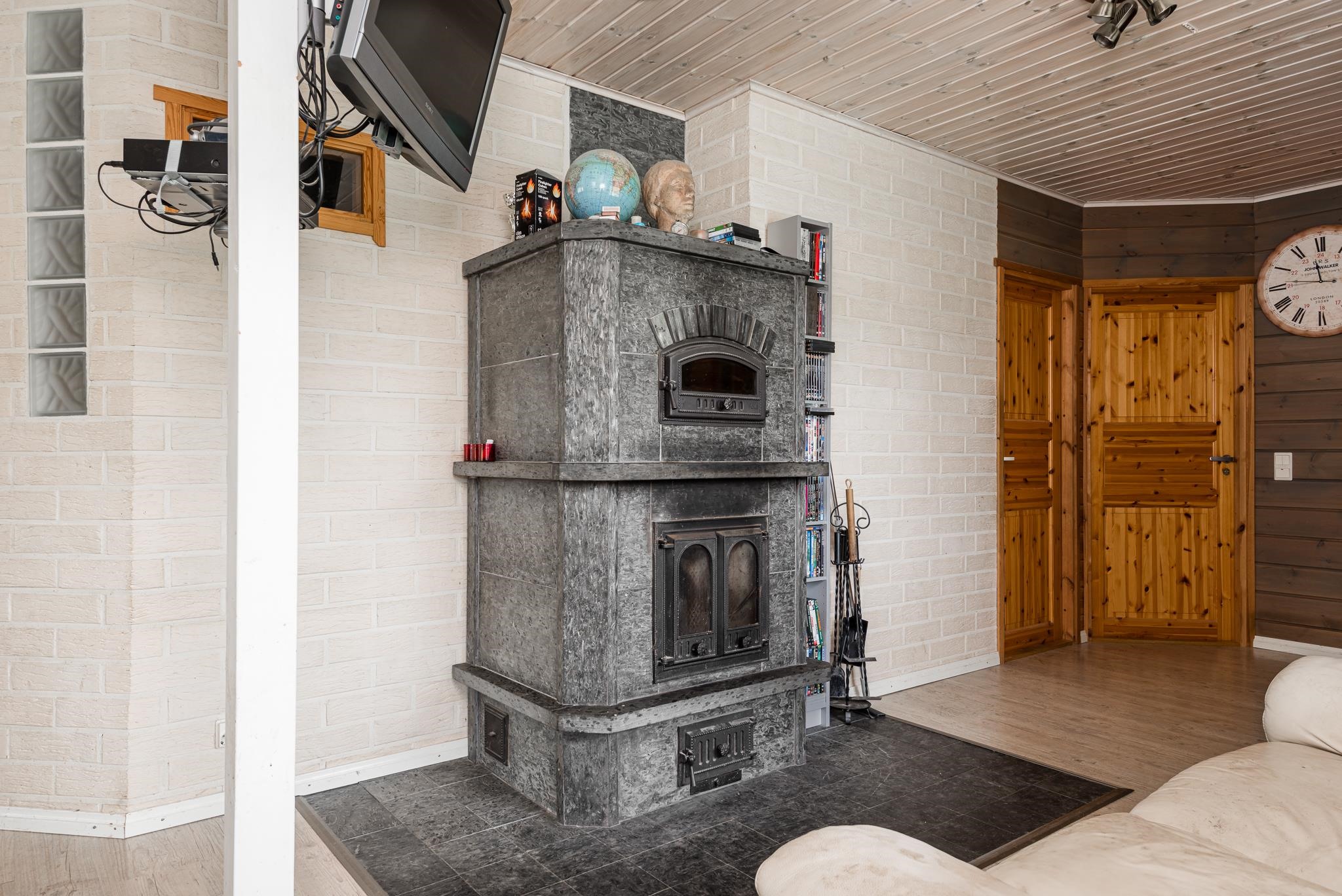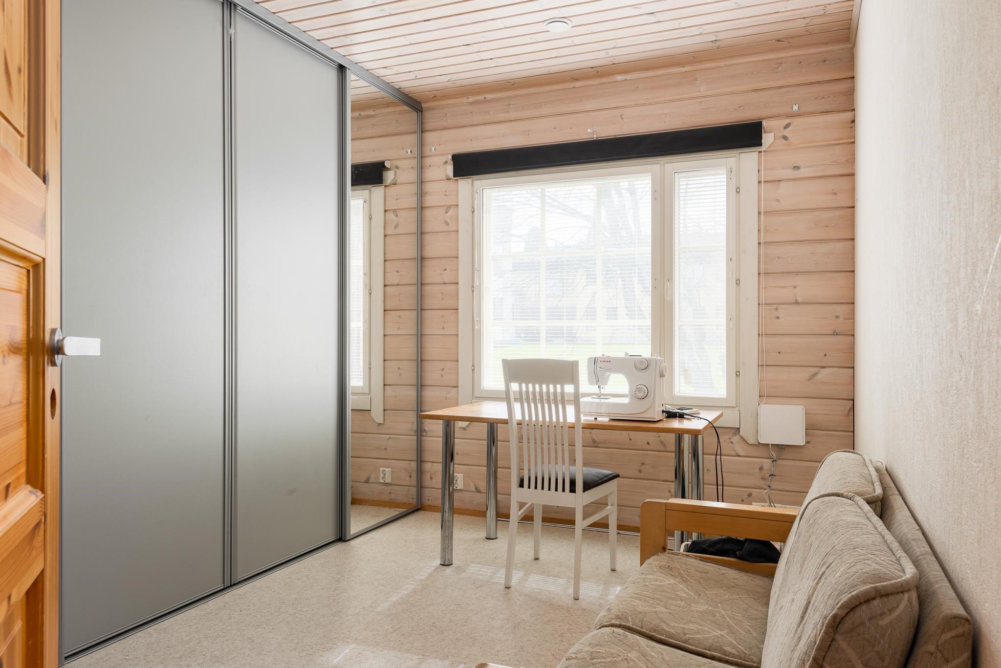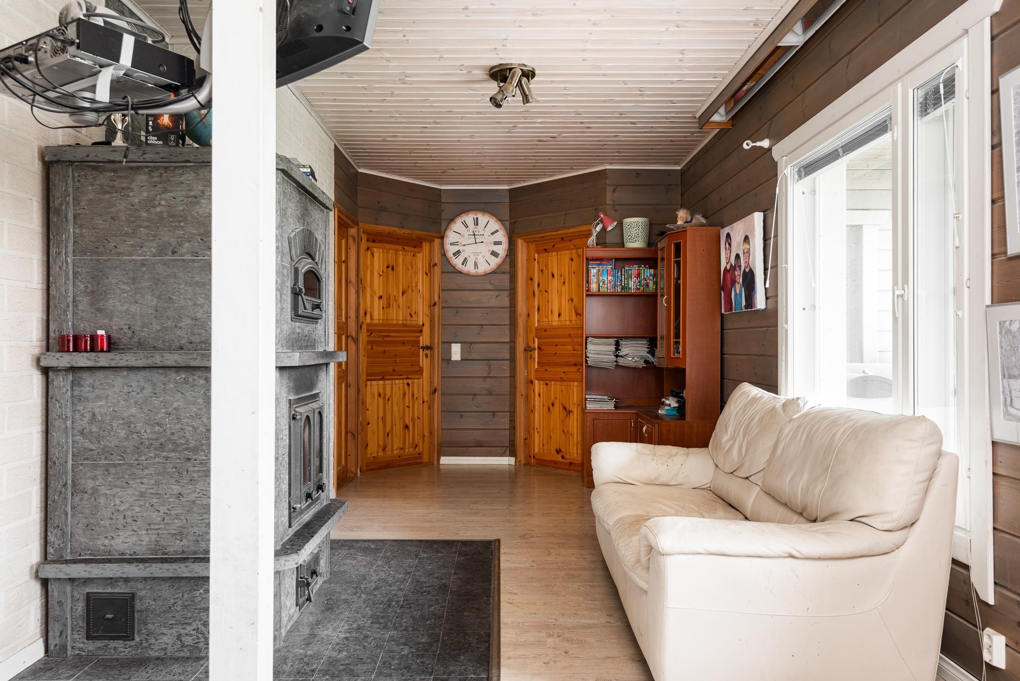 Keittiö: muovimatto, kaakeli/teräs, paneeli. Olohuone: laminaatti, hirsipaneeli. Makuuhuone 1: muovimatto, tapetti/hirsipaneeli. Makuuhuone 2: muovimatto, lasikuitutapetti. Makuuhuone 3: muovimatto. Kodinhoitohuone: kaakeli. Sauna: laatta, paneeli. Kylpyhuone: kaakeli. Eteinen: muovimatto, hirsipaneeli. Wc: kaakeli.