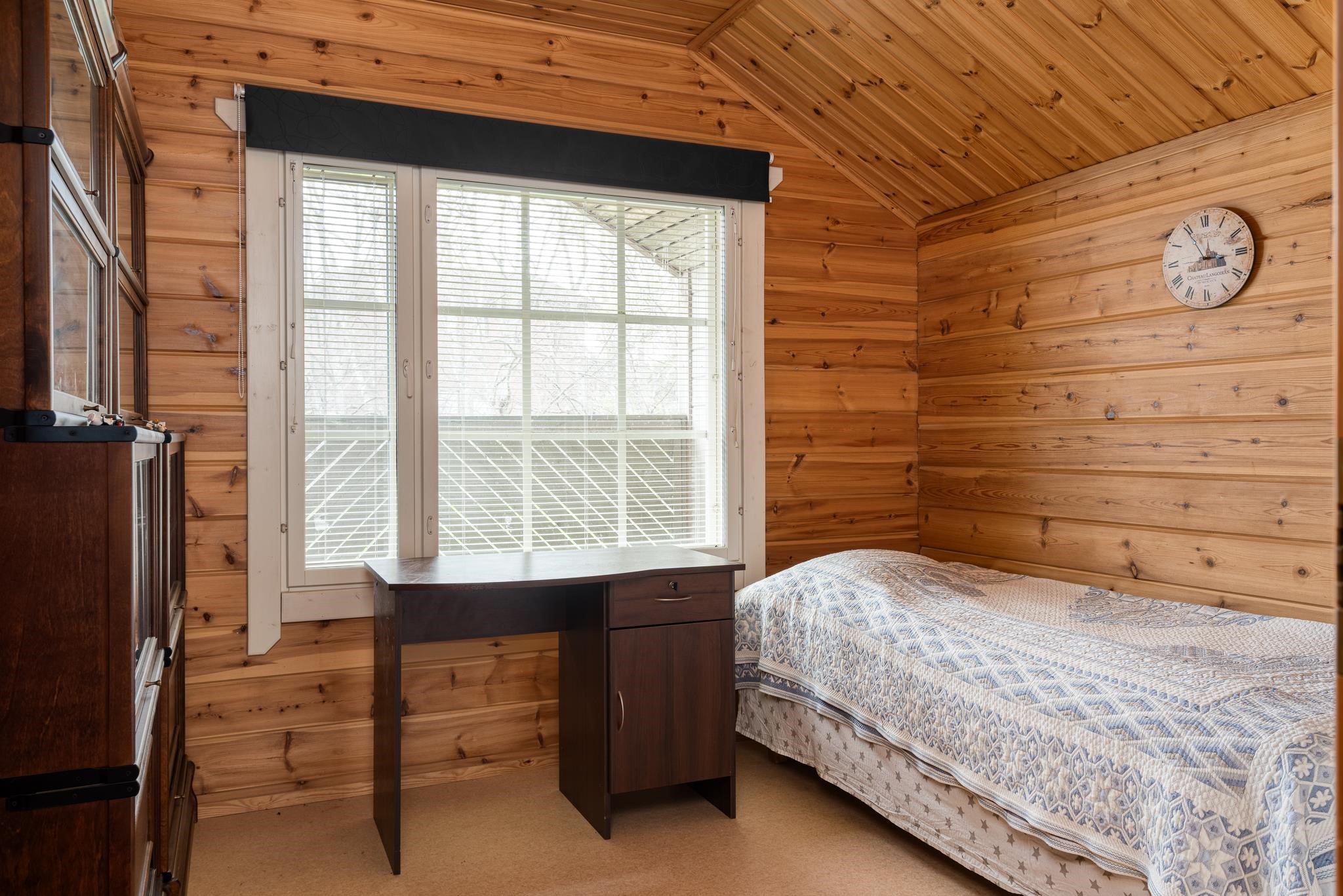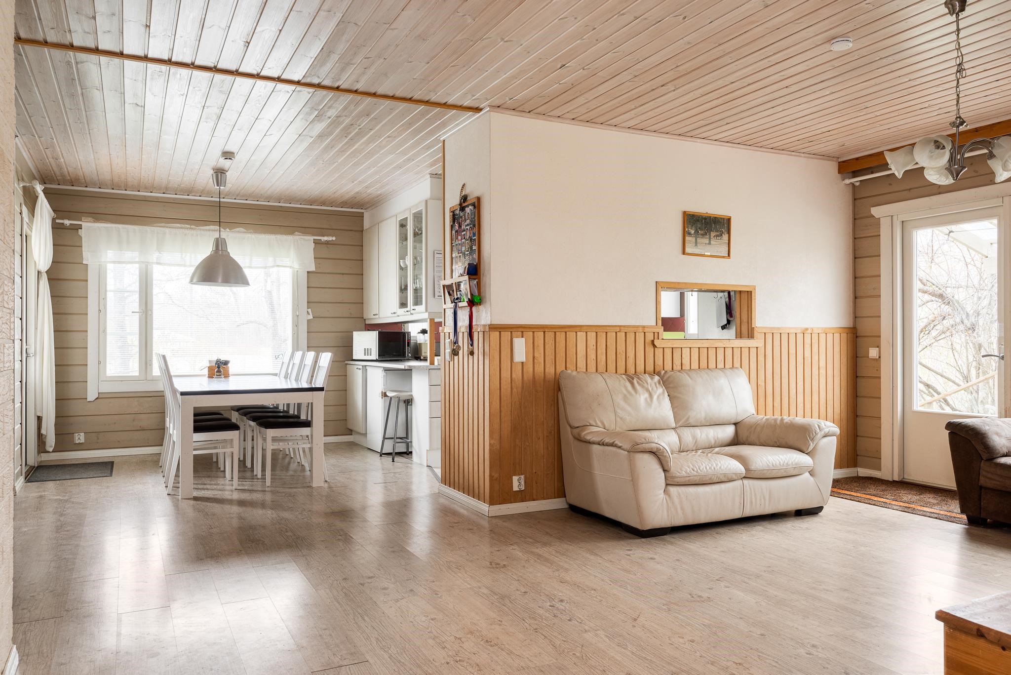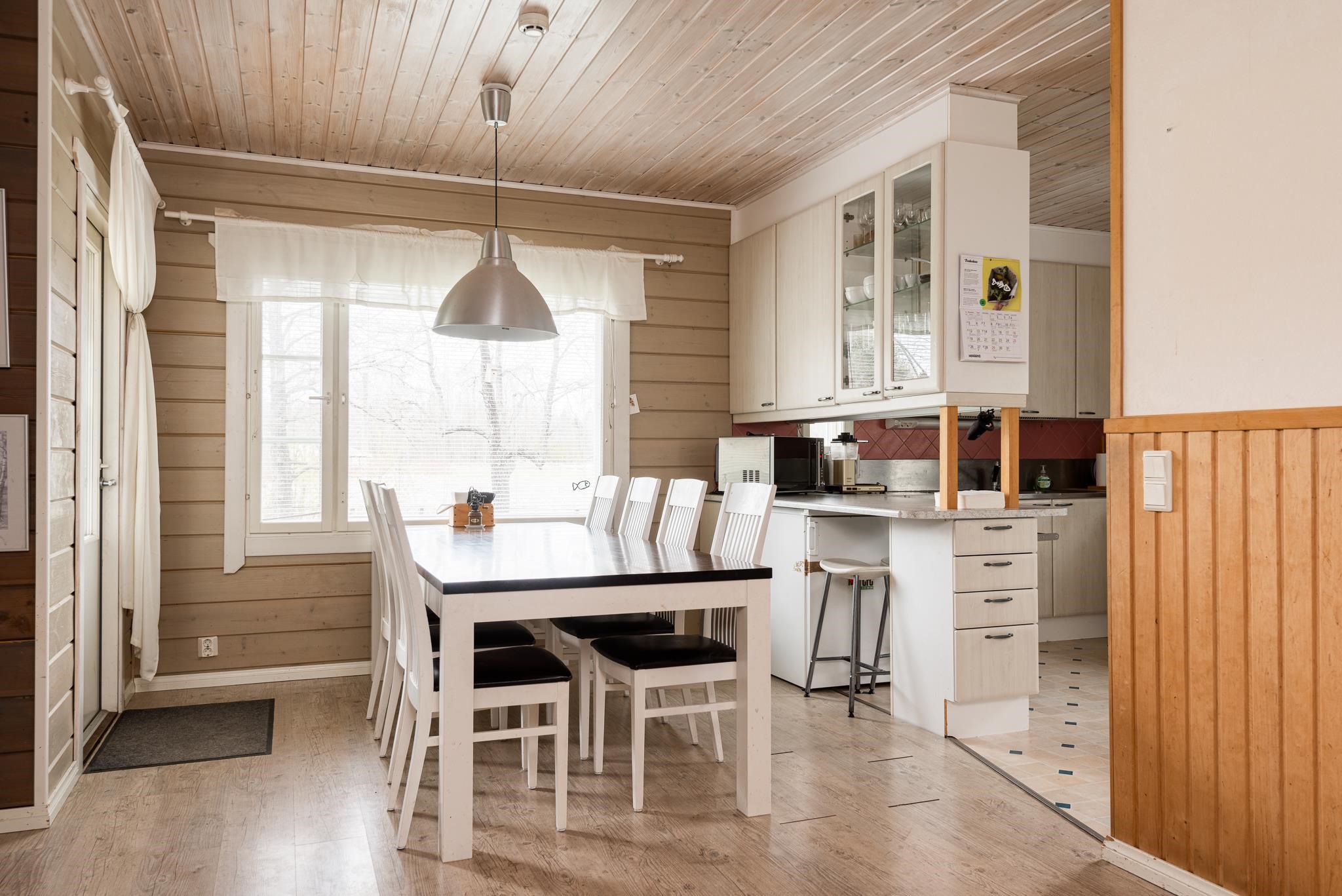 Keittiö: muovimatto, kaakeli/teräs, paneeli. Olohuone: laminaatti, hirsipaneeli. Makuuhuone 1: muovimatto, tapetti/hirsipaneeli. Makuuhuone 2: muovimatto, lasikuitutapetti. Makuuhuone 3: muovimatto. Kodinhoitohuone: kaakeli. Sauna: laatta, paneeli. Kylpyhuone: kaakeli. Eteinen: muovimatto, hirsipaneeli. Wc: kaakeli.