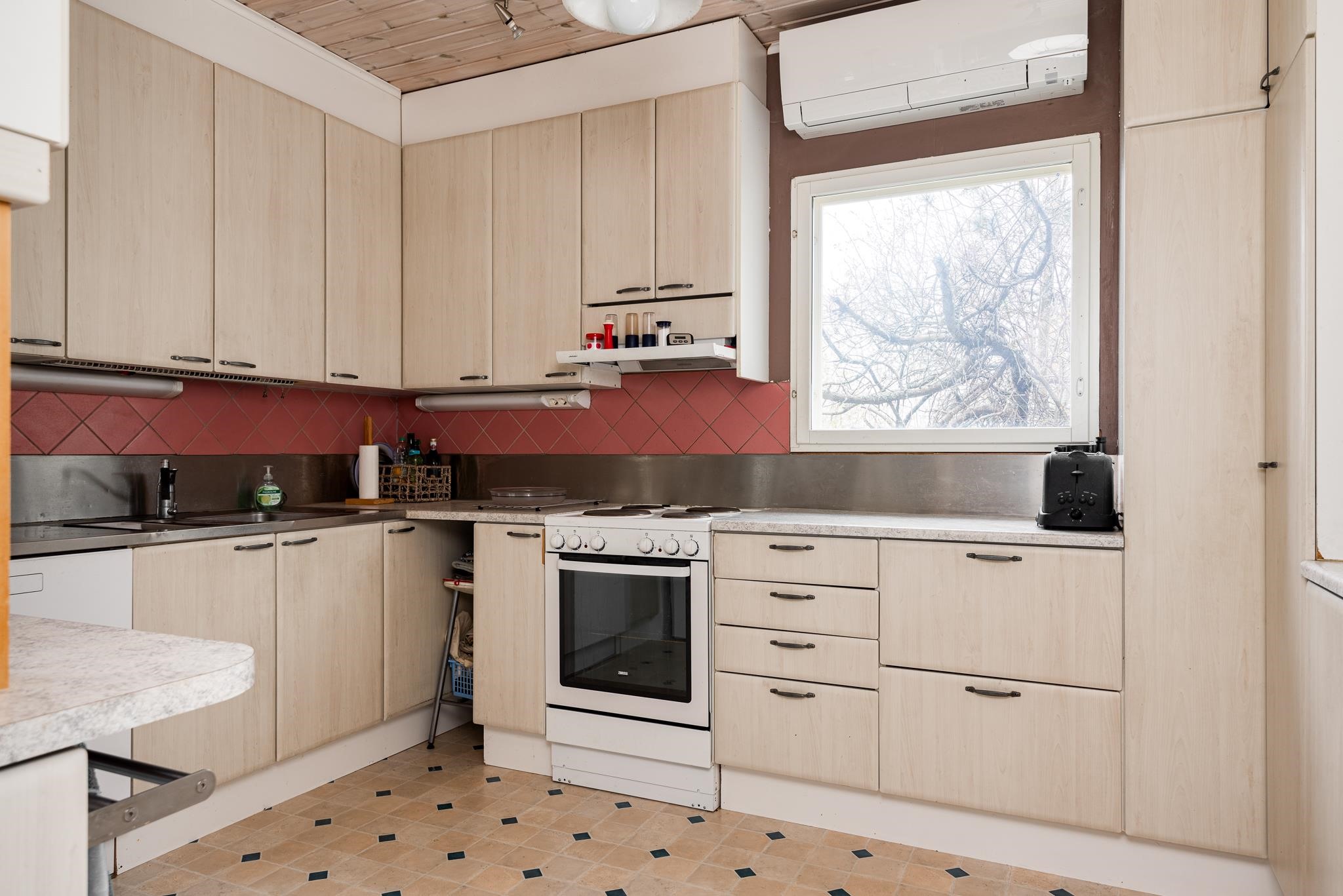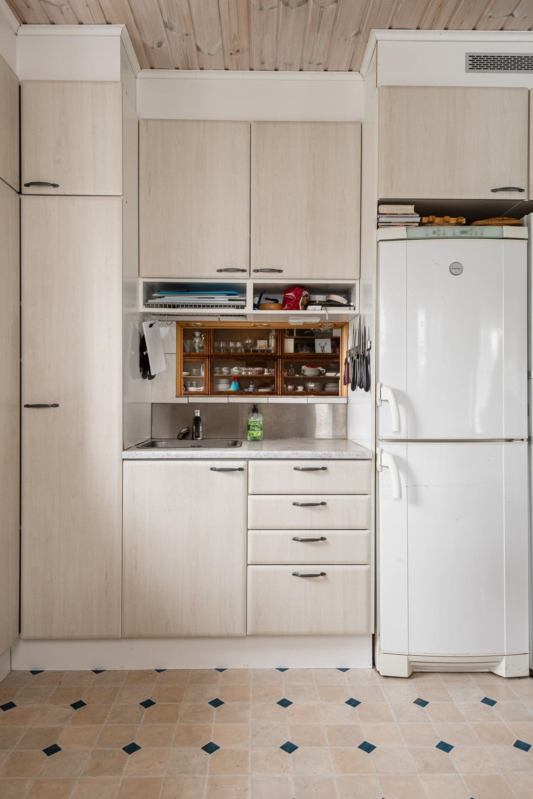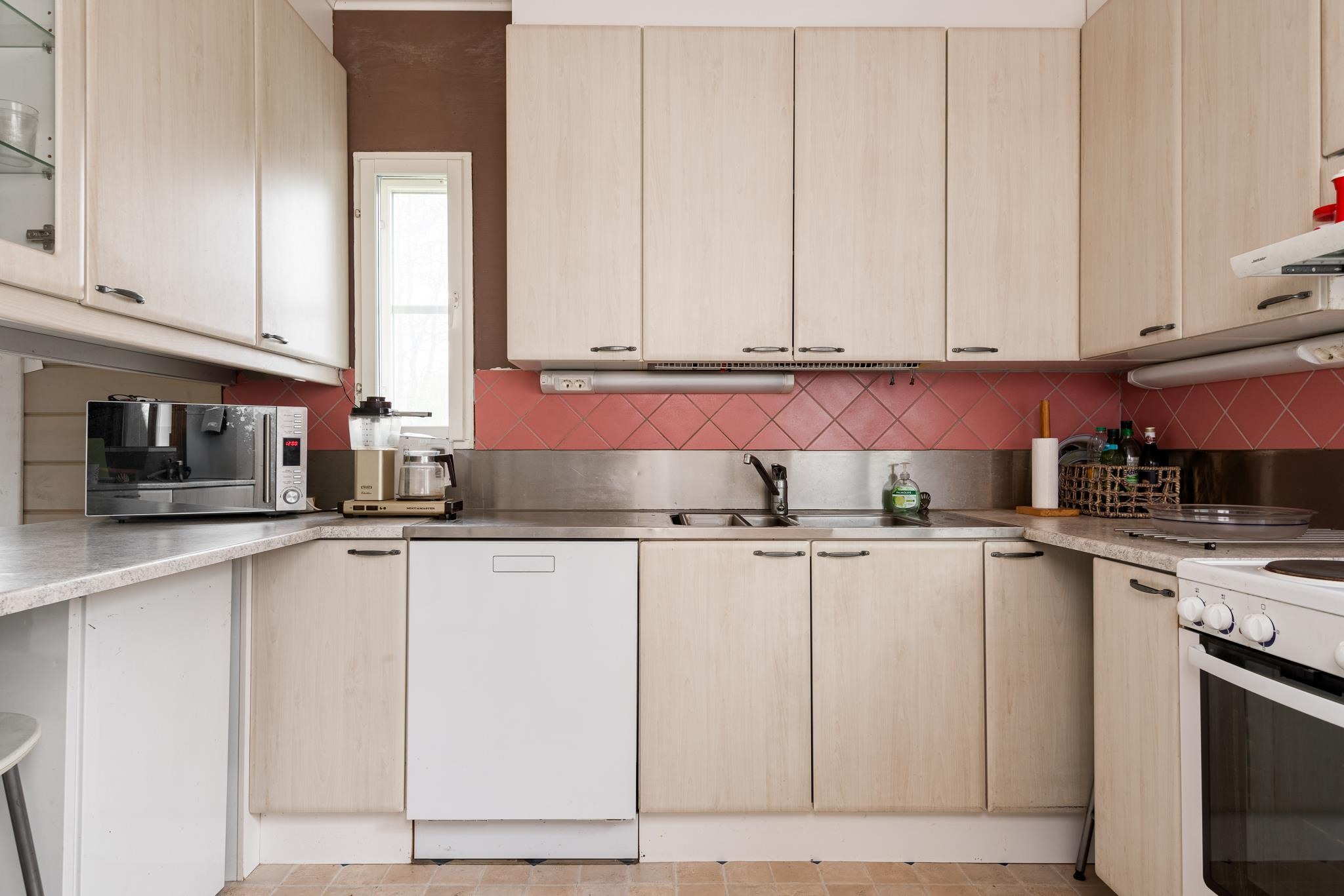 - Jääviileäkaappi, jääkaappipakastin, sähköliesi, liesituuletin, leivinuuni, astianpesukone, kaapistot, irralliset kaapistot, kiinteät valaisimet.