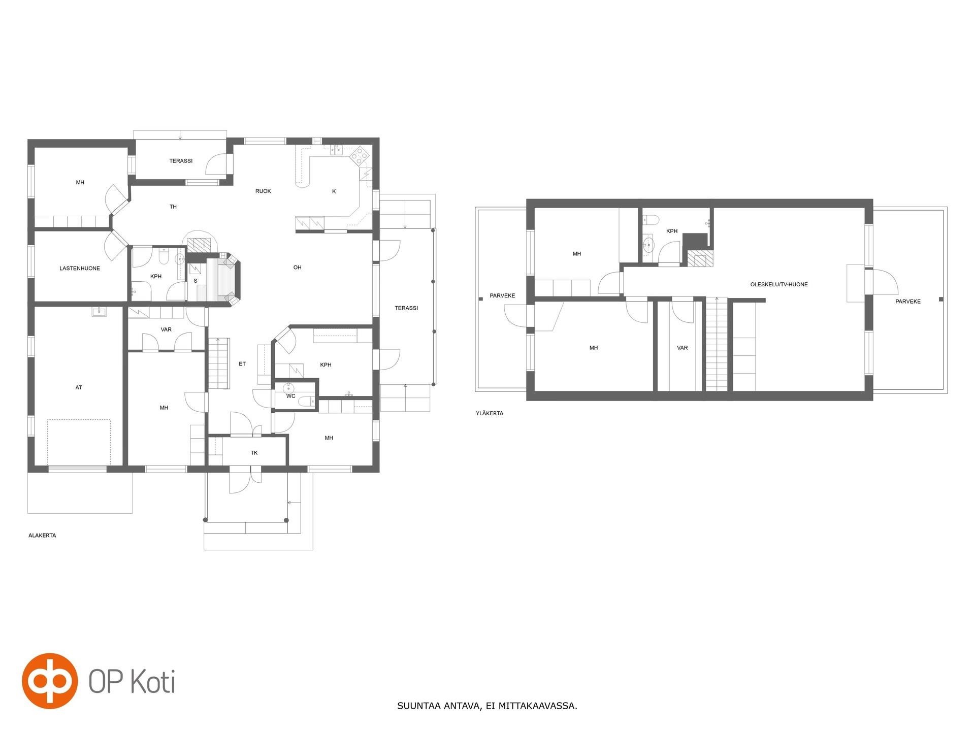 - 370 m2alakerta:4 huonetta, takkahuone, keittiö, ruokailutila, olohuone, khh,varasto,vah,autotalli, s,ph yläkerta:3 huonetta, oleskelutila, kph, varasto