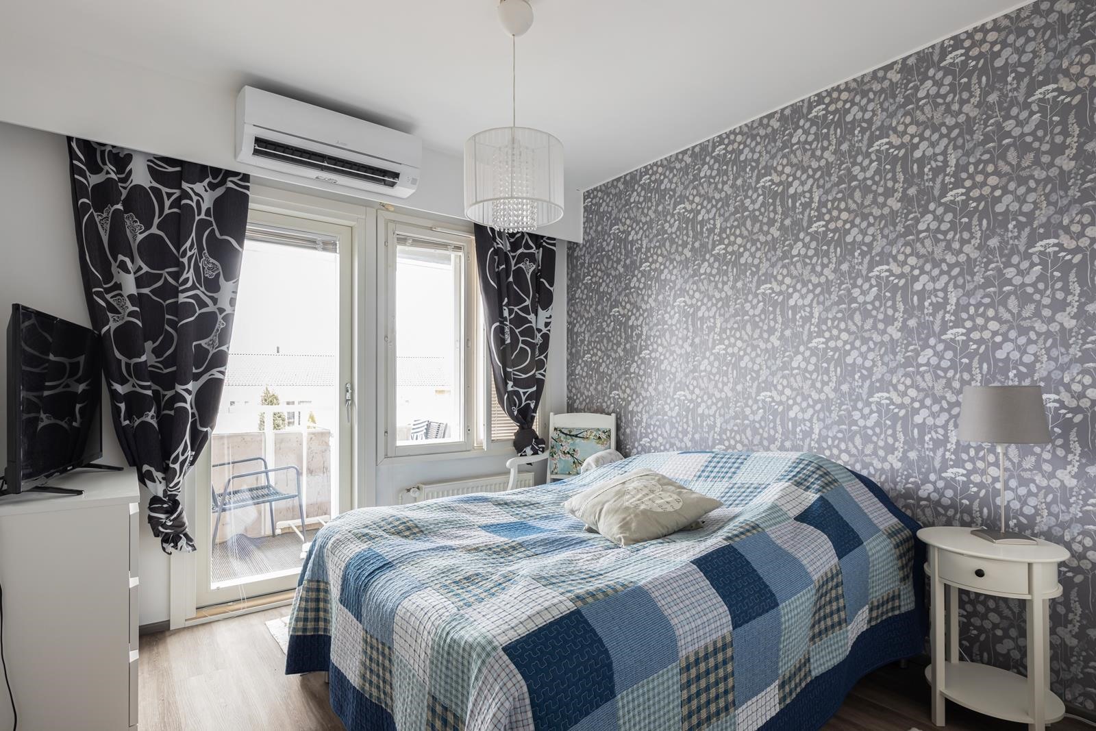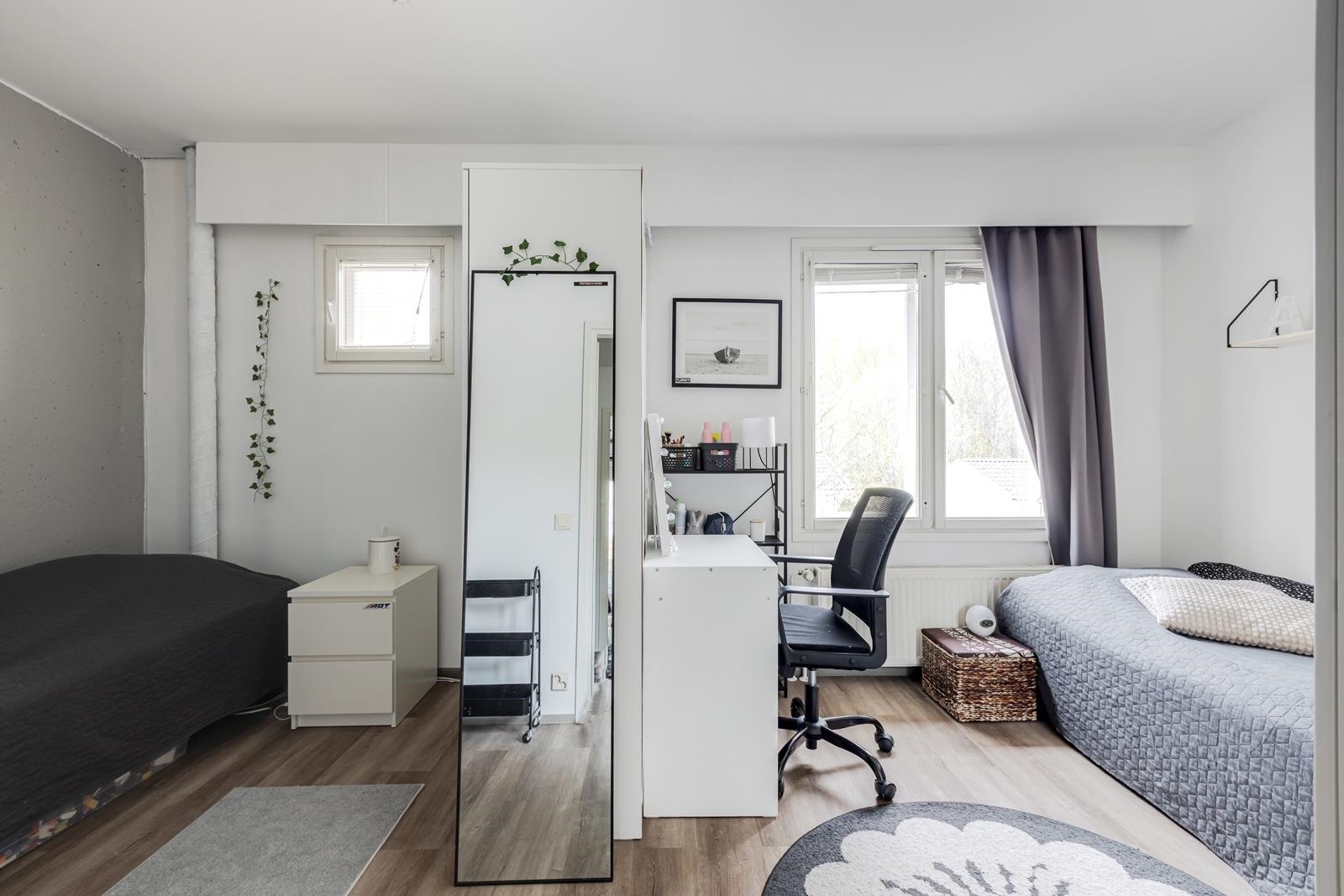 Keittiö: seinät maalattu, lattia laminaattia. Olohuone: seinät maalattu, lattia laminaattia. Makuuhuone 1: seinät maalattu, lattia vinyylilankkua. Makuuhuone 2: seinät maalattu, lattia vinyylilankkua. Sauna: seinät paneloitu, lattia laatoitettu. Kylpyhuone: laatoitettu.