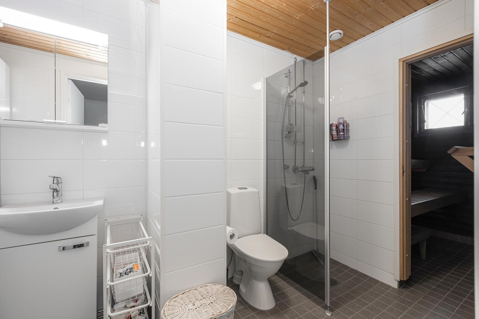 - Sauna, sähkökiuas, kylpyhuone, erillinen wc wc-istuin myös kylpyhuoneessa, suihku, suihkuseinä, peilikaappi, kaapit, pesukoneliitäntä, lattialämmitys kph:ssa sähköinen, kiinteät valaisimet.