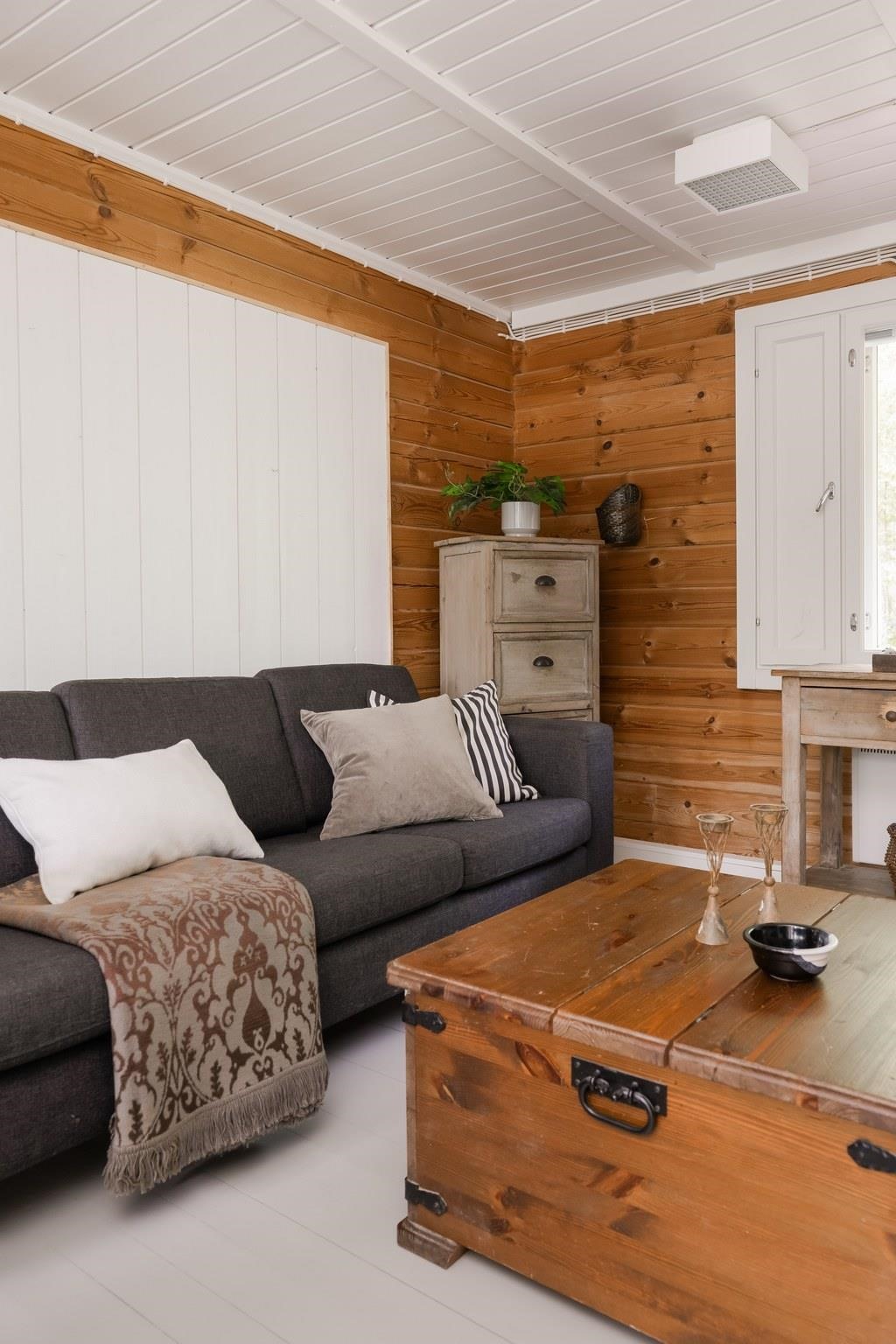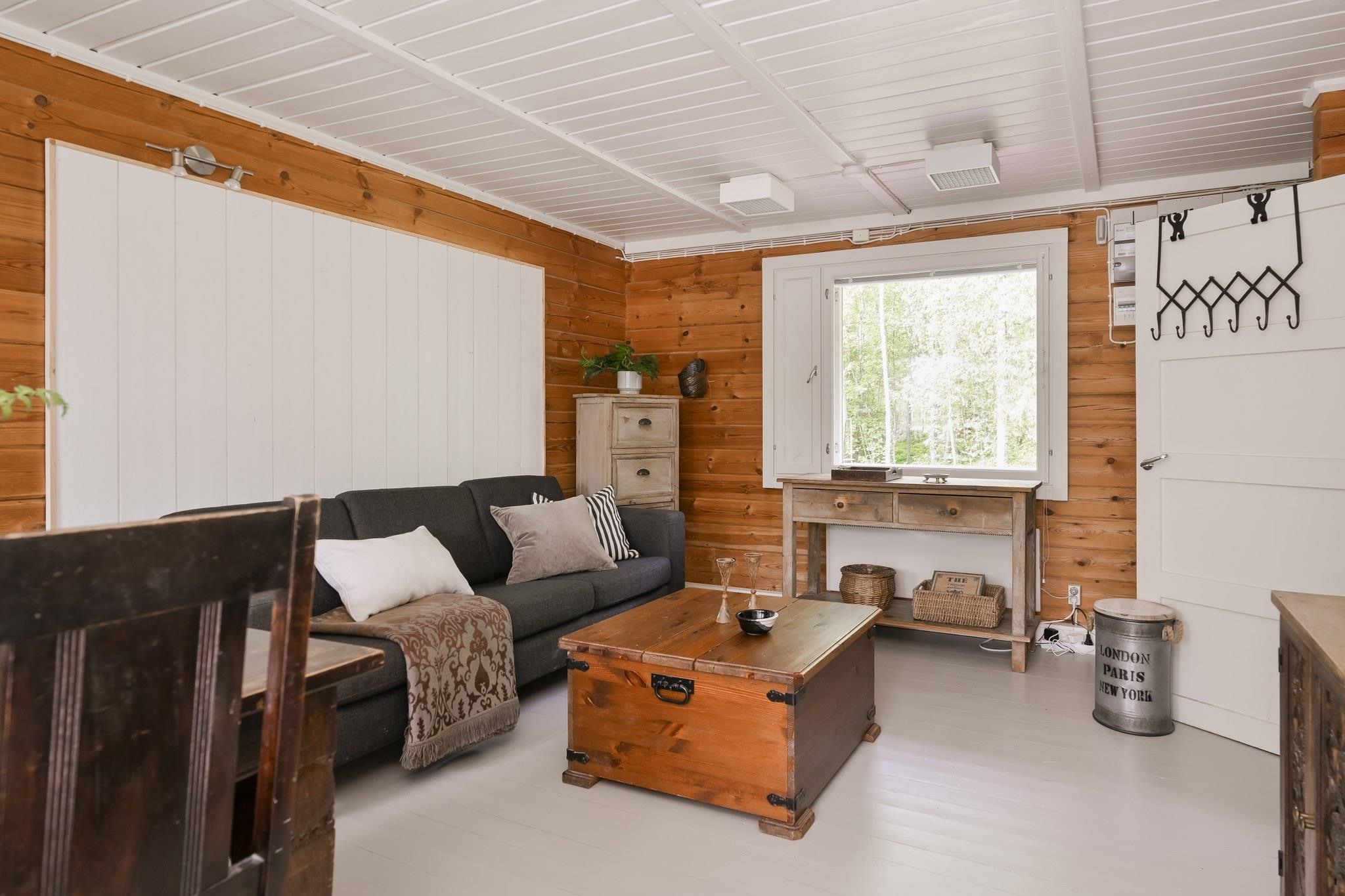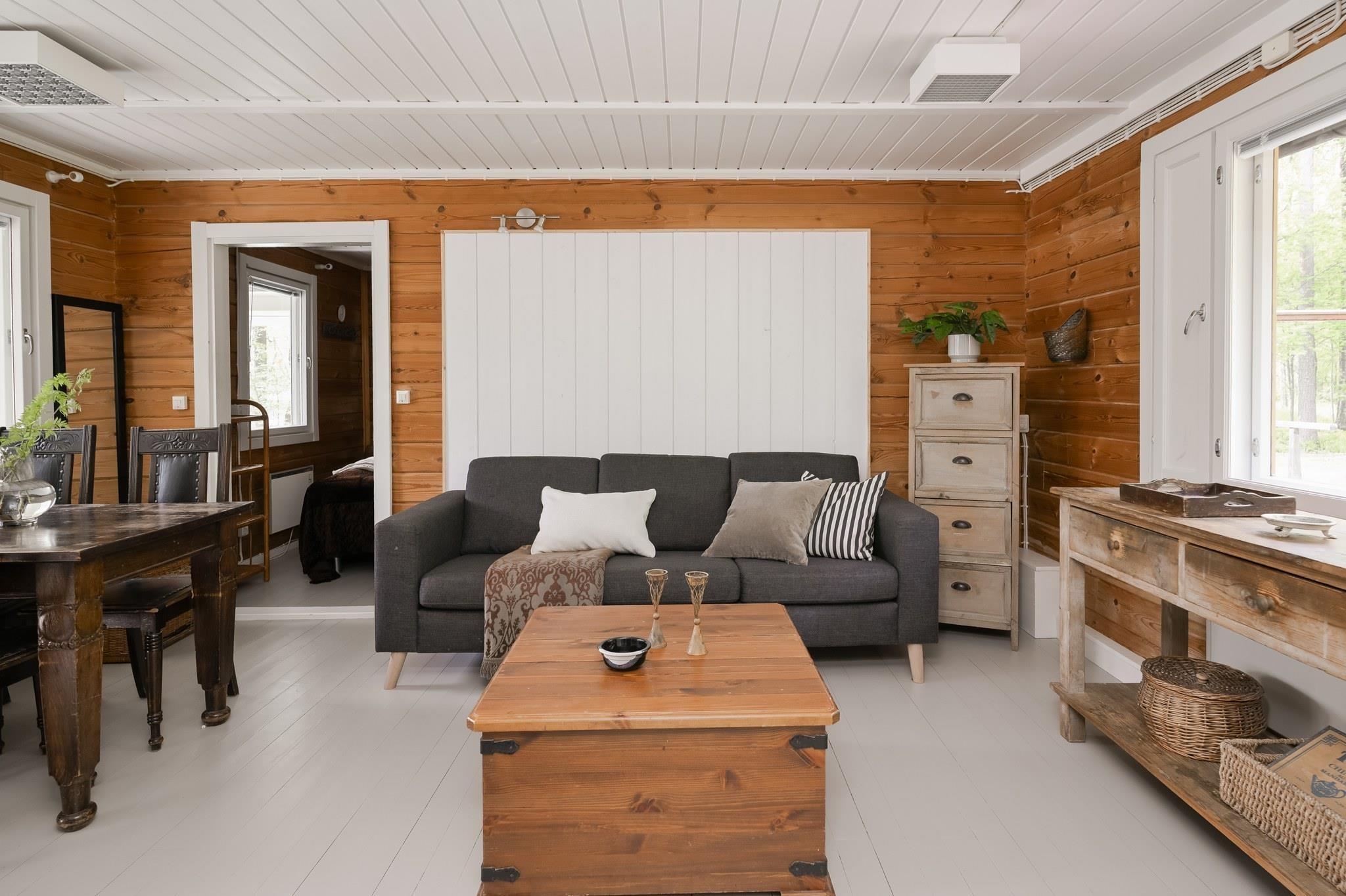 Keittiö: Seinät hirsi / lattia puu. Olohuone: Seinät hirsi / lattia puu. Makuuhuone 1: Seinät hirsi / lattia puu. Kylpyhuone: Seinät laatta / lattia laatta.