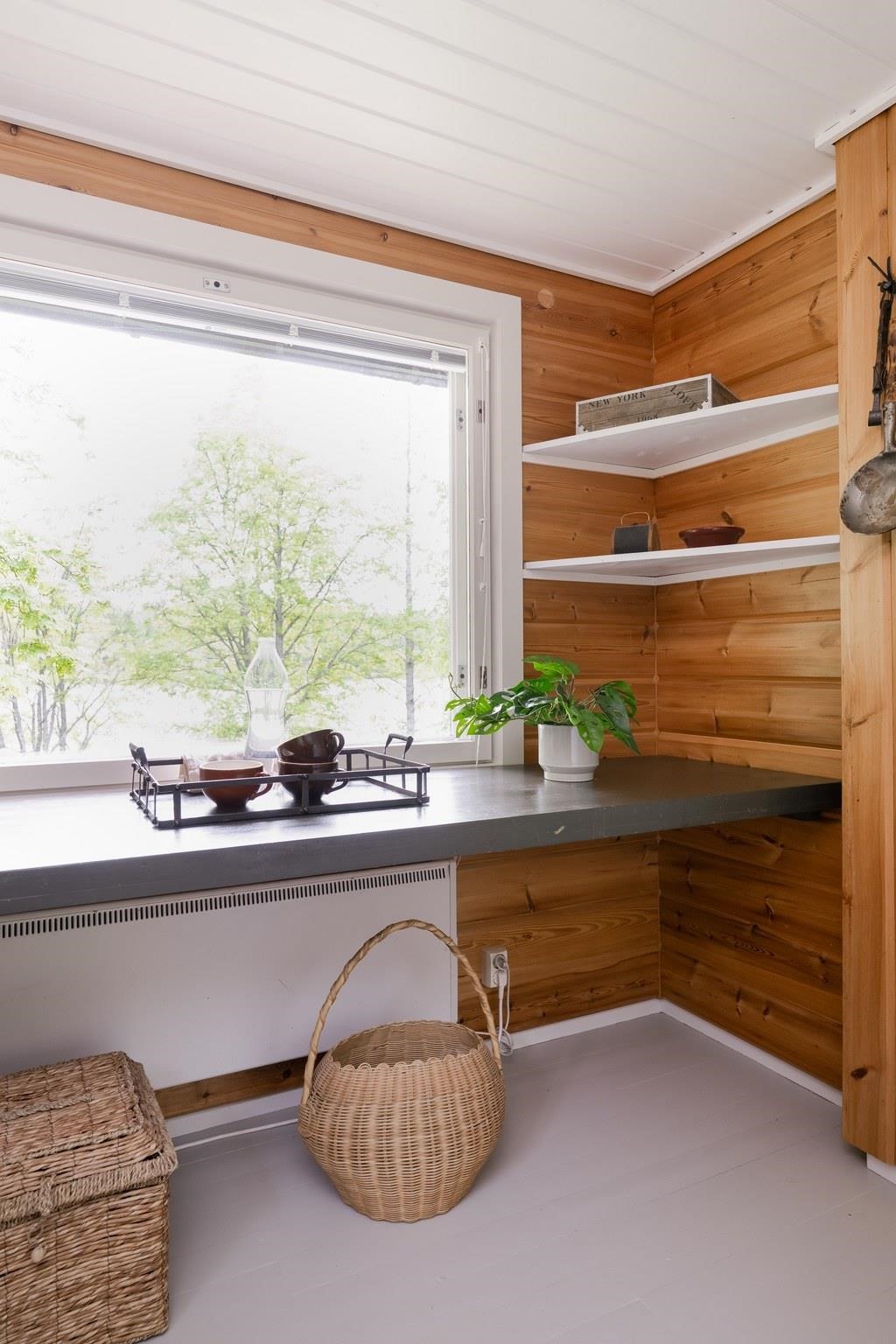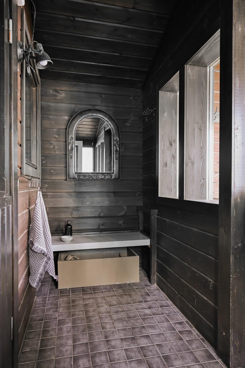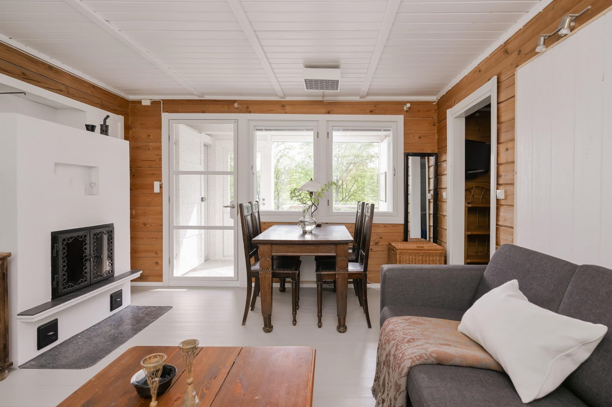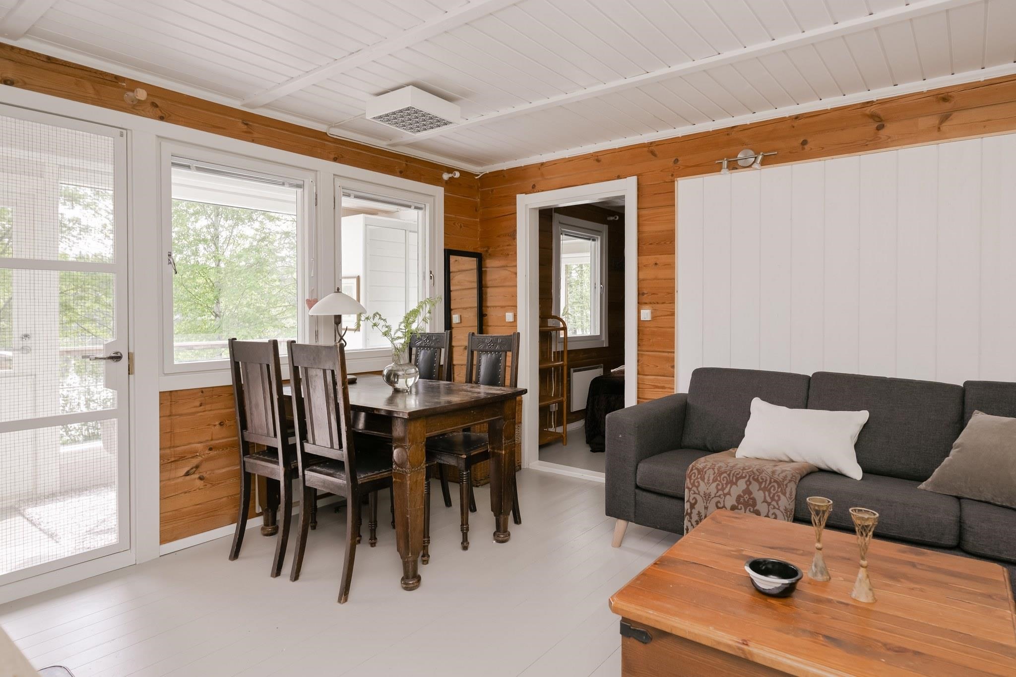 Keittiö: Seinät hirsi / lattia puu. Olohuone: Seinät hirsi / lattia puu. Makuuhuone 1: Seinät hirsi / lattia puu. Kylpyhuone: Seinät laatta / lattia laatta.