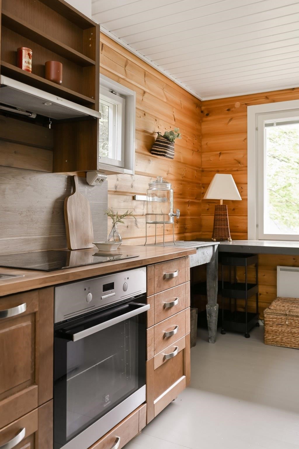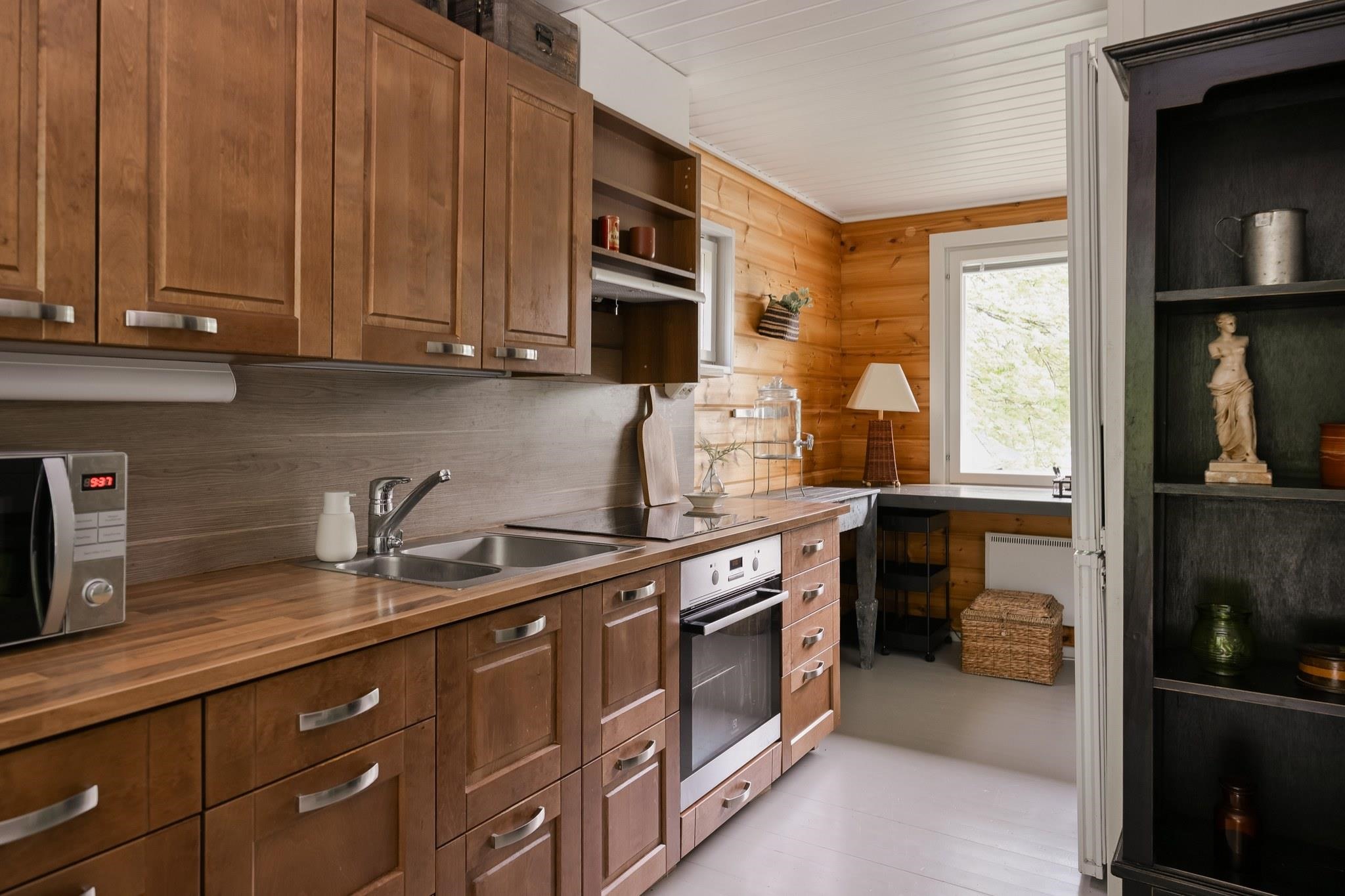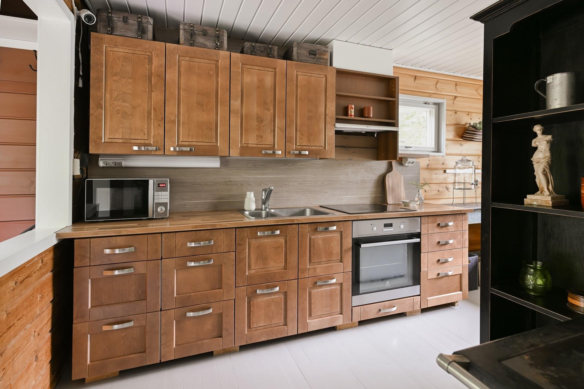 - Jääkaappipakastin, induktioliesi, liesituuletin, mikroaaltouuni, kaapistot. Uuni , Puuhella
