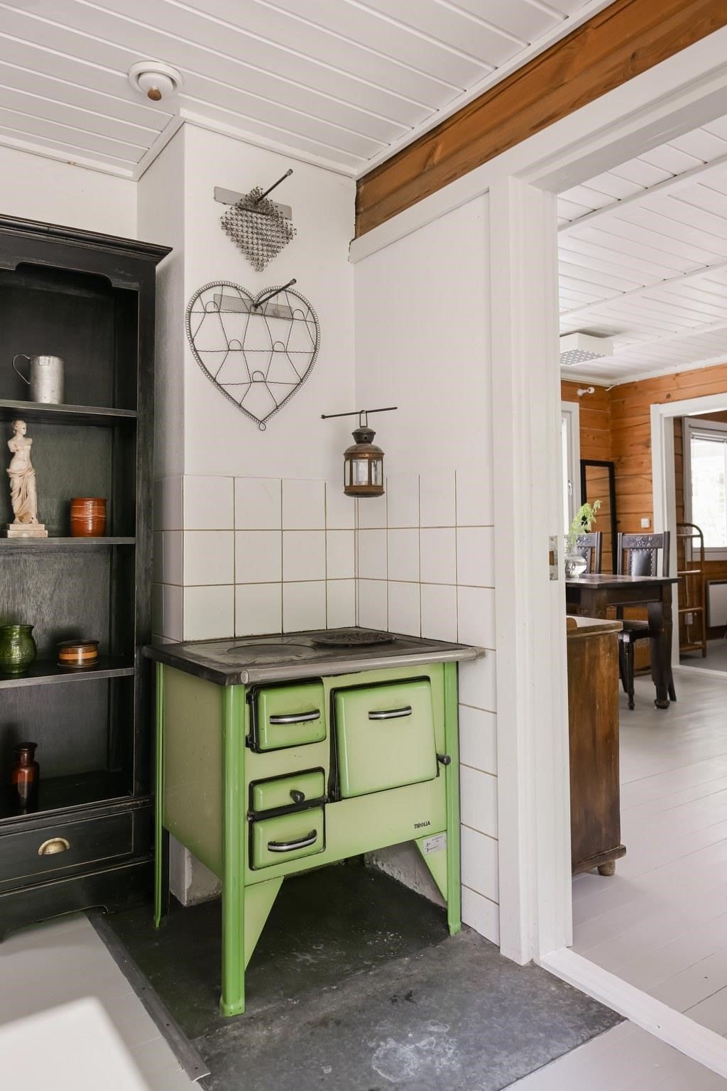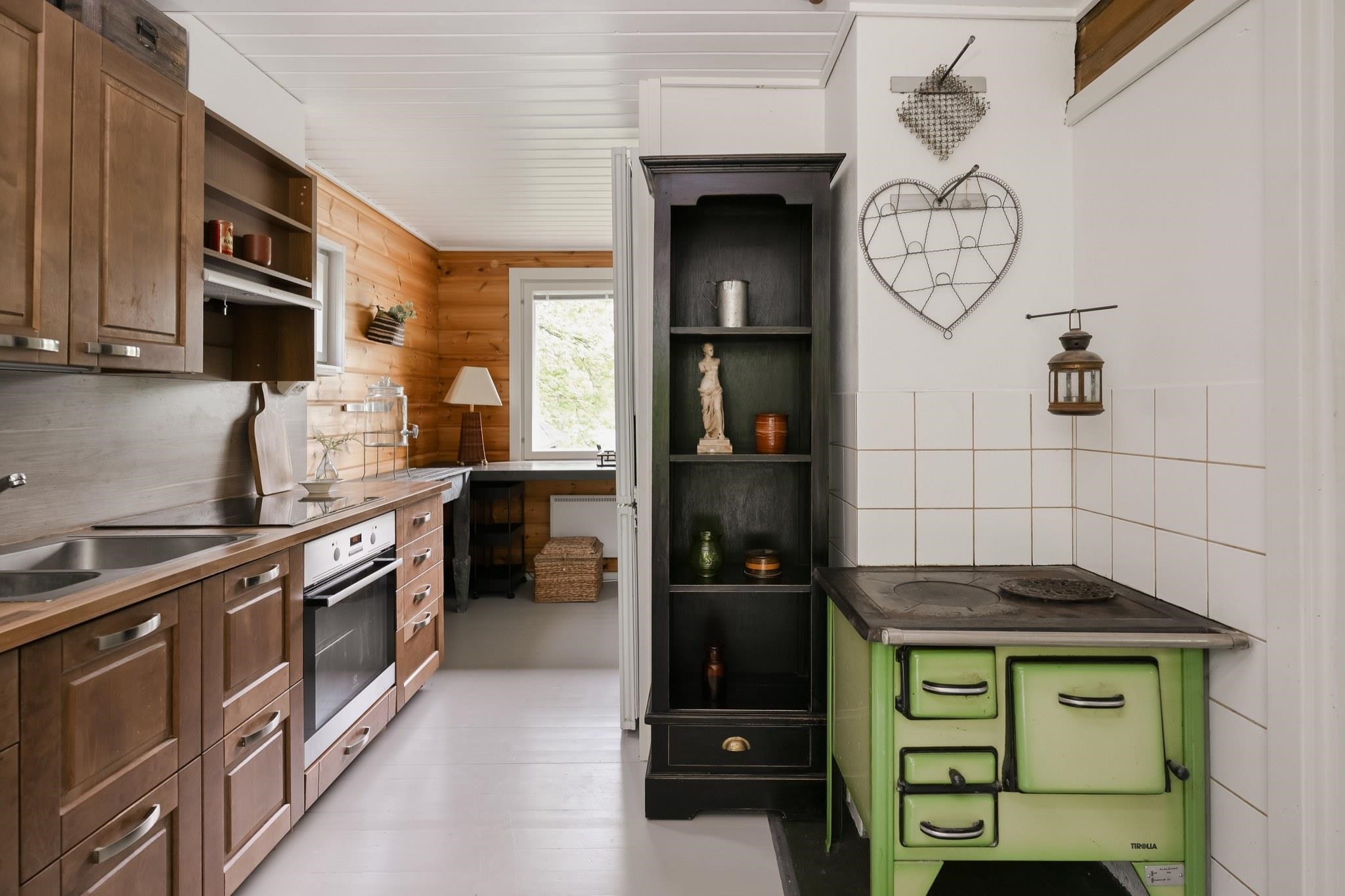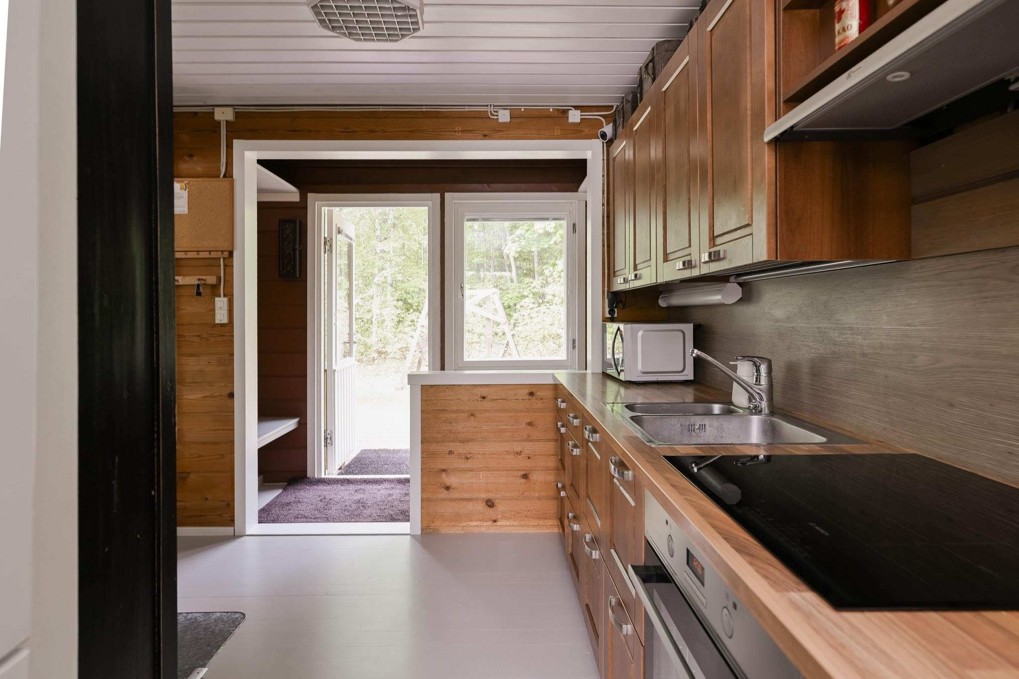 - Jääkaappipakastin, induktioliesi, liesituuletin, mikroaaltouuni, kaapistot. Uuni , Puuhella