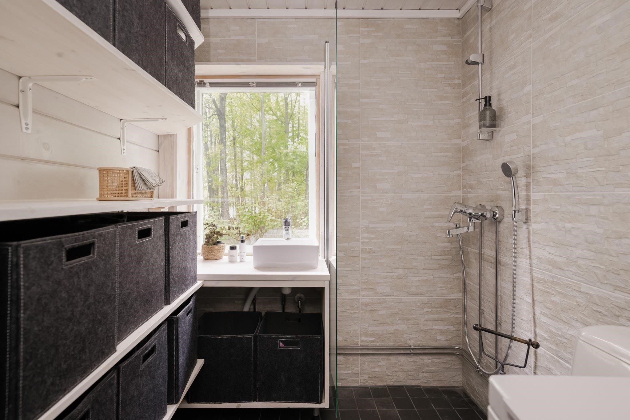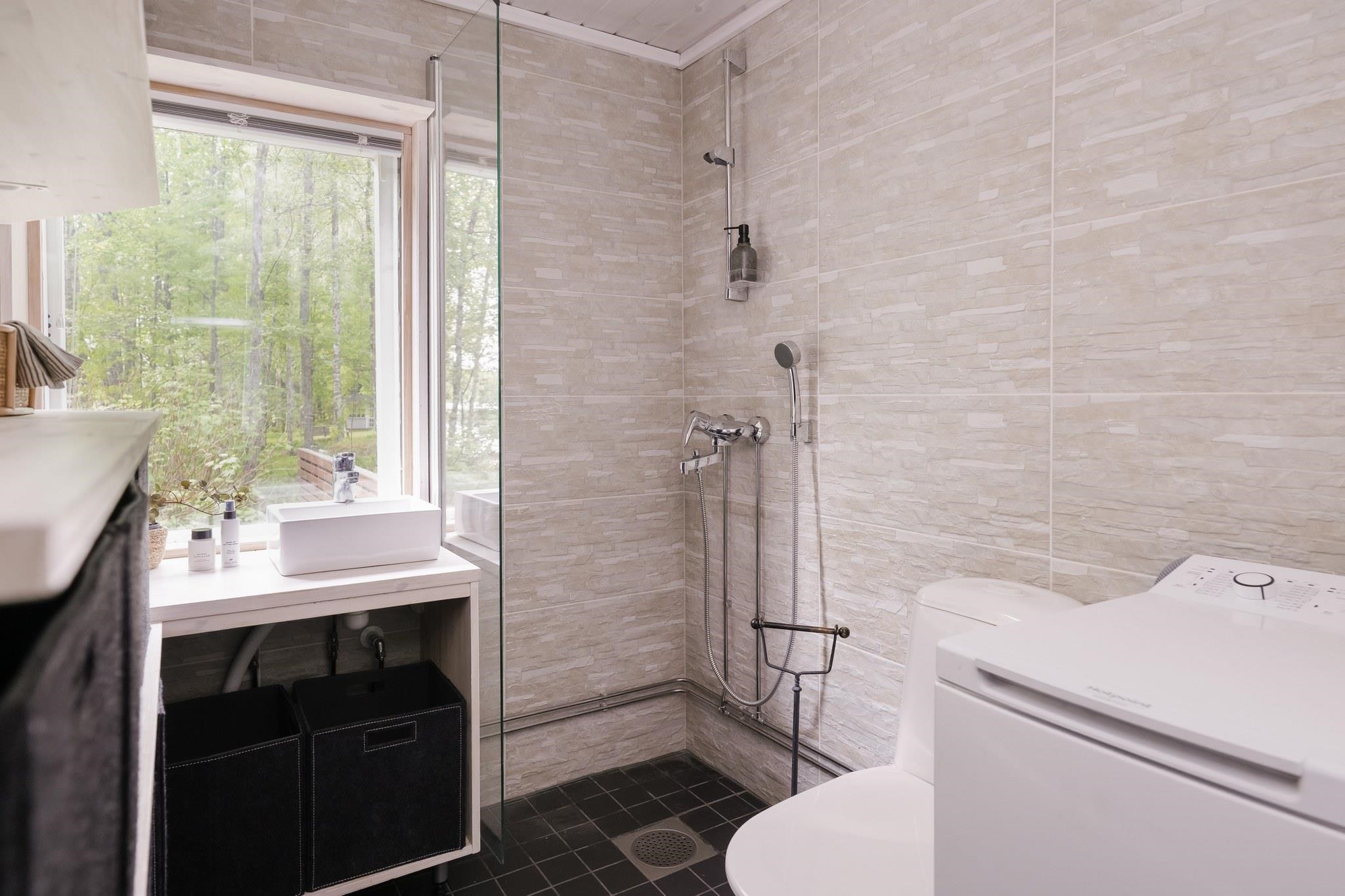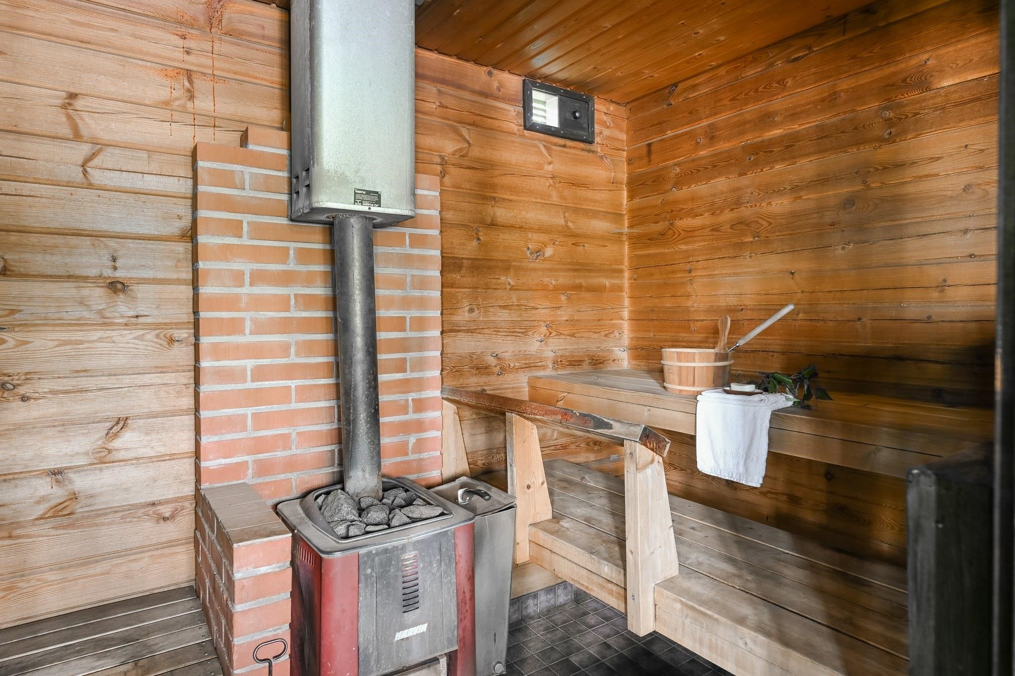 - Sauna (rantasauna), puukiuas (rantasaunassa), kylpyhuone, suihku, suihkuseinä, allaskaappi, pesukoneliitäntä, lattialämmitys (kylpyhuoneessa). Lämminvesivaraaja