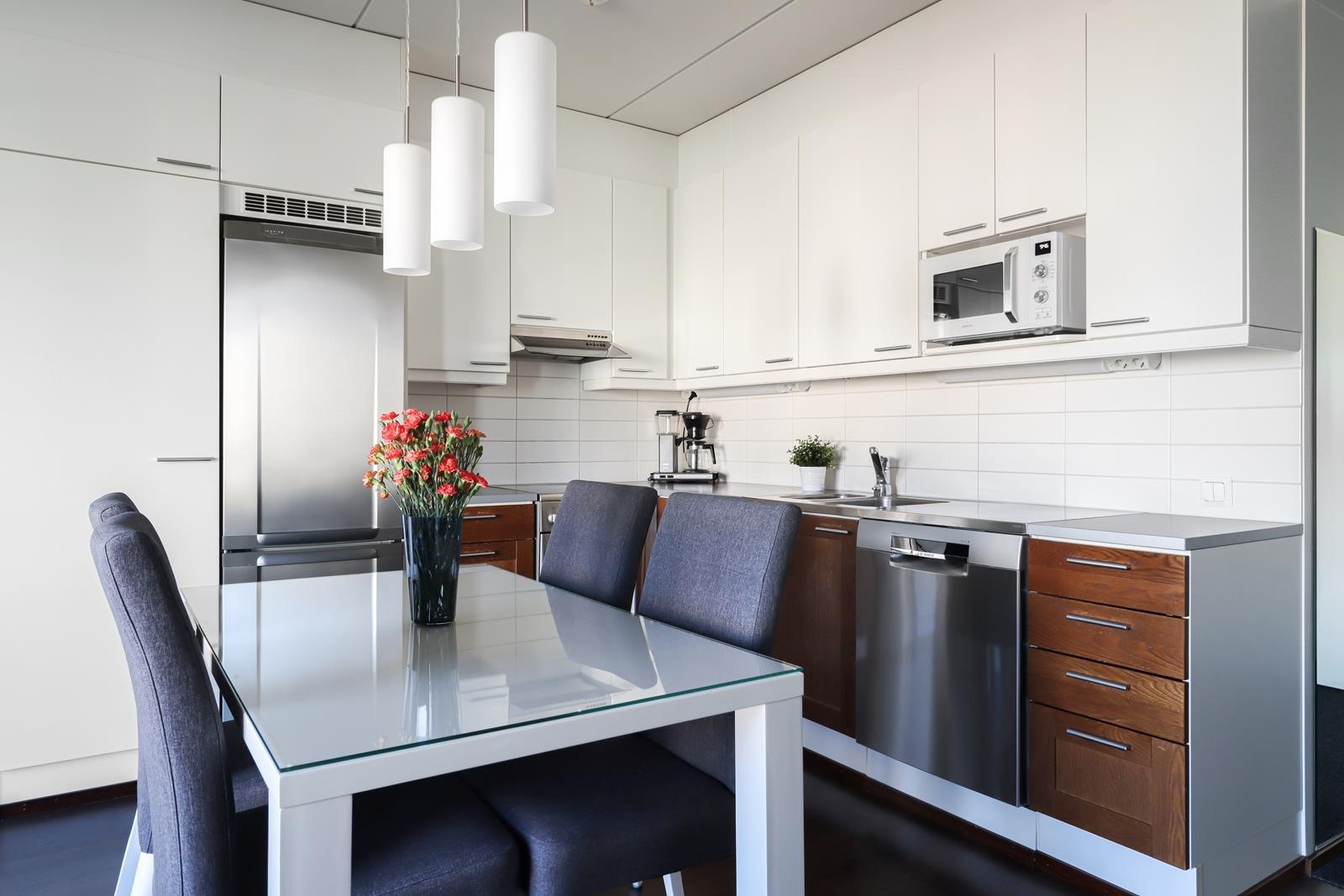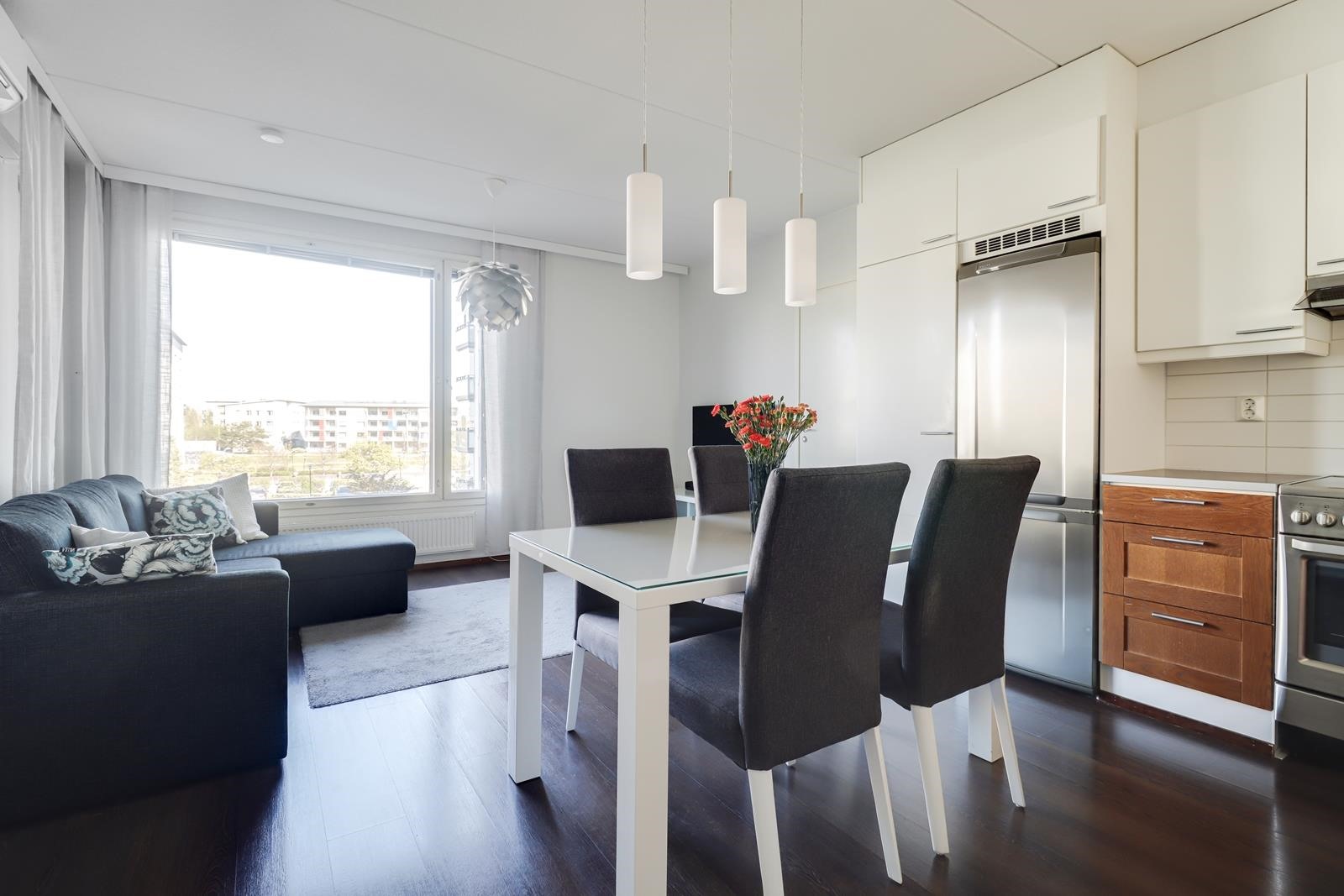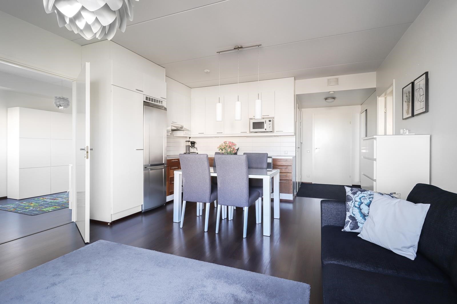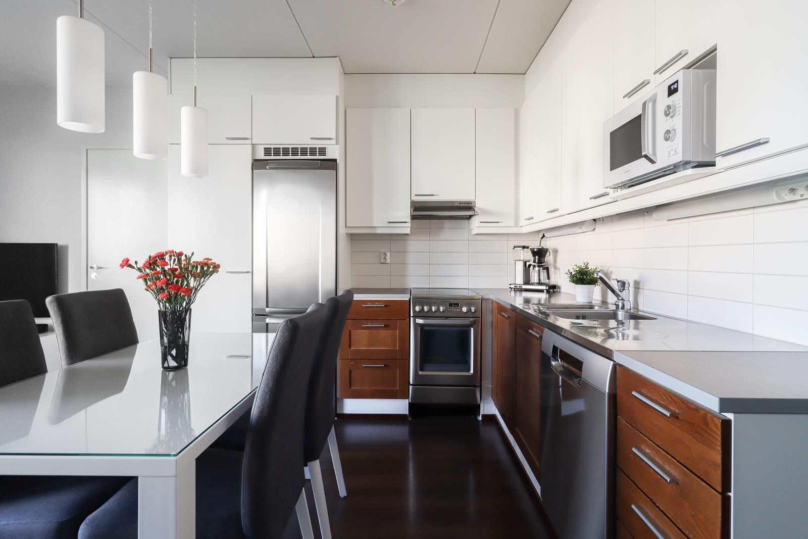 - Toimiva ja hyvin varusteltu avokeittiö. Avokeittiöstä löytyy kaikki tarvittava arjen sujuvuuteen: jääkaappipakastin, keraaminen lattialiesi, liesituuletin, joka tehostaa ilmanvaihtoa, sekä astianpesukone (uusittu 2023). Säilytystilaa tarjoavat käytännölliset kaapistot, ja kiinteät valaisimet tuovat keittiöön hyvän yleisvalaistuksen.